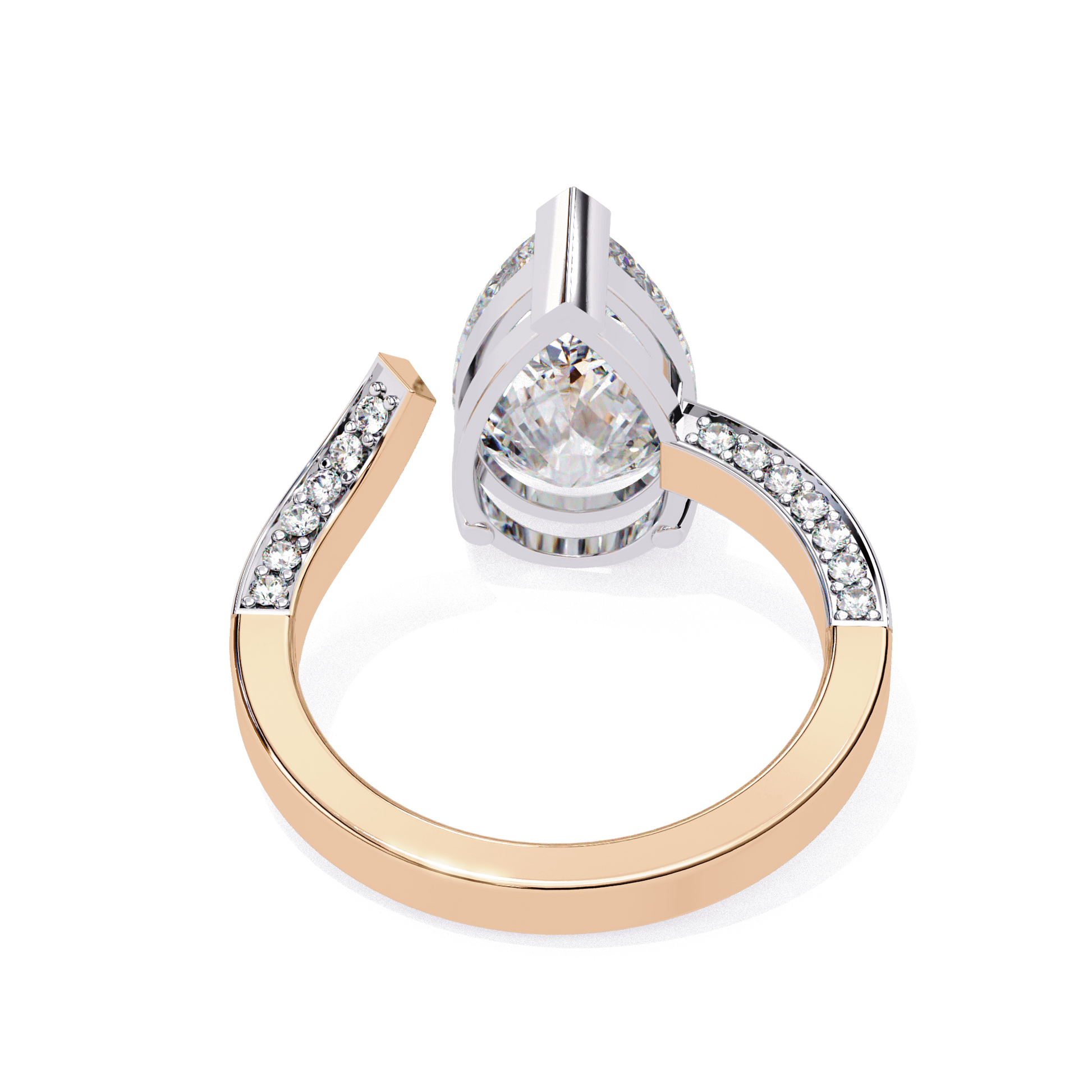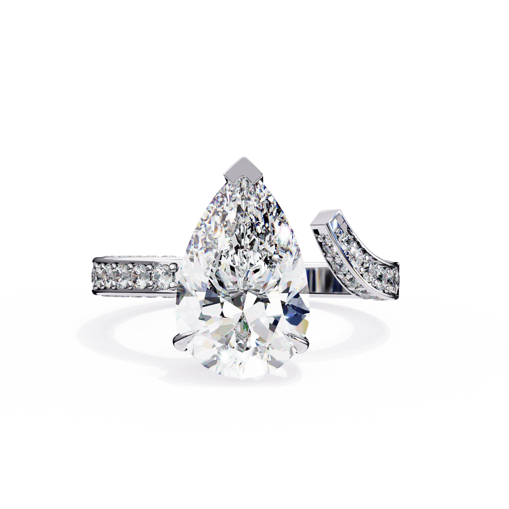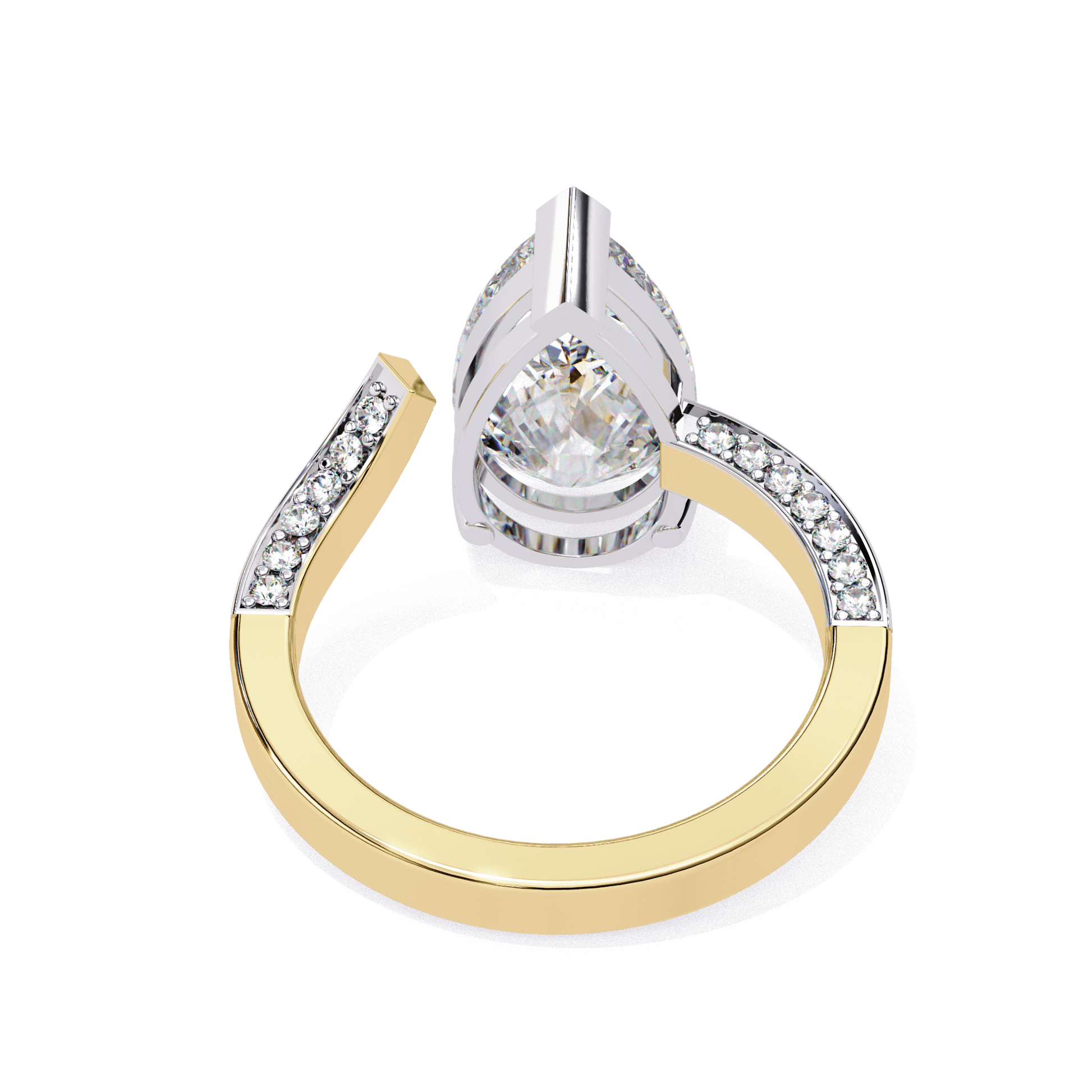 Aria is a masterpiece of elegance and architectural beauty. At its heart, a pear-cut diamond is secured in a delicate 3-claw basket setting, with a V-prong at the point for added protection. The open split shank design adds a sense of airiness and modern sophistication, drawing the eye toward the center stone.
