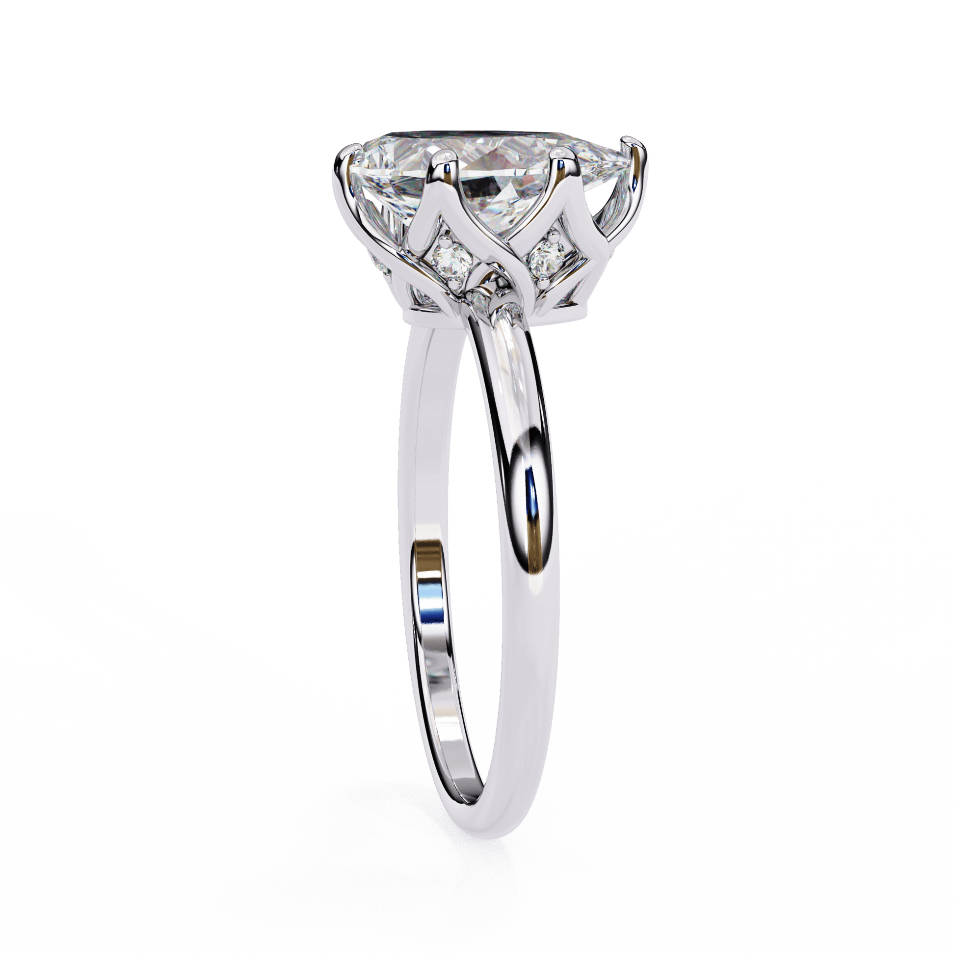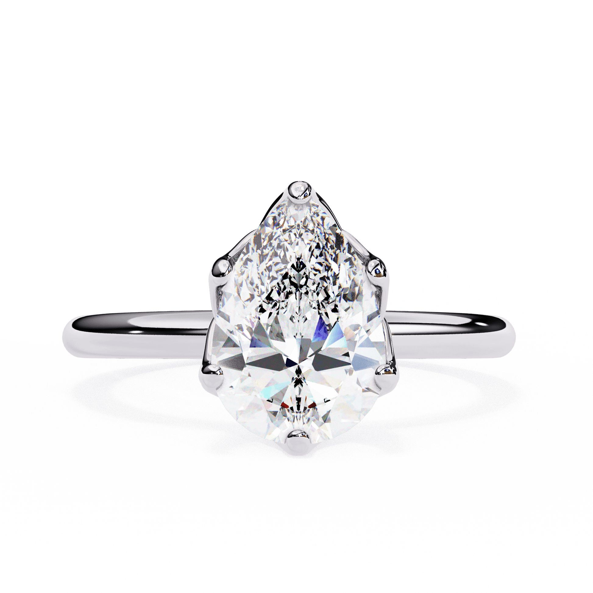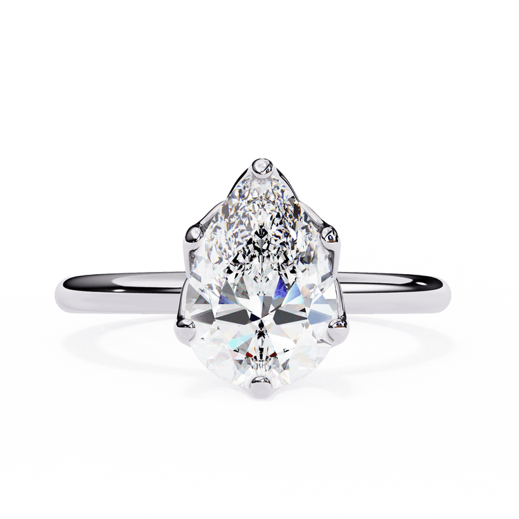 Aveline features an Pear-cut center stone in a flush tulip setting, creating a smooth, seamless silhouette. Delicate diamond accents nestle within the tulip prongs, adding a subtle touch of brilliance. The refined design balances modern minimalism with intricate detailing, making it effortlessly elegant.