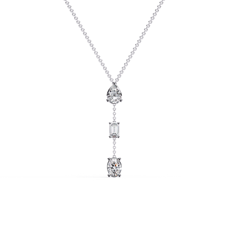Azar is an elegant celebration of contrast and symmetry. Featuring three distinct solitaire diamonds — a pear-cut, an emerald-cut, and an oval-cut — suspended gracefully in a vertical drop, each stone is secured in a refined basket setting that allows maximum light play. The delicate drop design offers fluidity, while the trio of cuts adds dimension and modern charm. Perfect as a statement piece or layered for a sophisticated stack.