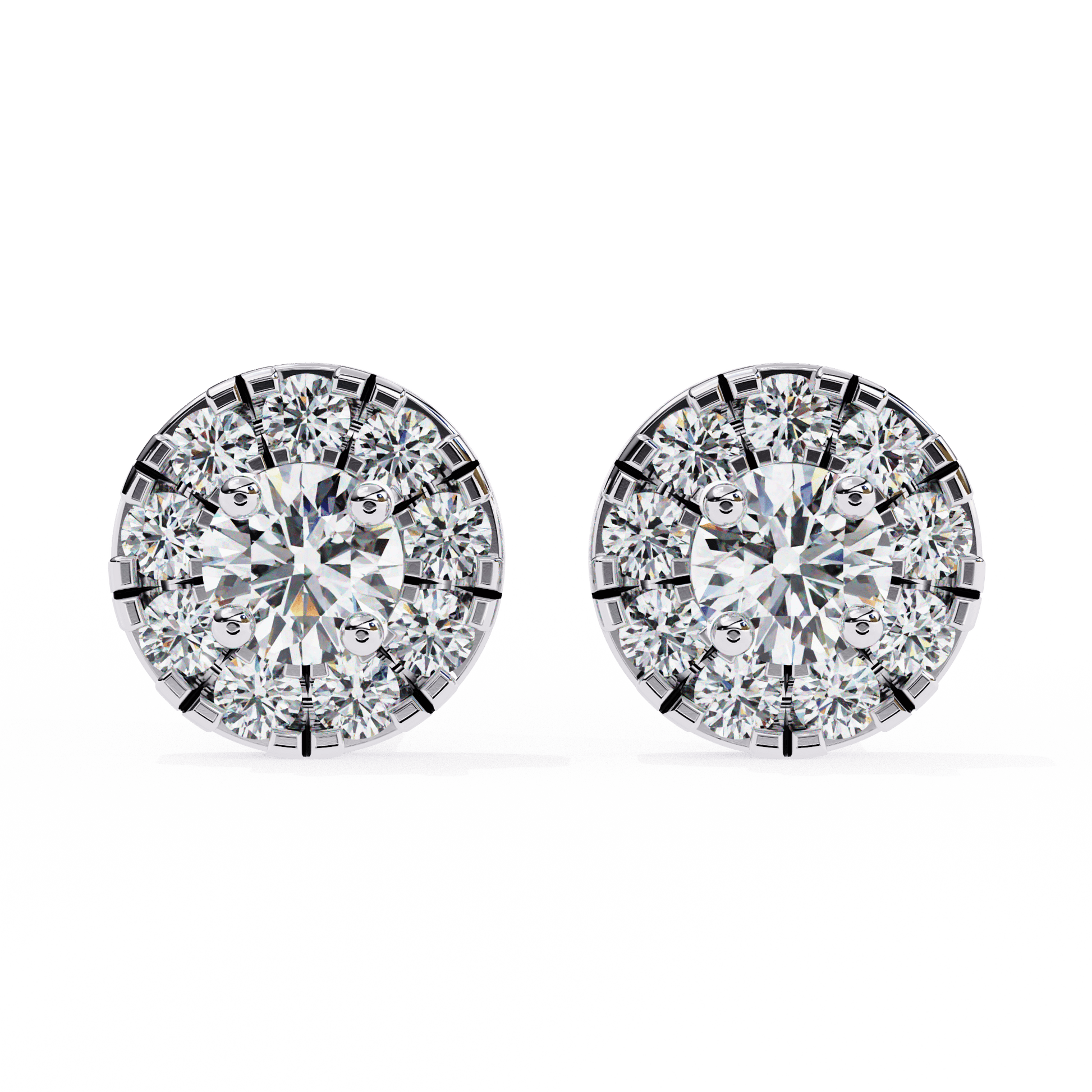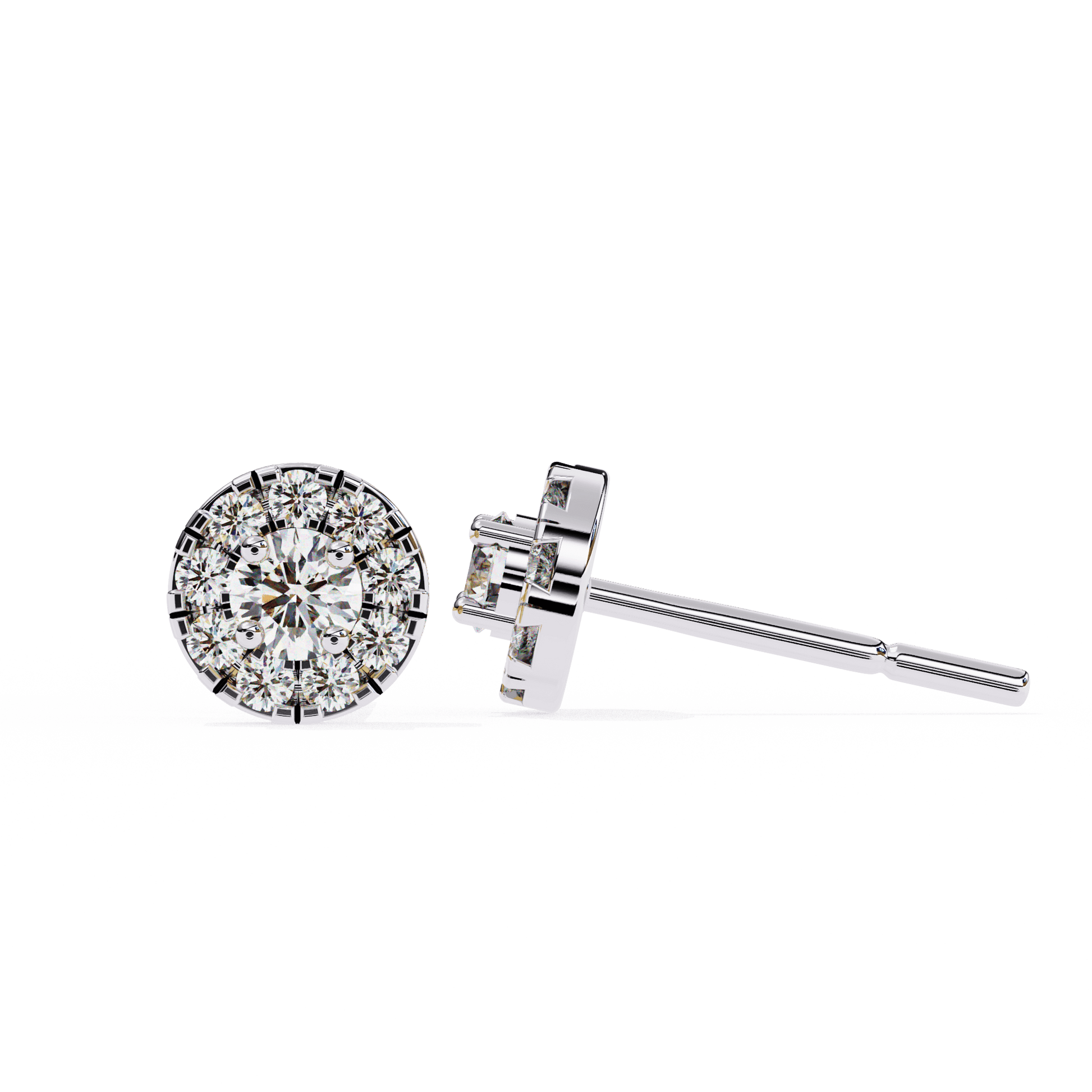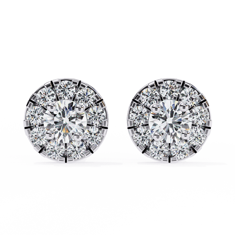 Bonnie is our take on classic halo studs with a bold, modern refinement. At the centre, a brilliant round-cut diamond is framed by a perfectly arranged cluster of round accent stones—giving the illusion of a larger solitaire and amplifying sparkle from every angle. Set in a clean, secure basket with a full circular base, Bonnie is a statement of elegance made for everyday luxury.