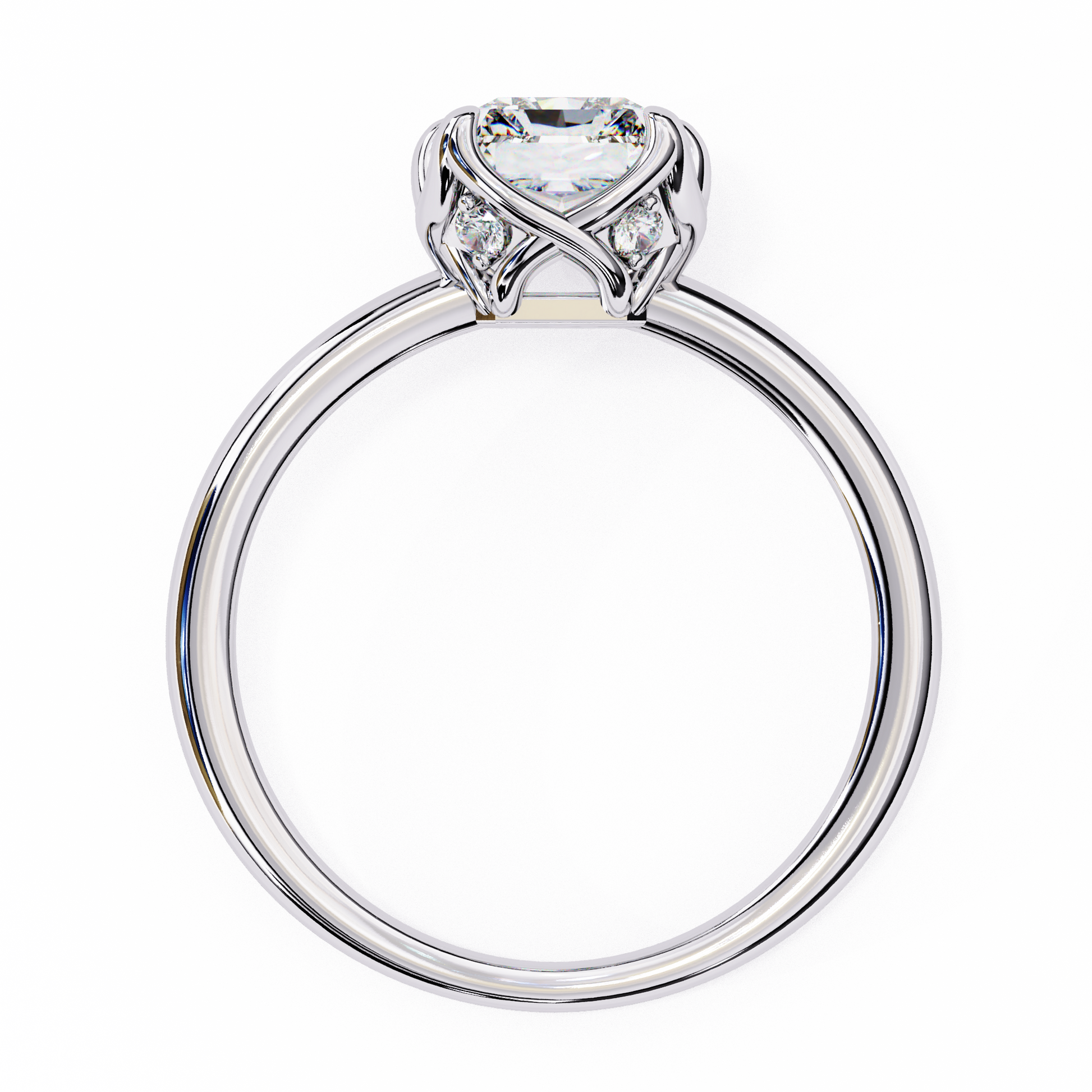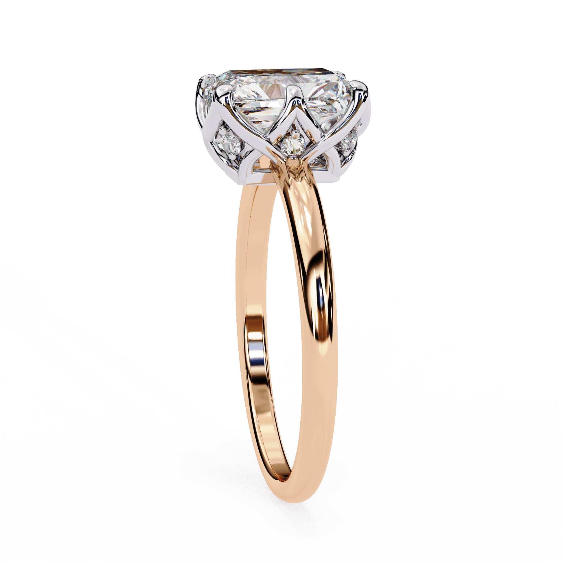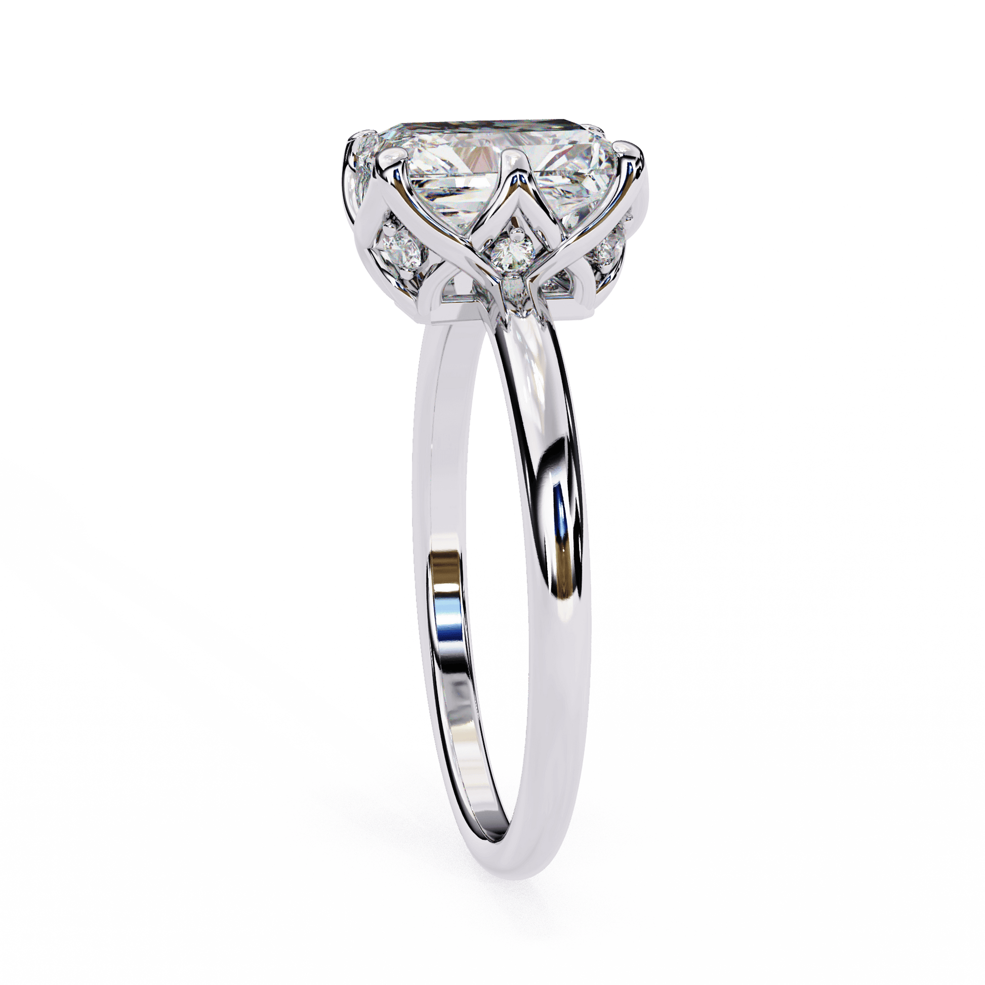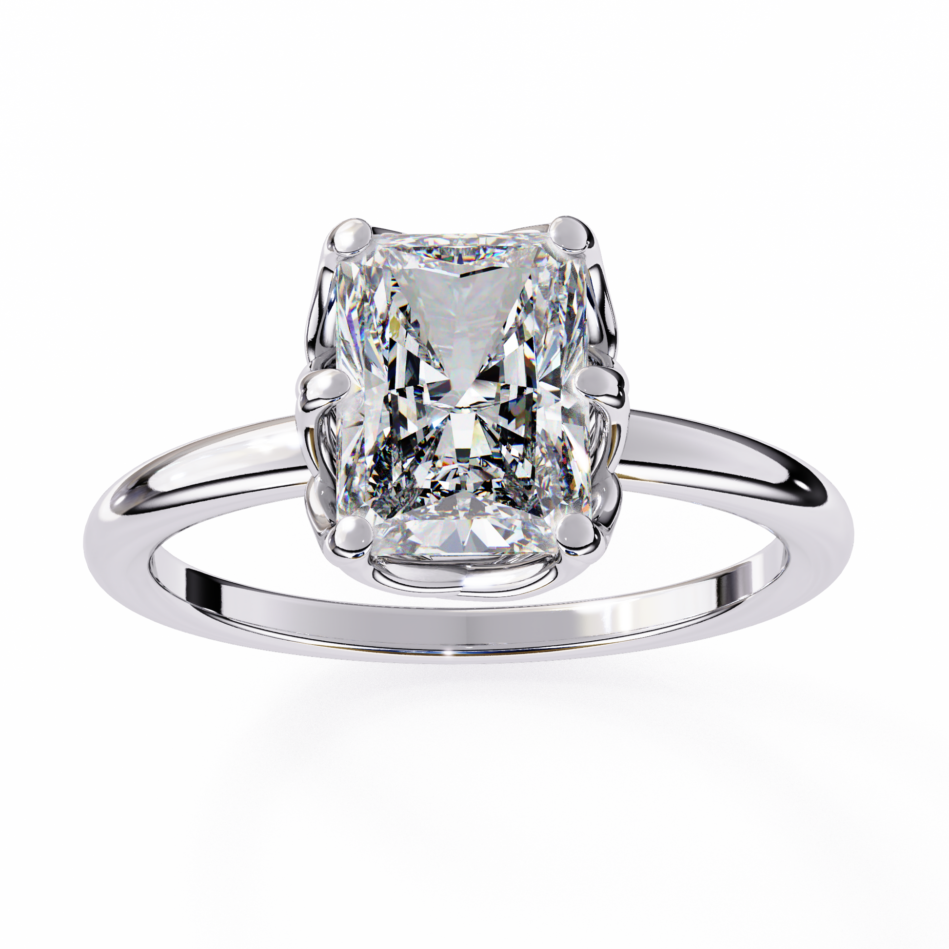 Chloe features an Radiant-cut center stone in a flush tulip setting, creating a smooth, seamless silhouette. Delicate diamond accents nestle within the tulip prongs, adding a subtle touch of brilliance. The refined design balances modern minimalism with intricate detailing, making it effortlessly elegant.