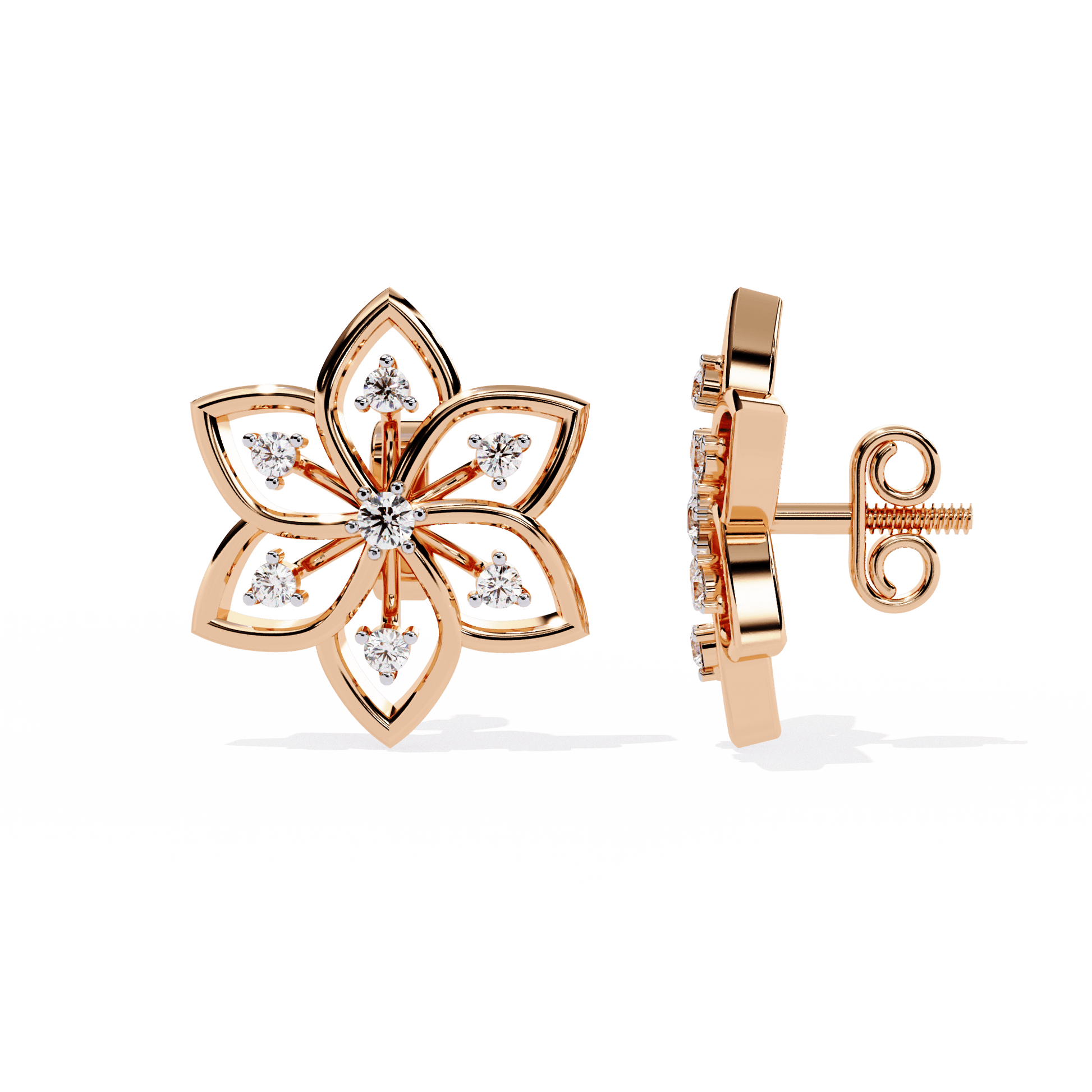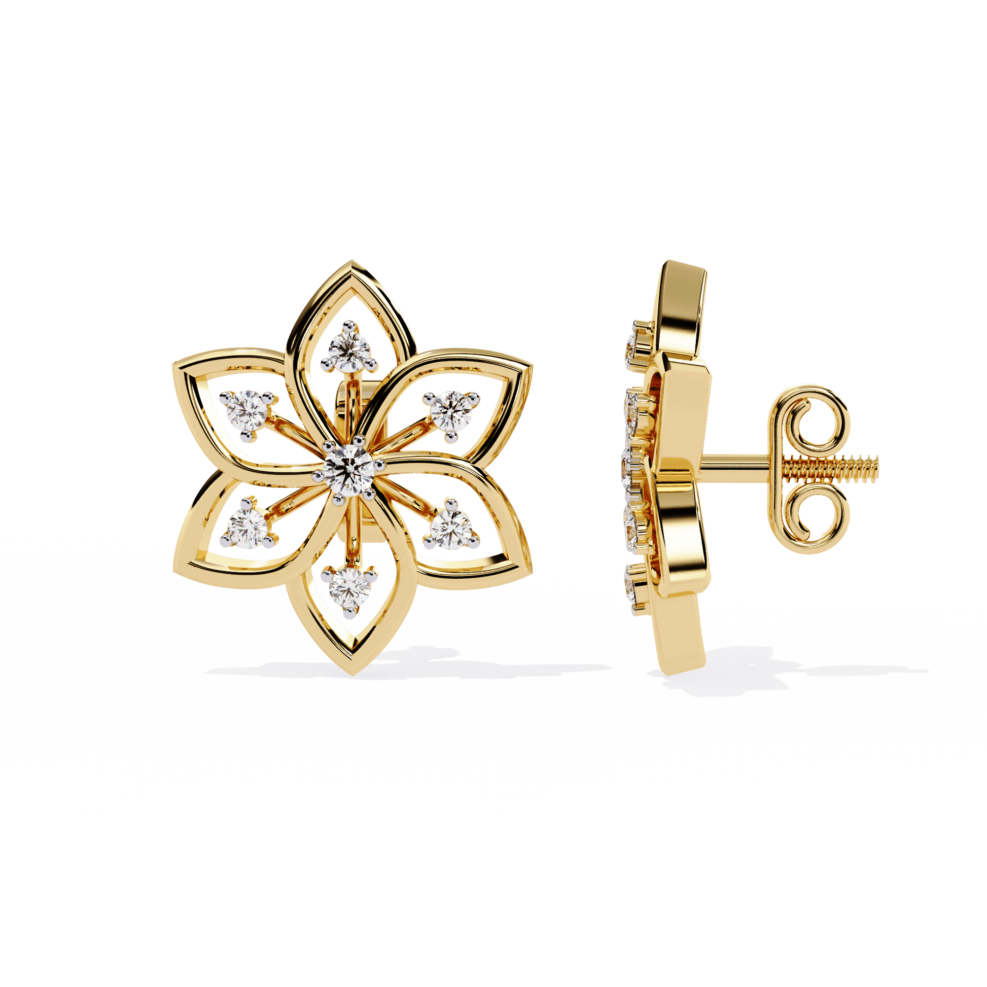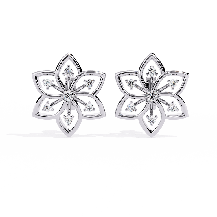Deanna captures the elegance of a perfectly formed bloom in full radiance. Each stud features six open petals sculpted in lustrous gold, fanning out from a brilliant round center stone. At the heart of every petal sits a single round-cut diamond, prong-set to echo the symmetry and refinement of the floral form. Deanna offers layered sparkle within a striking silhouette—graceful, luminous, and ideal for both festive occasions and polished daily wear.