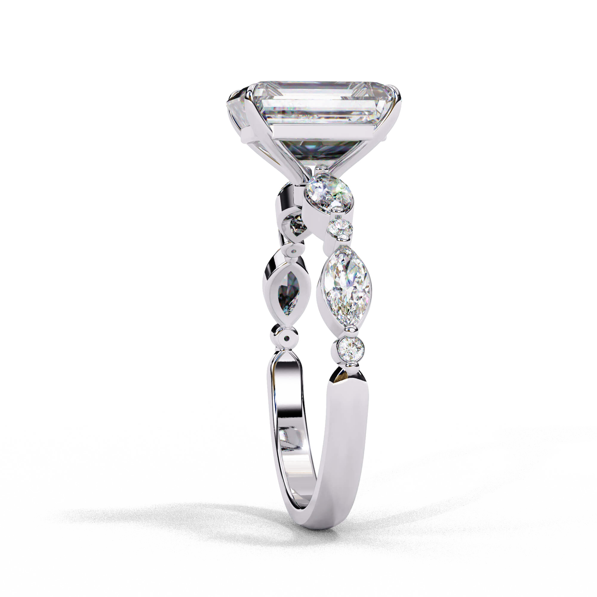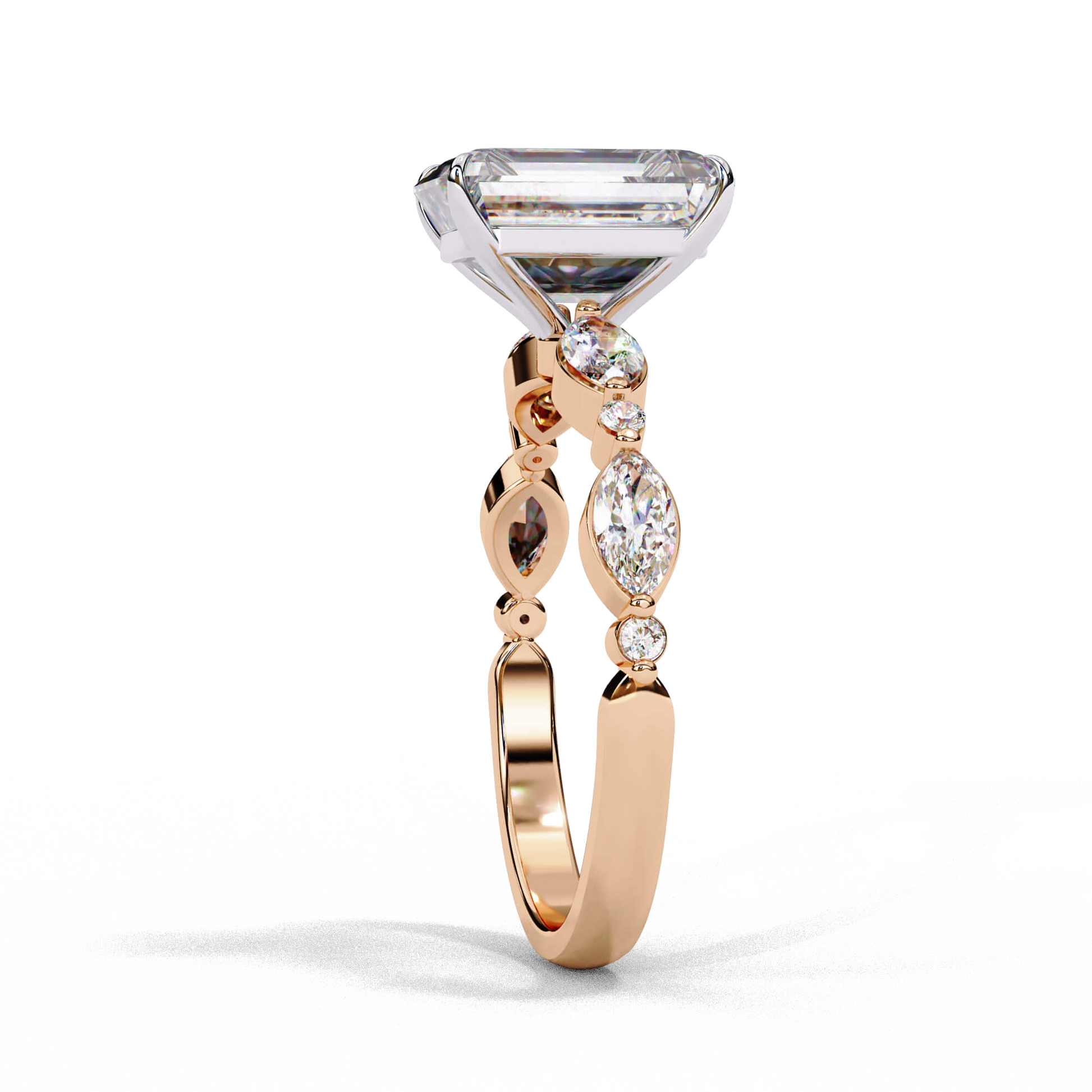 Delilah features an Emerald cut diamond set in a four claw two tone setting to maintain its brilliance. Her band features Marquise and Round stones in a shared prong setting, adding a touch of sparkle to a classic silhouette.