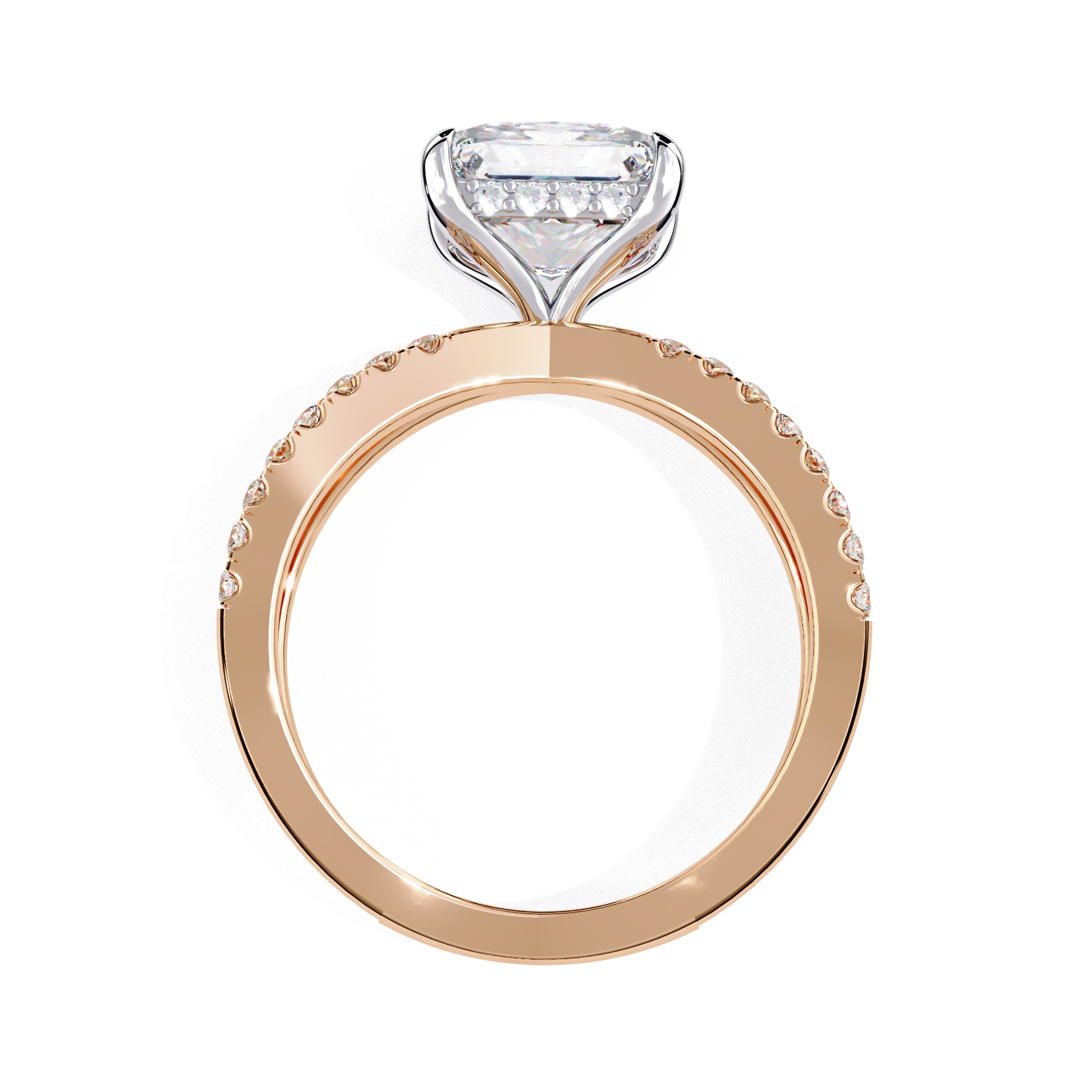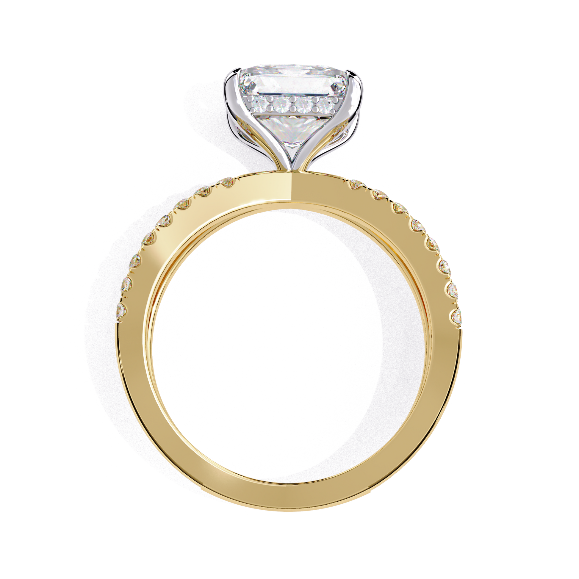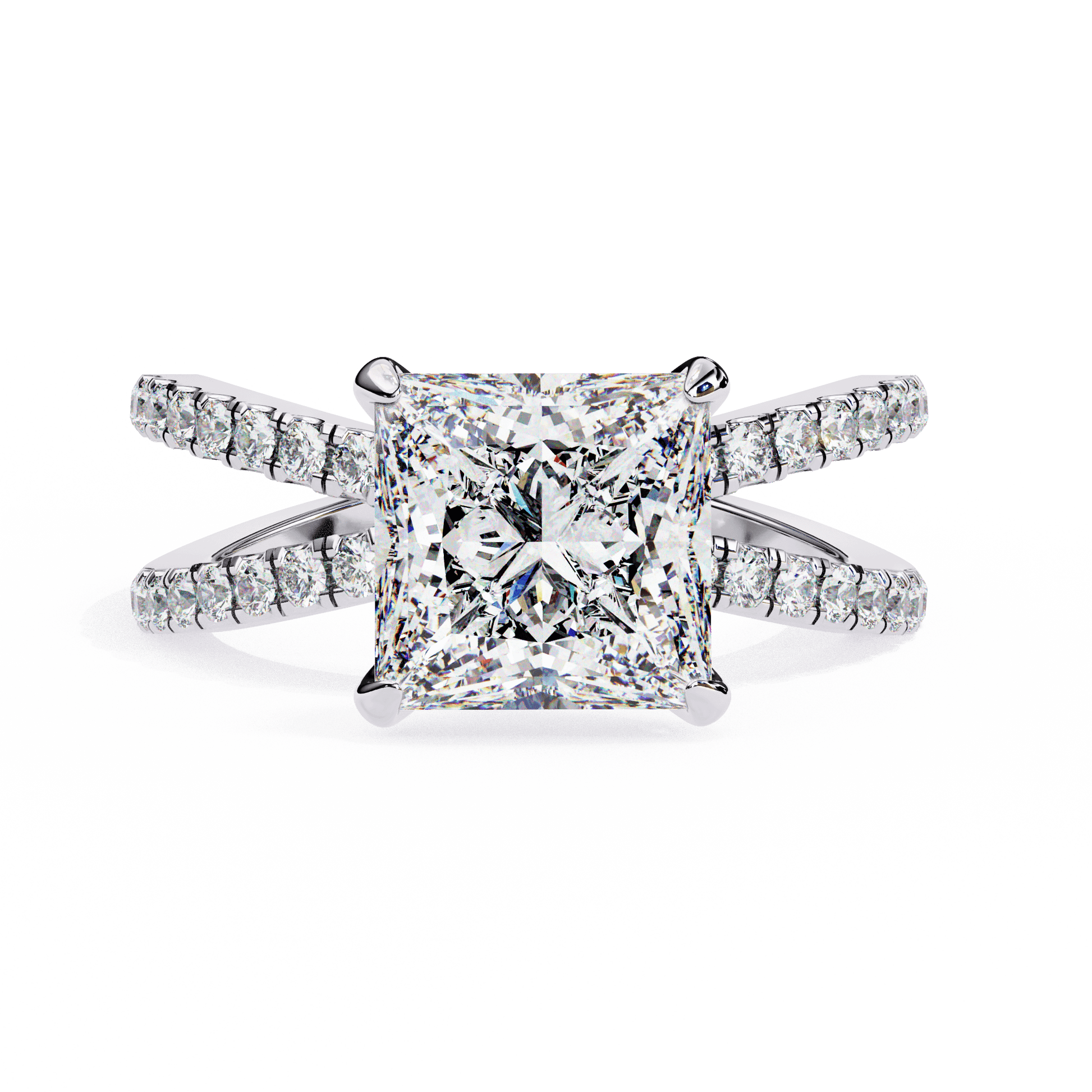 Elise features a captivating Princess-cut center stone, set atop a split shank with delicate half pavé detailing and hidden halo. The open band design enhances light flow, creating an airy, luminous effect while maintaining a refined balance of modern elegance and enduring beauty.
