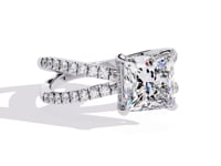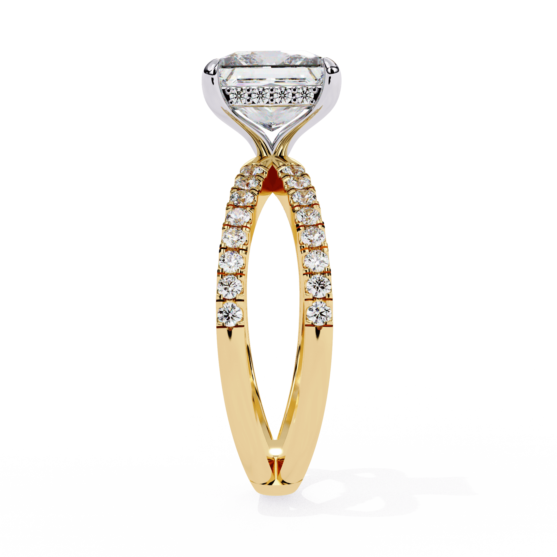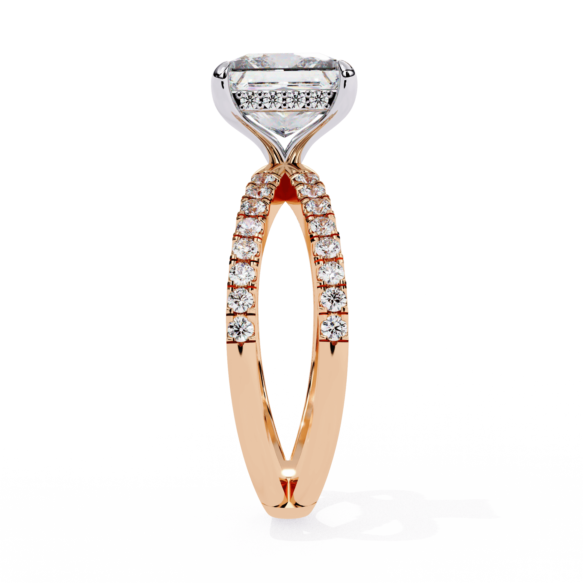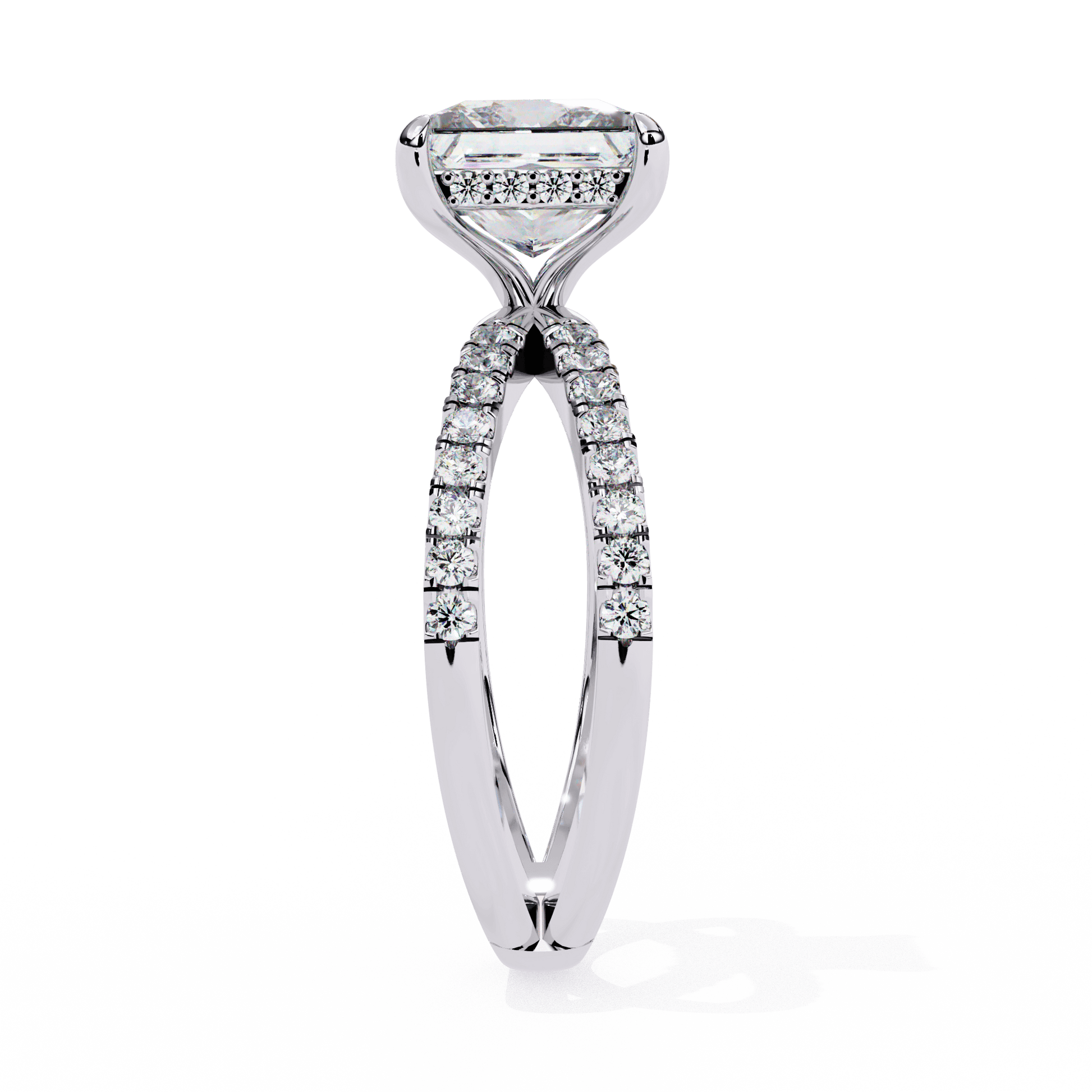 Elise features a captivating Princess-cut center stone, set atop a split shank with delicate half pavé detailing and hidden halo. The open band design enhances light flow, creating an airy, luminous effect while maintaining a refined balance of modern elegance and enduring beauty.