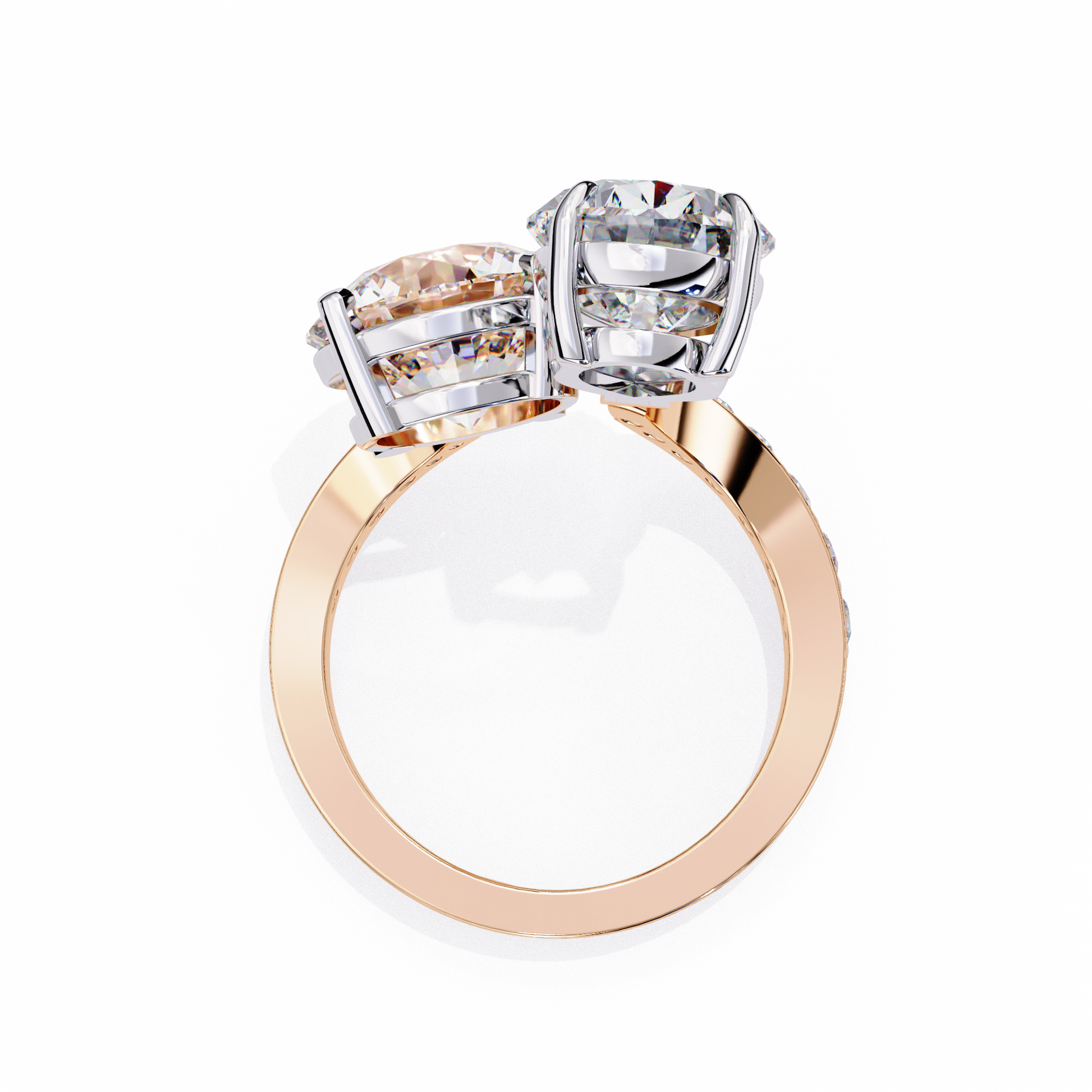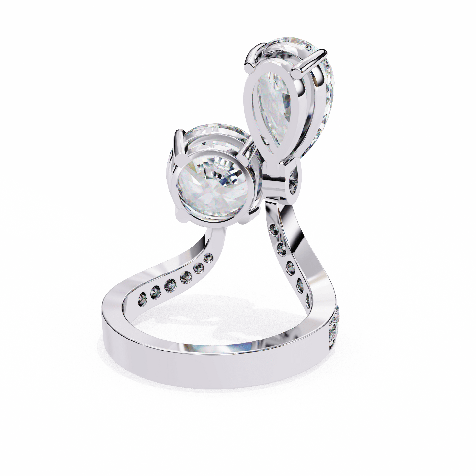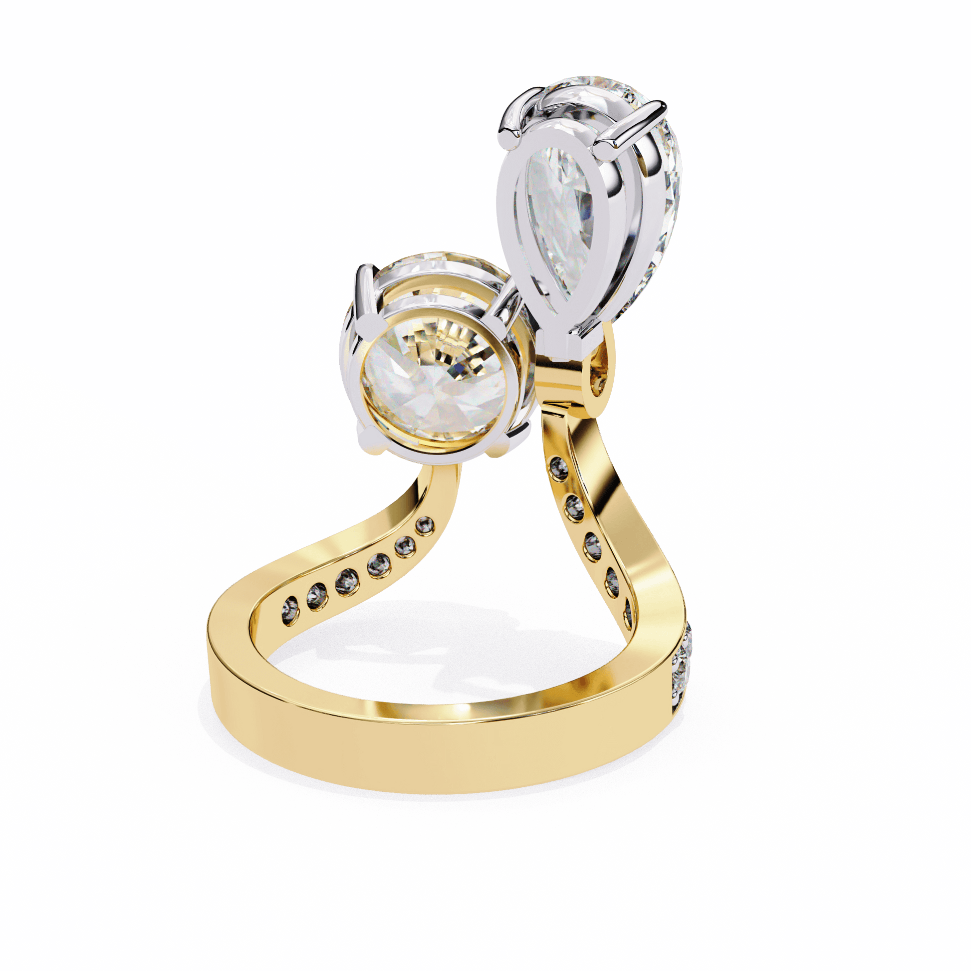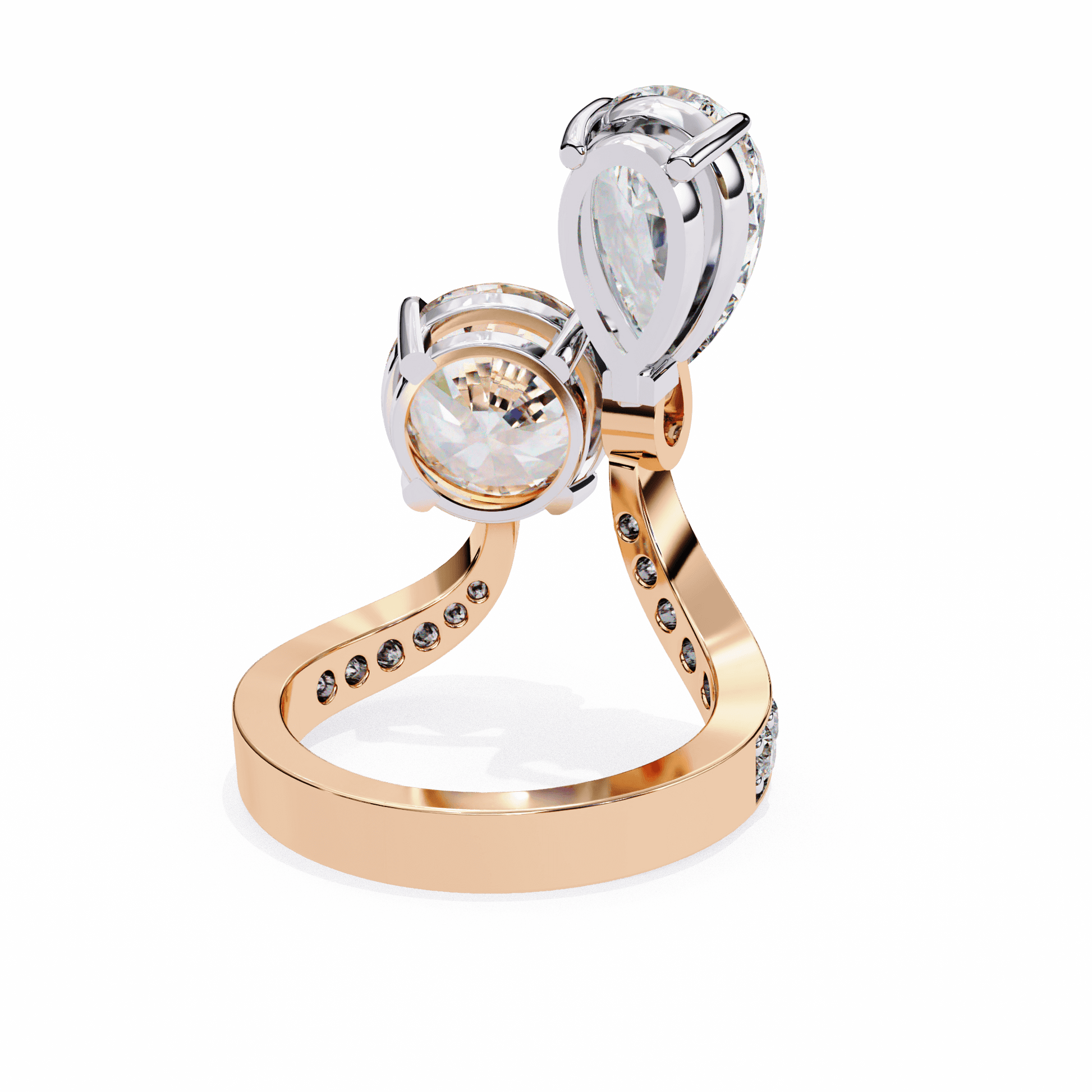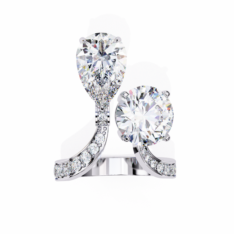 Ellie redefines tradition with a bold toi et moi silhouette, where two distinct stones—a round brilliant and a pear-cut diamond—gracefully mirror one another in perfect harmony. The open band curves with elegance, adorned with half channel-set pavé diamonds that glimmer with every movement.