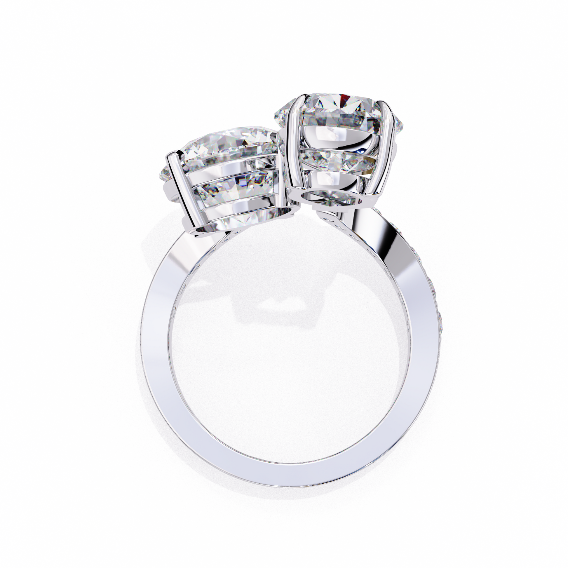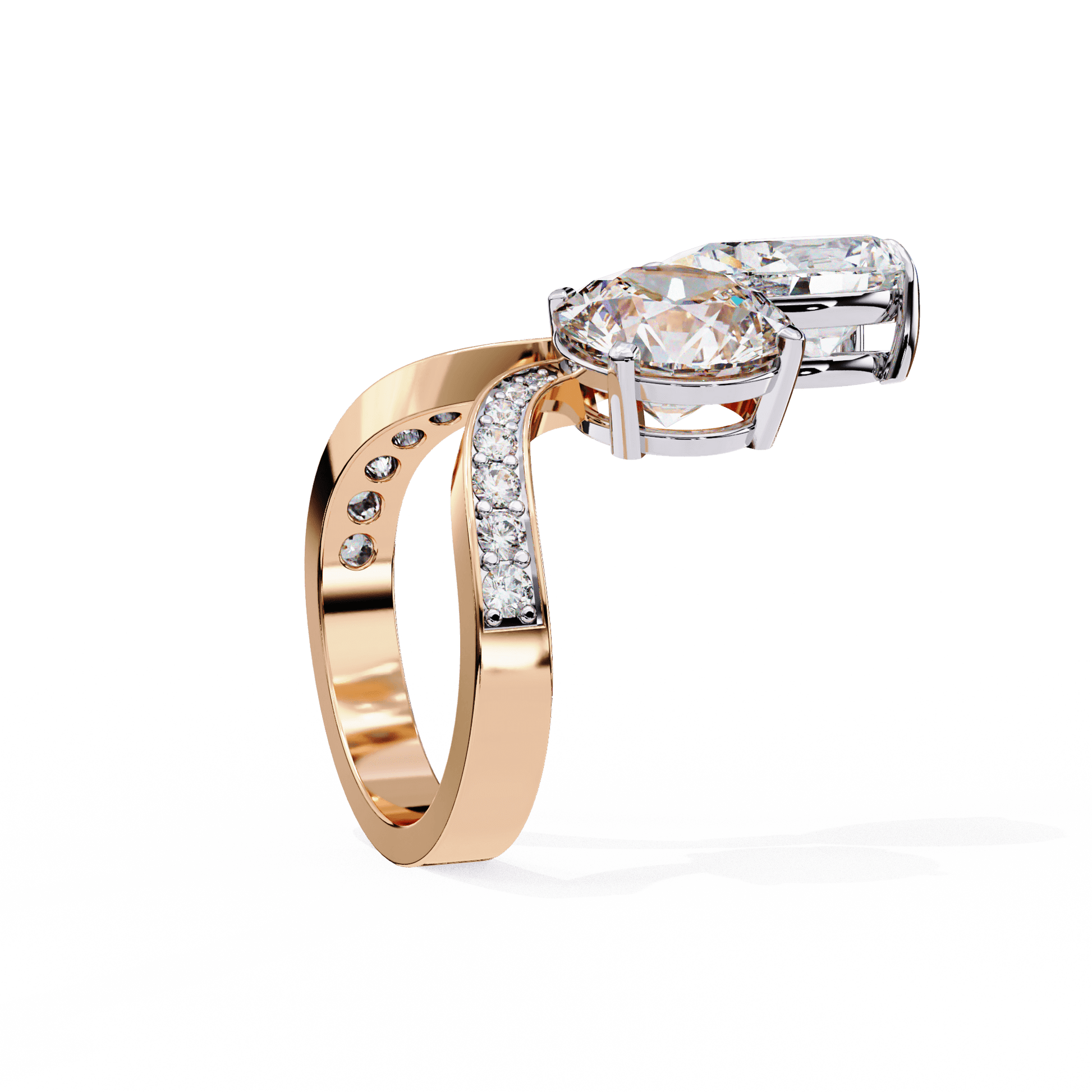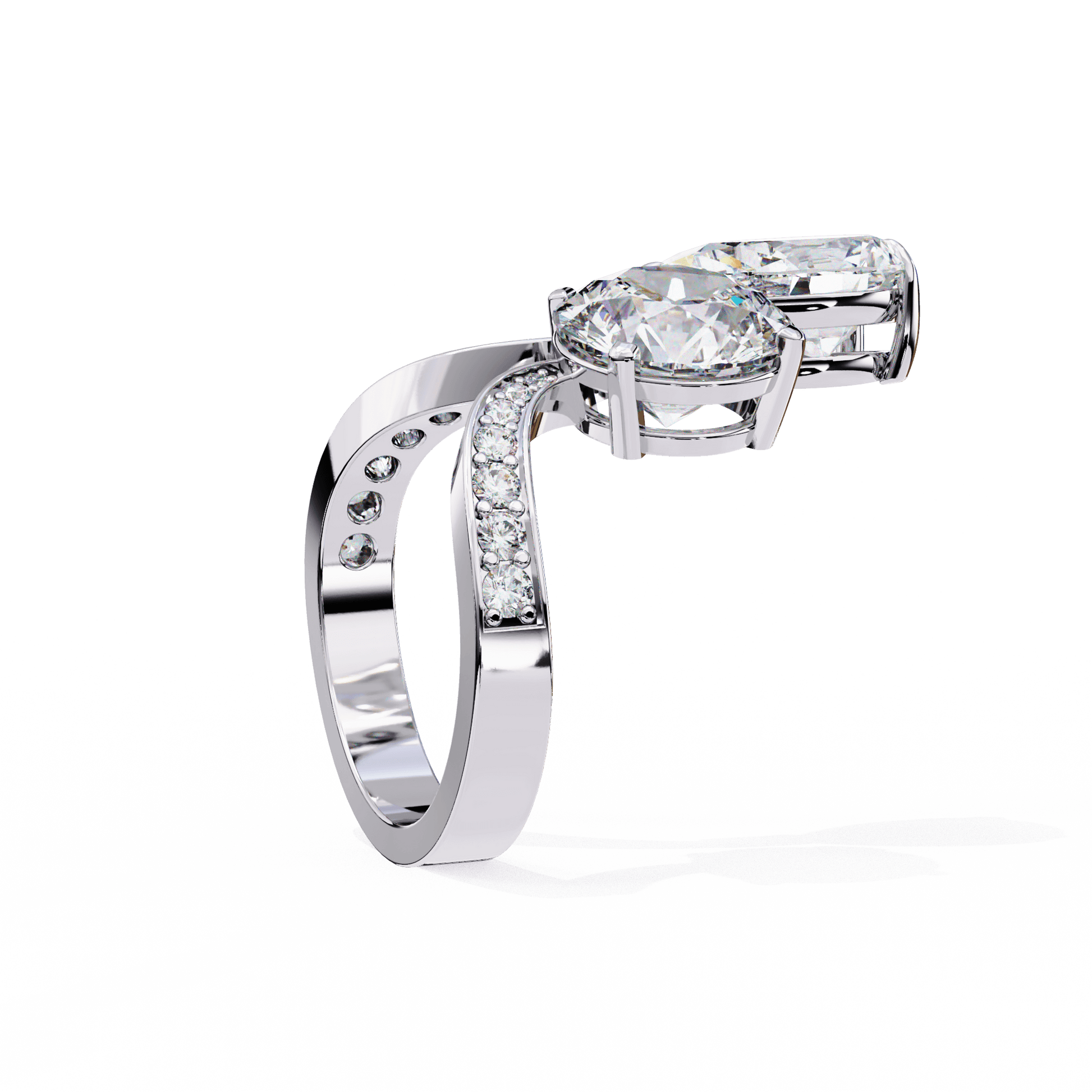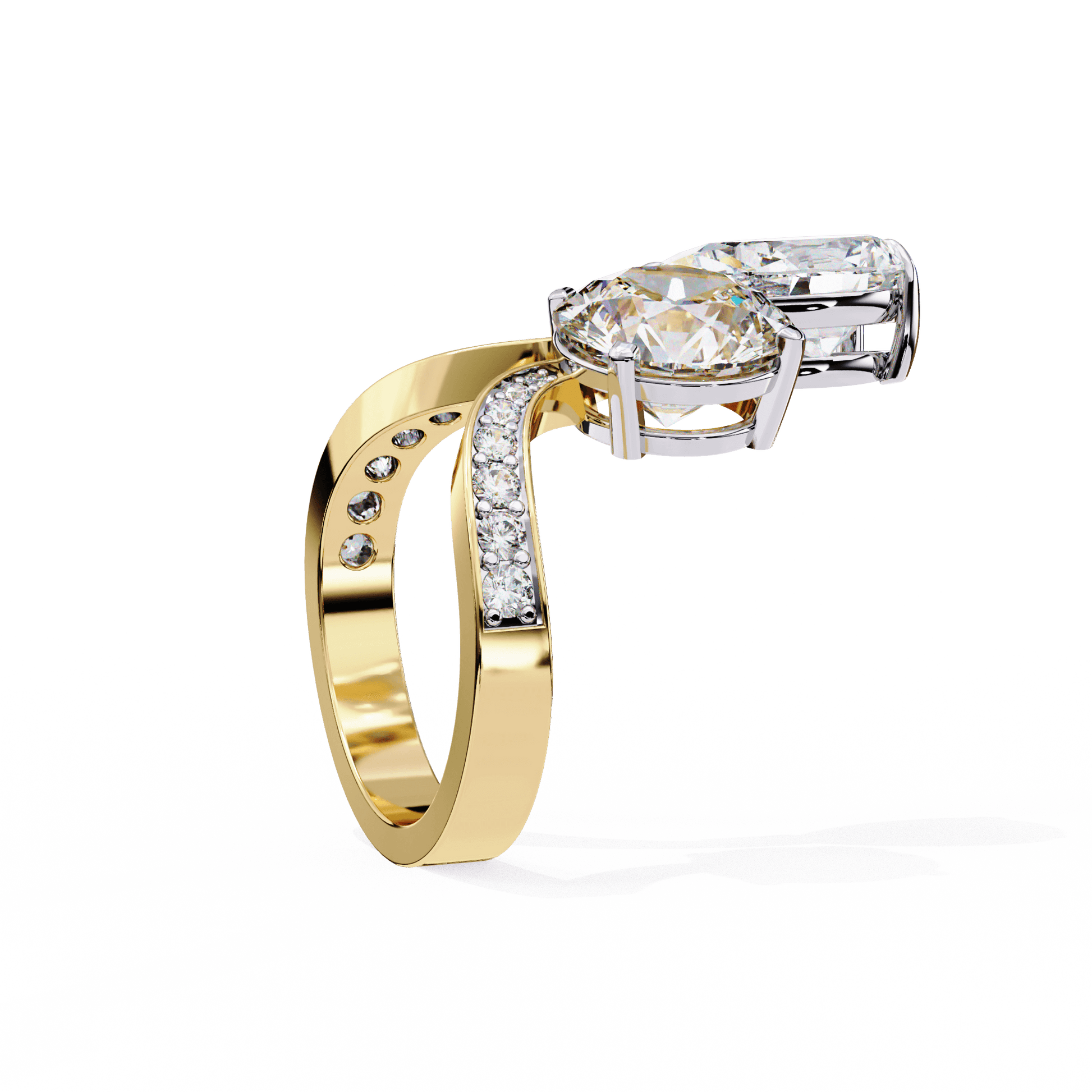 Ellie redefines tradition with a bold toi et moi silhouette, where two distinct stones—a round brilliant and a pear-cut diamond—gracefully mirror one another in perfect harmony. The open band curves with elegance, adorned with half channel-set pavé diamonds that glimmer with every movement.