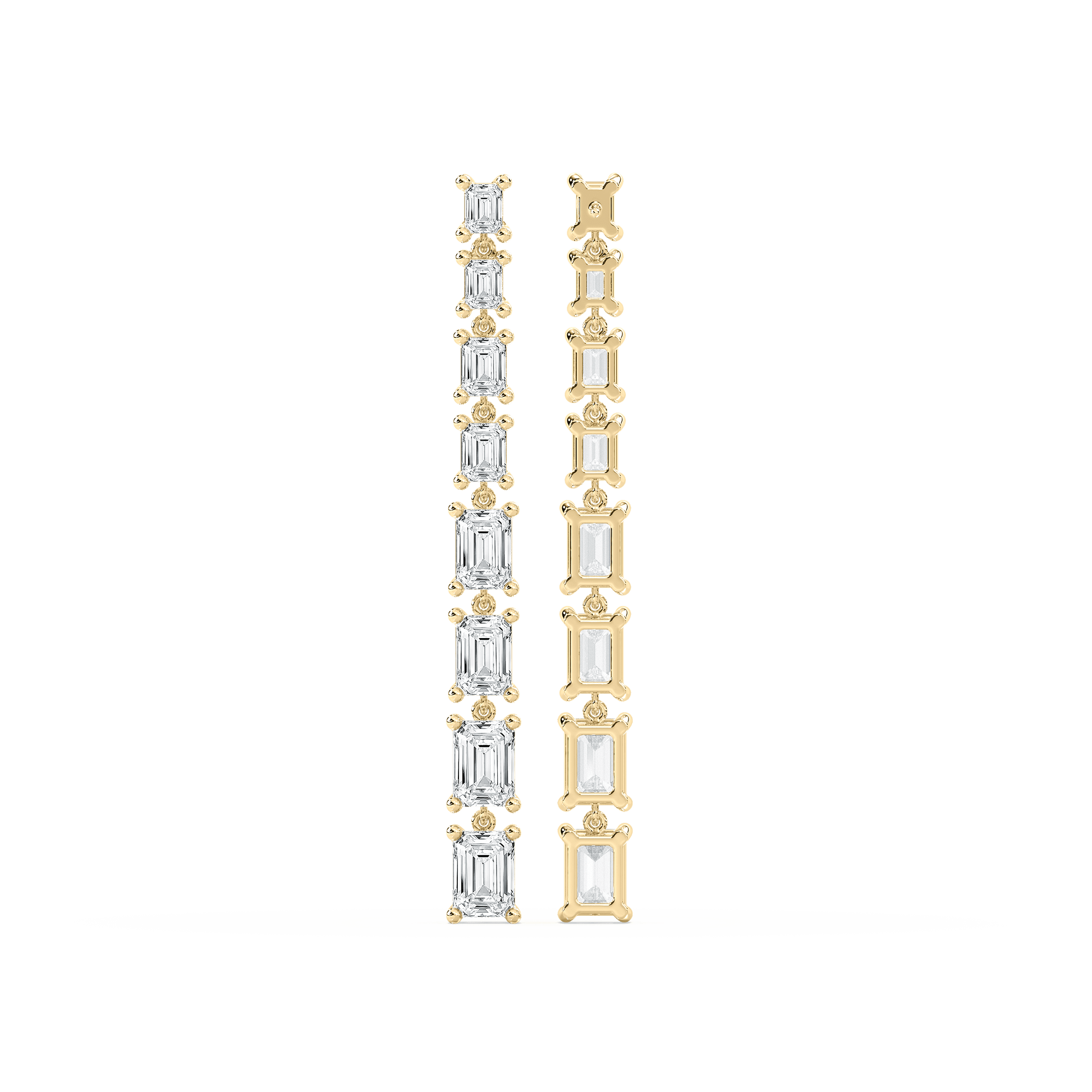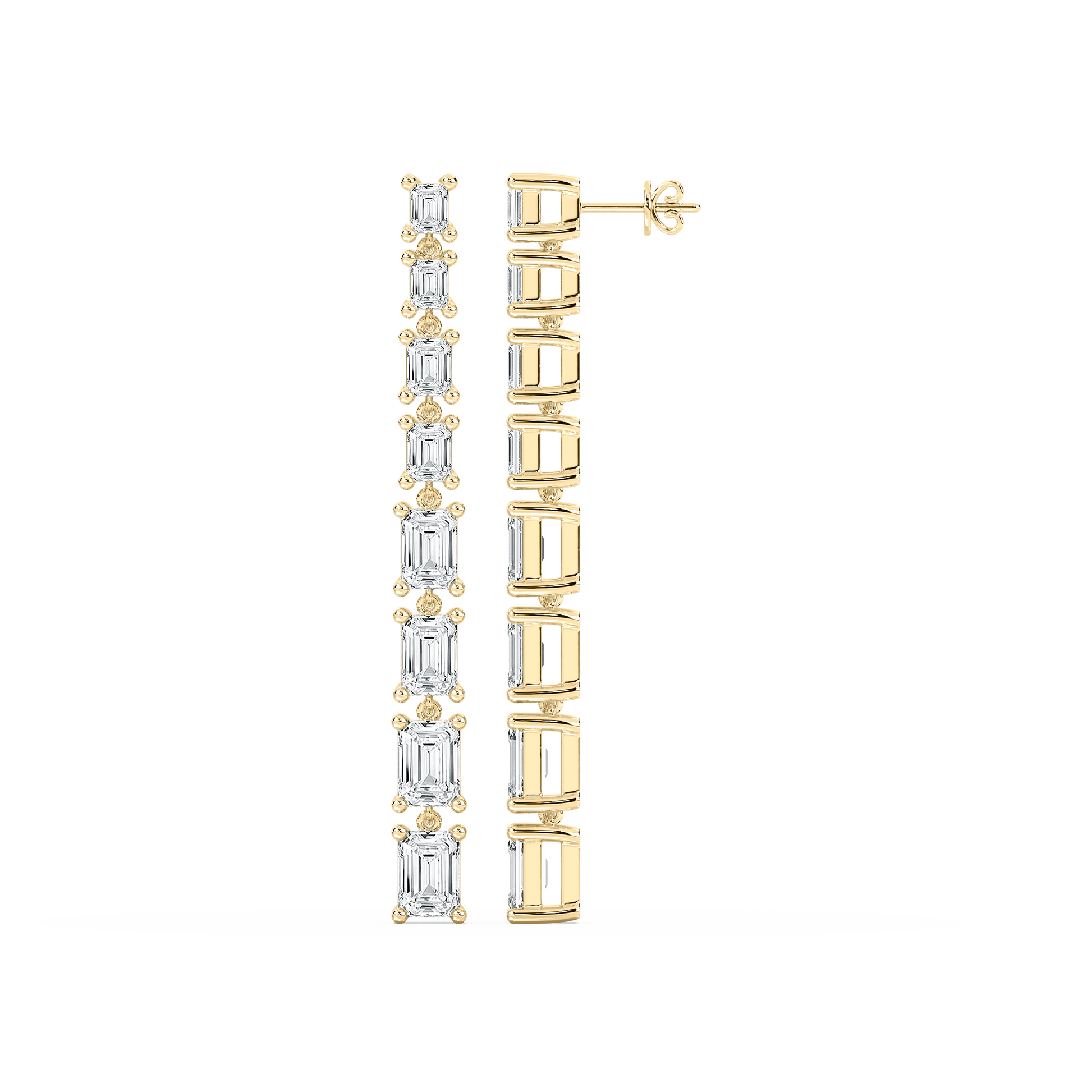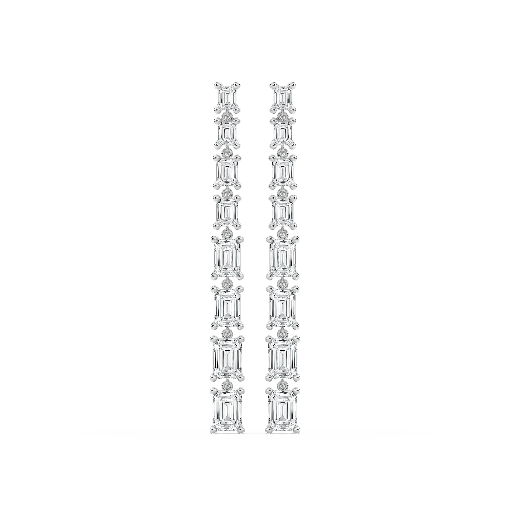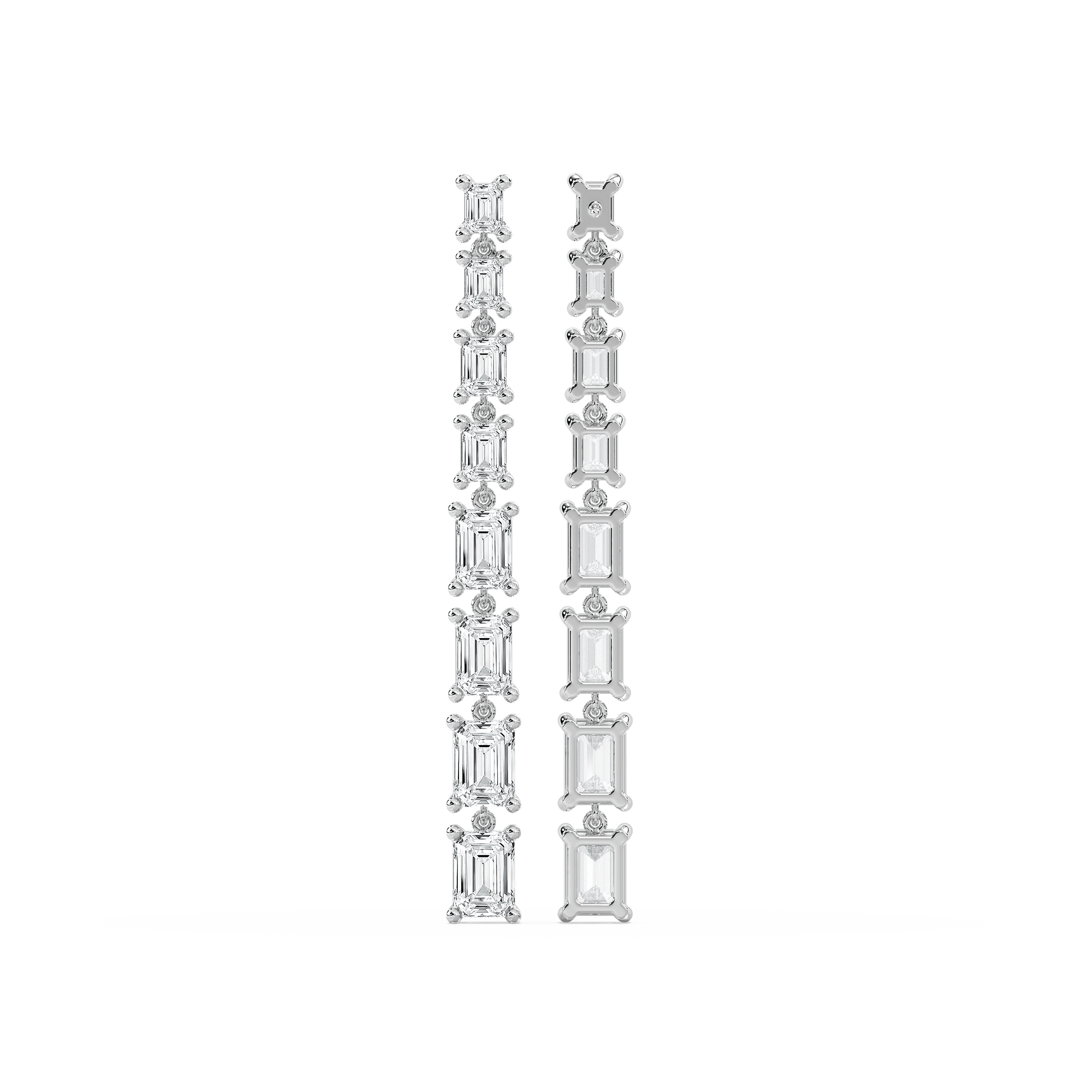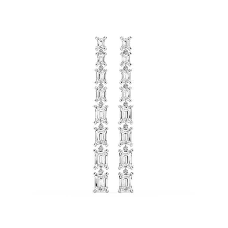 Emi embodies the pinnacle of refined luxury. Composed entirely of emerald-cut diamonds, these elongated drop earrings showcase a flawless rhythm of symmetry and light. Each earring features a graduated arrangement of emerald diamonds, increasing in size toward the base to create a graceful taper and visual depth. The clean geometry of each stone is accentuated by a four-prong setting that allows light to flood through every facet. Crafted for the true connoisseur, Emi is unapologetically opulent—ideal for the most formal occasions, bridal moments, or as a timeless expression of sophistication.