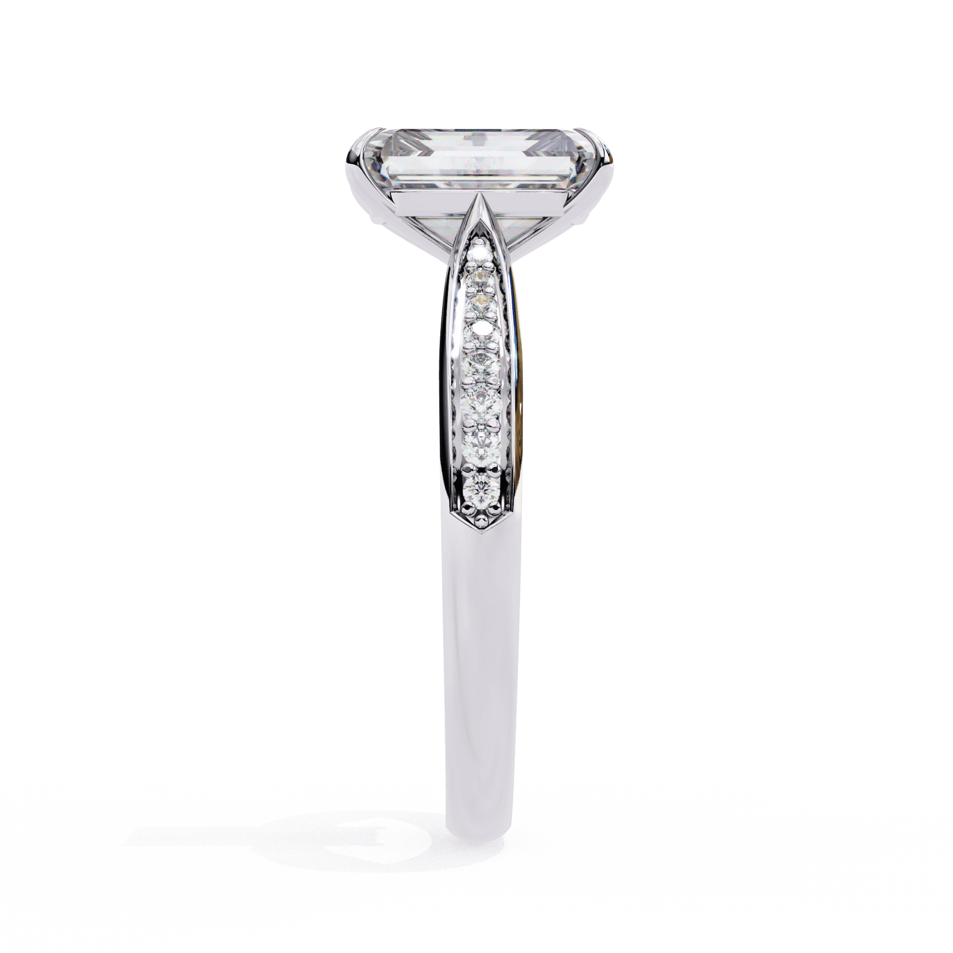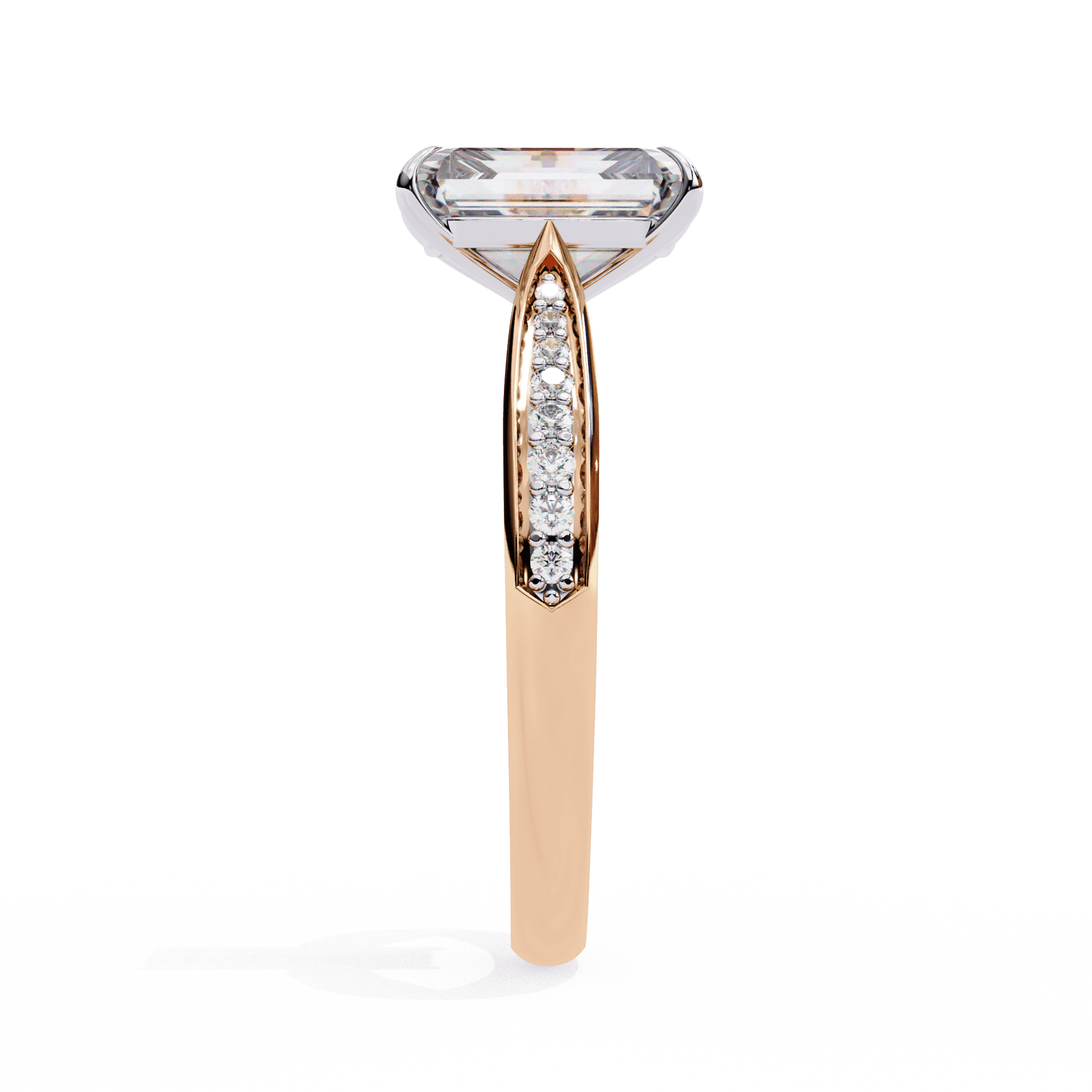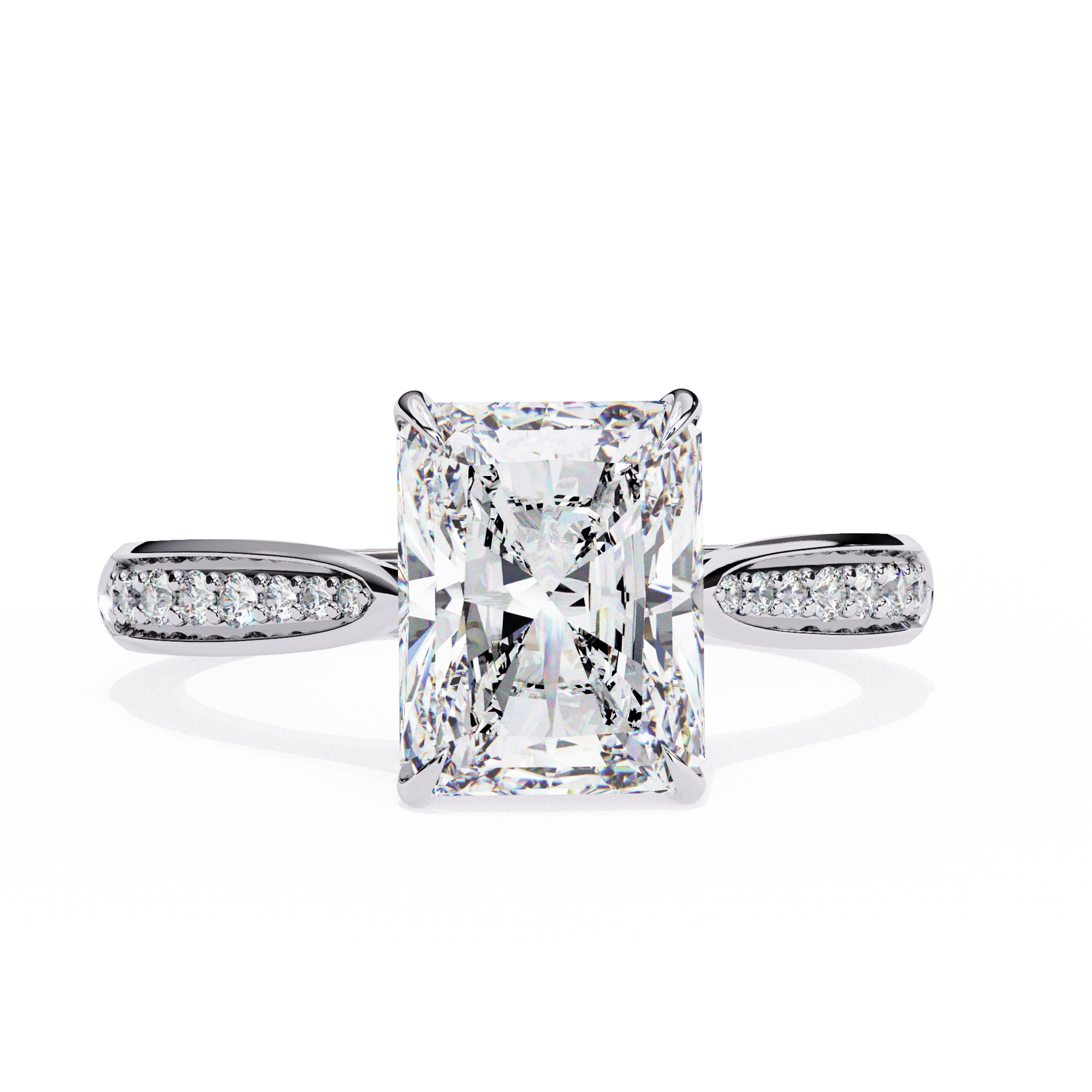 Felicity features a stunning Radiant-cut center stone set in a four-claw setting with a gallery rail. The cathedral design lifts the stone, while tapered channel-set side stones add sparkle. Diamonds along the bridge of the cathedral adds a hidden touch of brilliance.
