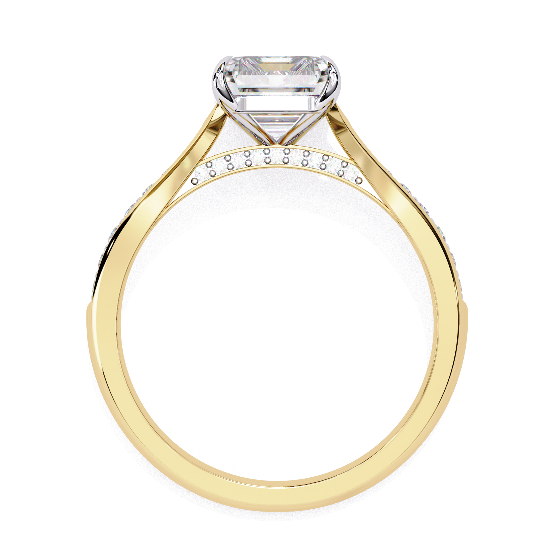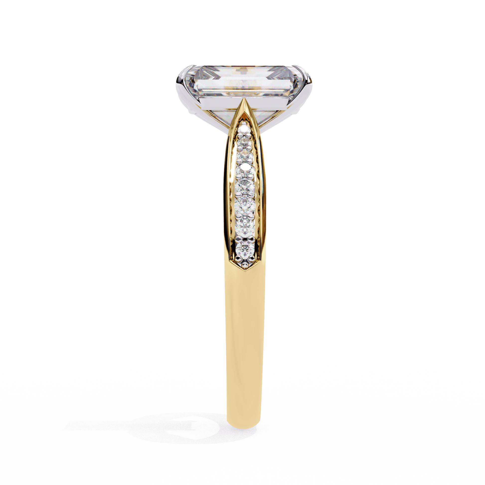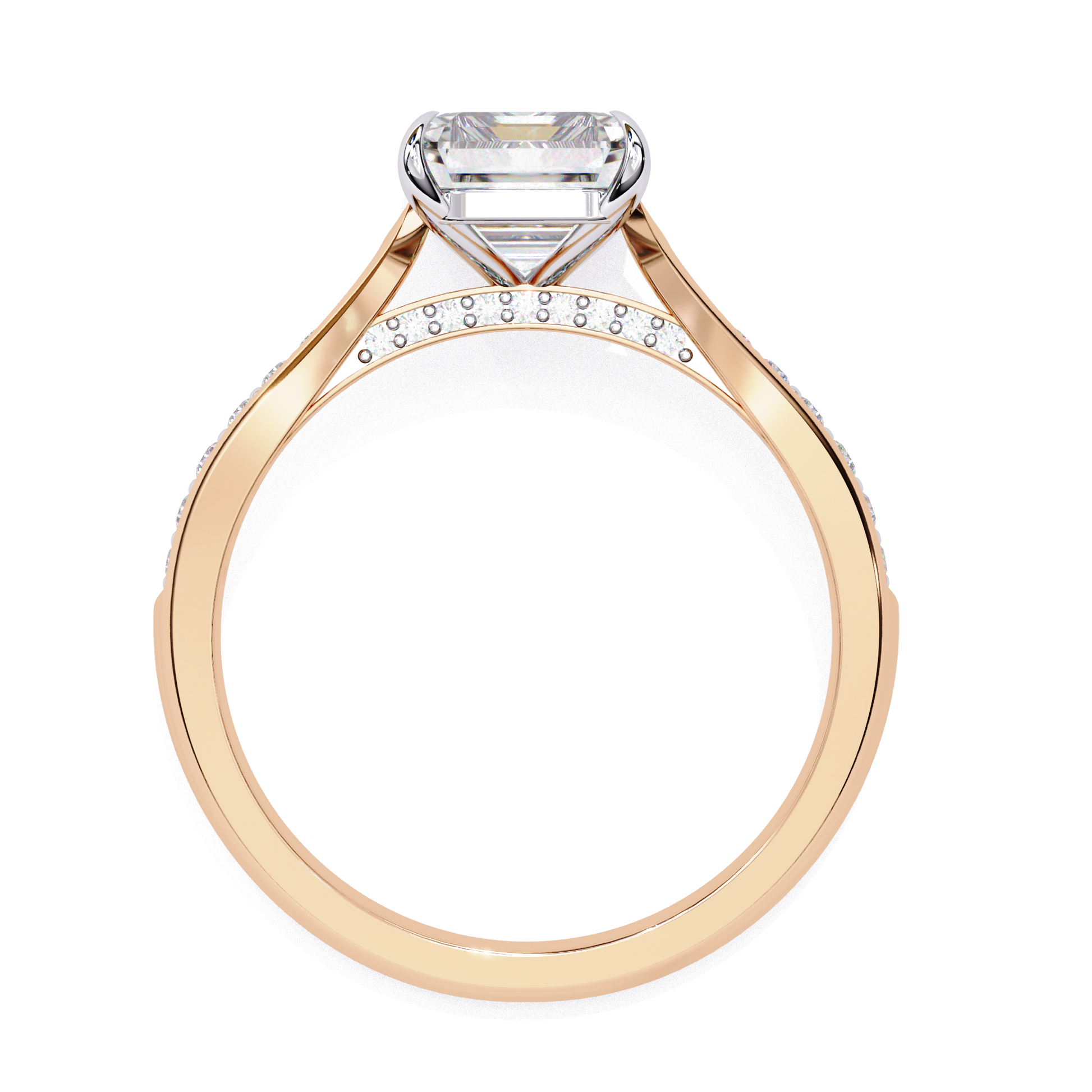 Felicity features a stunning Radiant-cut center stone set in a four-claw setting with a gallery rail. The cathedral design lifts the stone, while tapered channel-set side stones add sparkle. Diamonds along the bridge of the cathedral adds a hidden touch of brilliance.