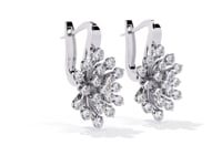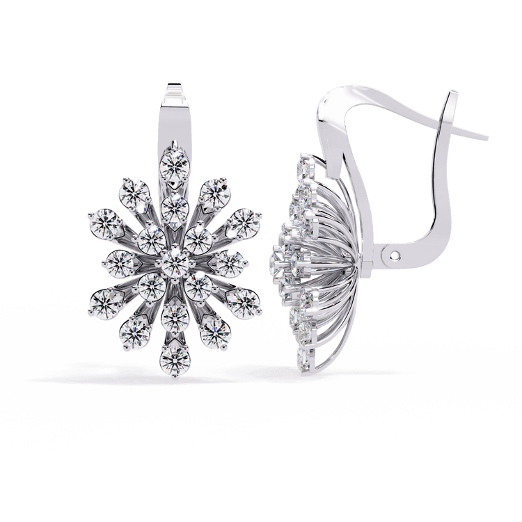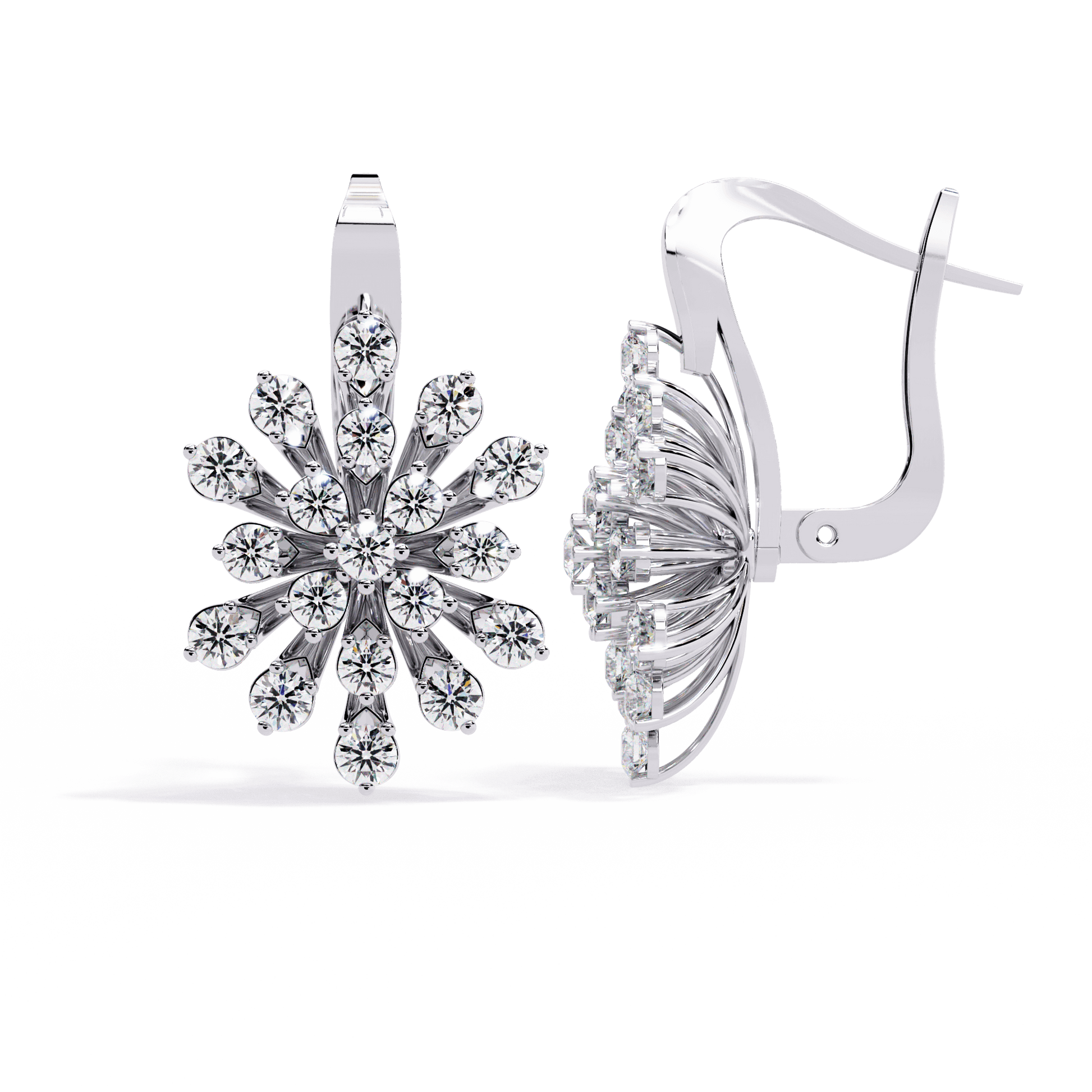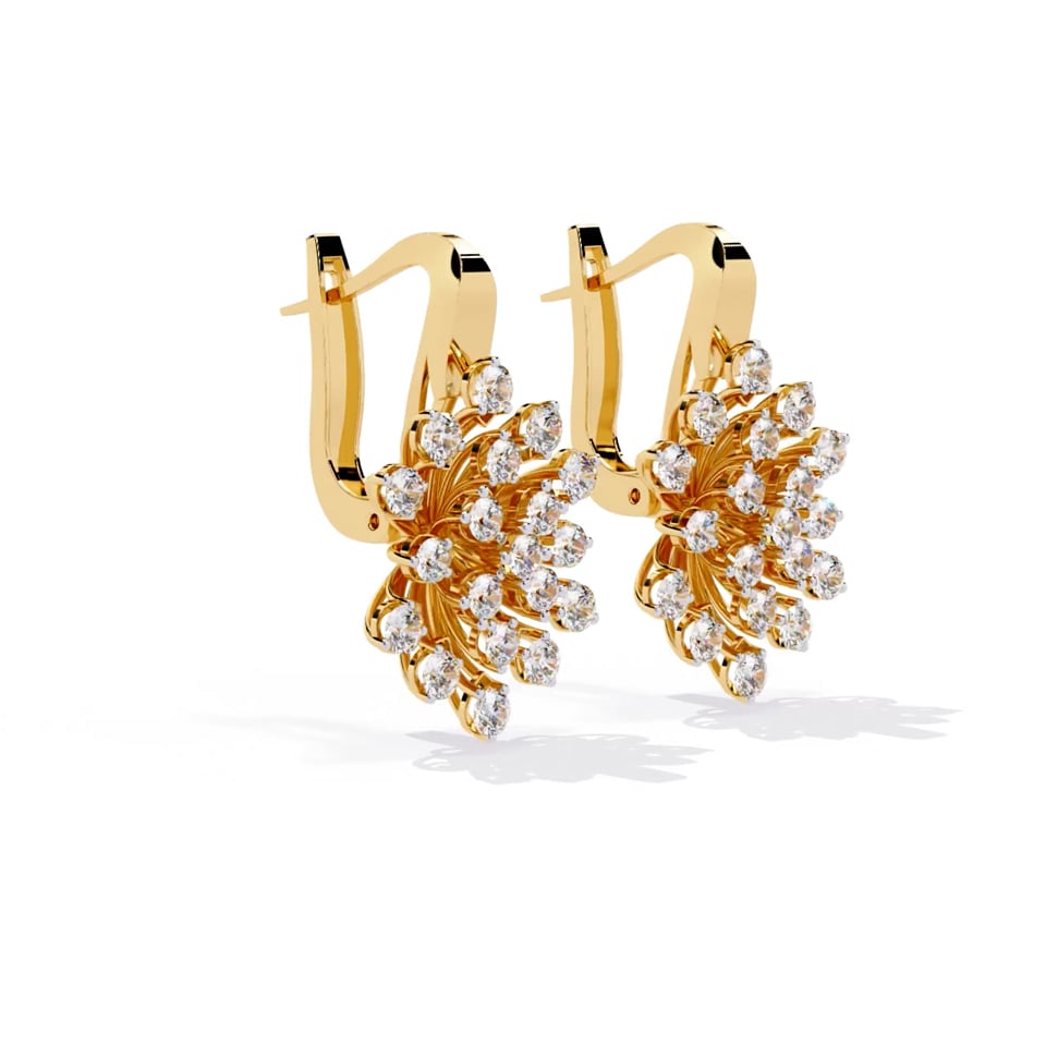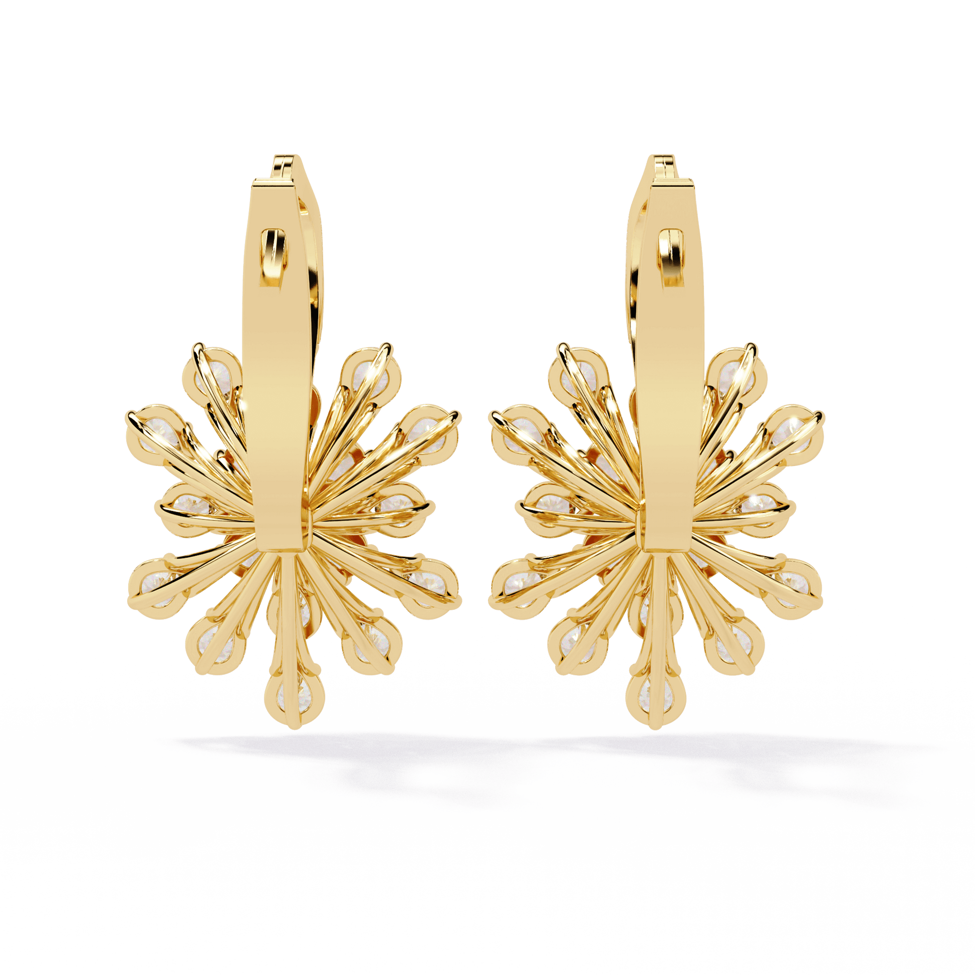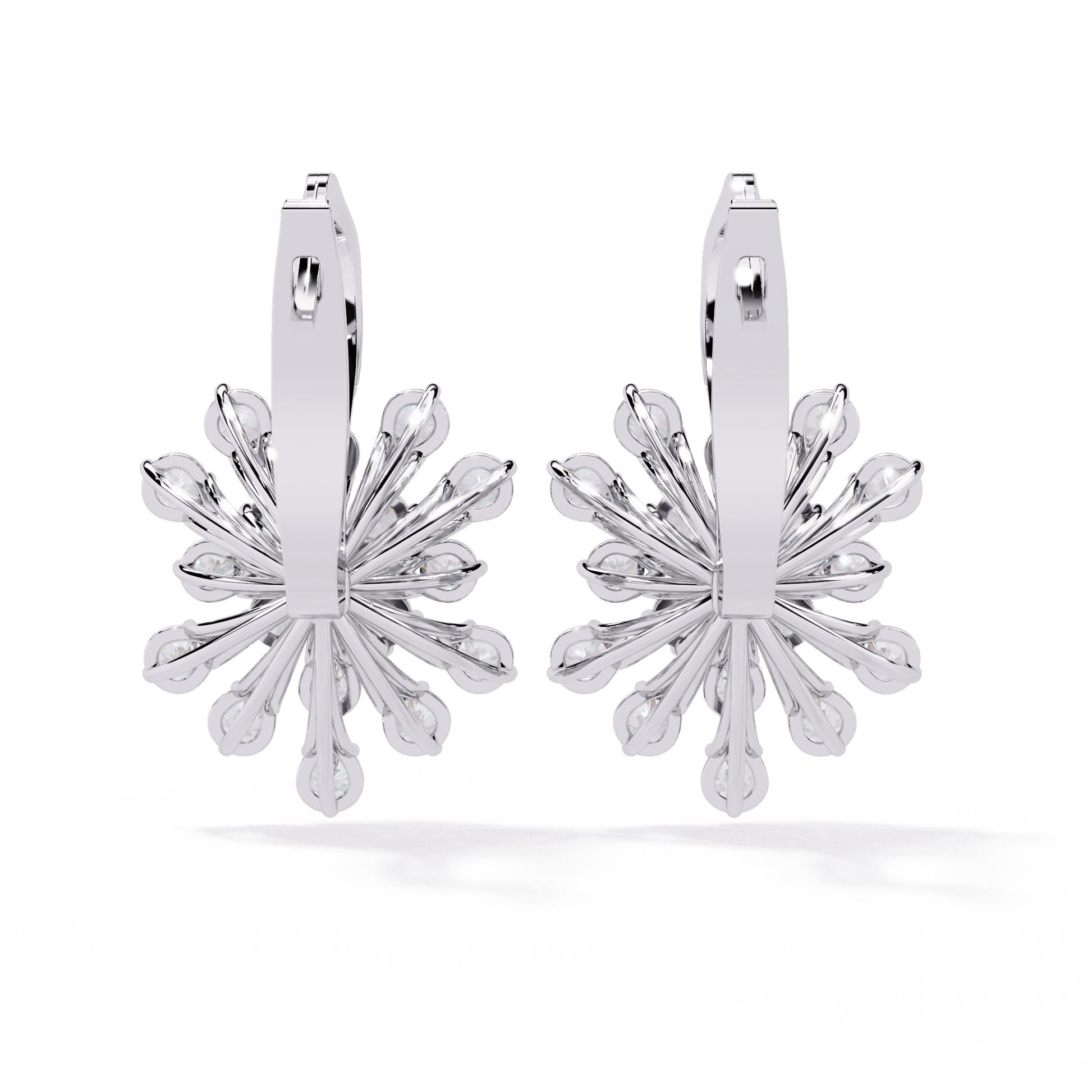 A statement of brilliance. Joanna captures the elegance of a blooming flower, reimagined through a dazzling arrangement of round-cut diamonds. Each diamond is set in a sculpted framework, radiating outward in layers of brilliance and texture. Suspended from polished hoops, this pair offers striking dimension and feminine charm with every turn. A bold yet graceful expression of artistry—designed to be remembered.