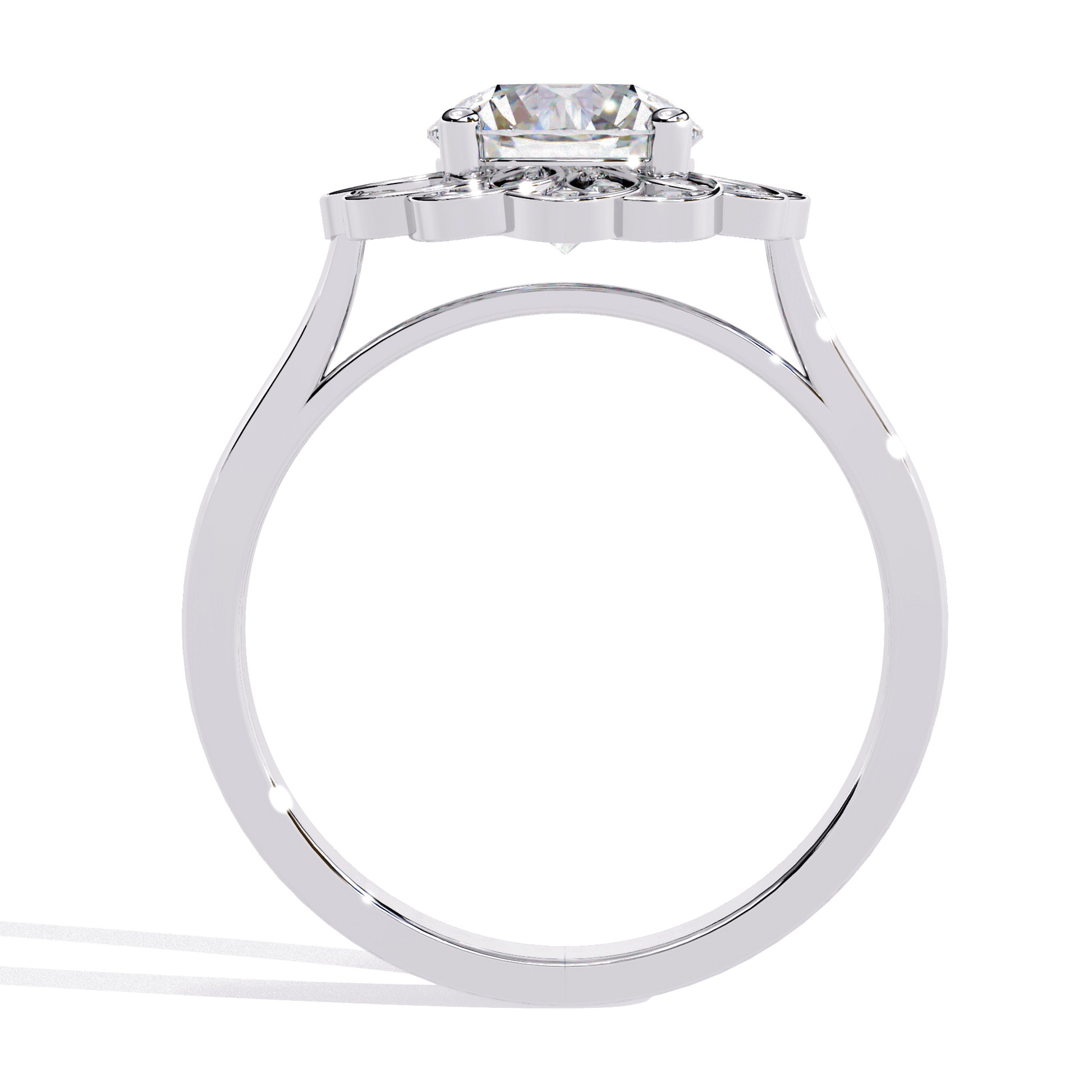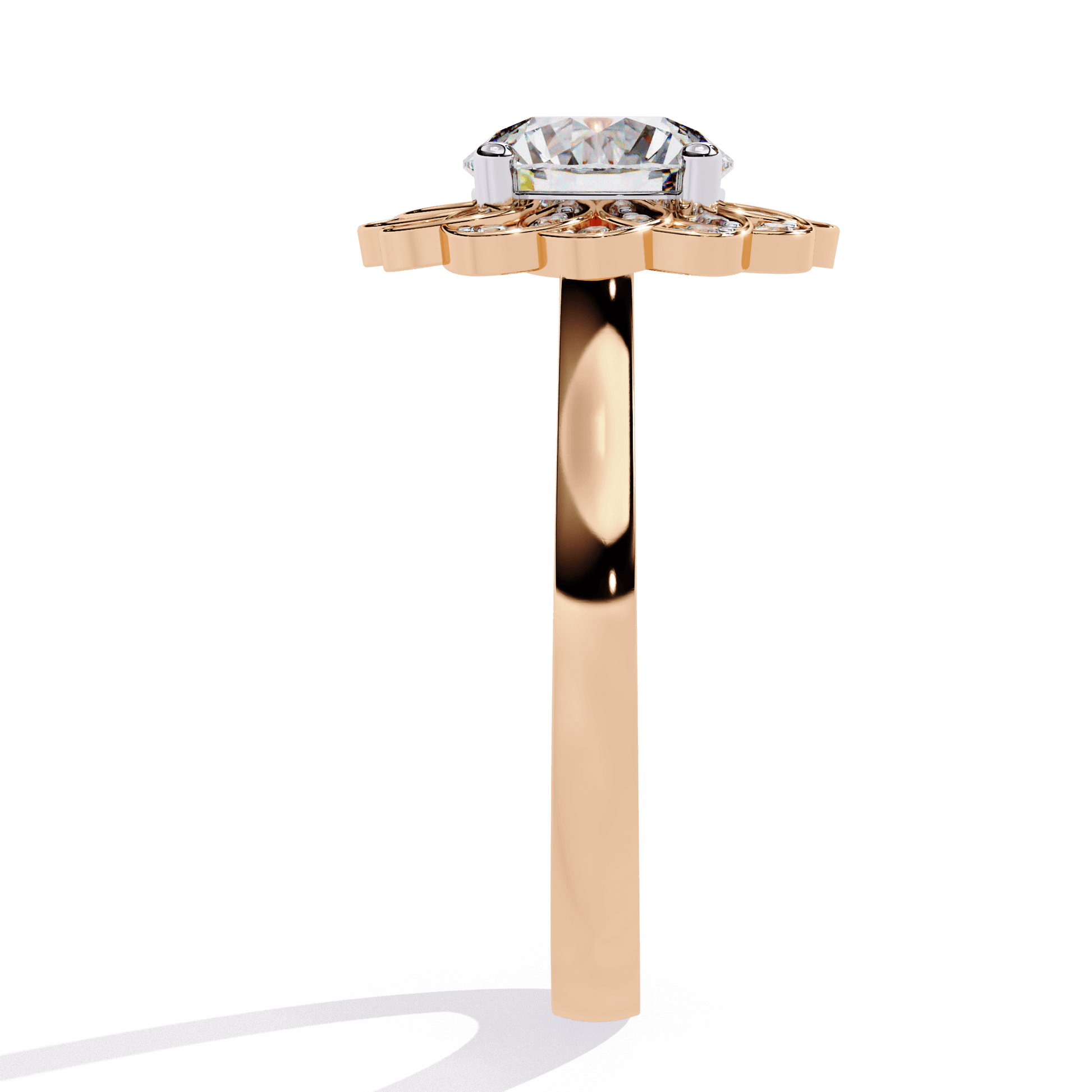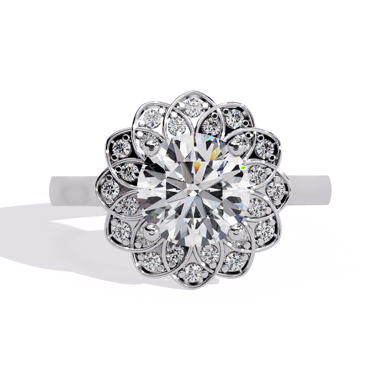Inspired by nature’s beauty, Lilia is a timeless vintage piece with delicate floral charm. At its center, a brilliant Round diamond sits in an elegant cathedral setting, elevated to catch the light. Surrounding it, a vintage-style halo blooms like petals, creating a breathtaking floral silhouette from above.