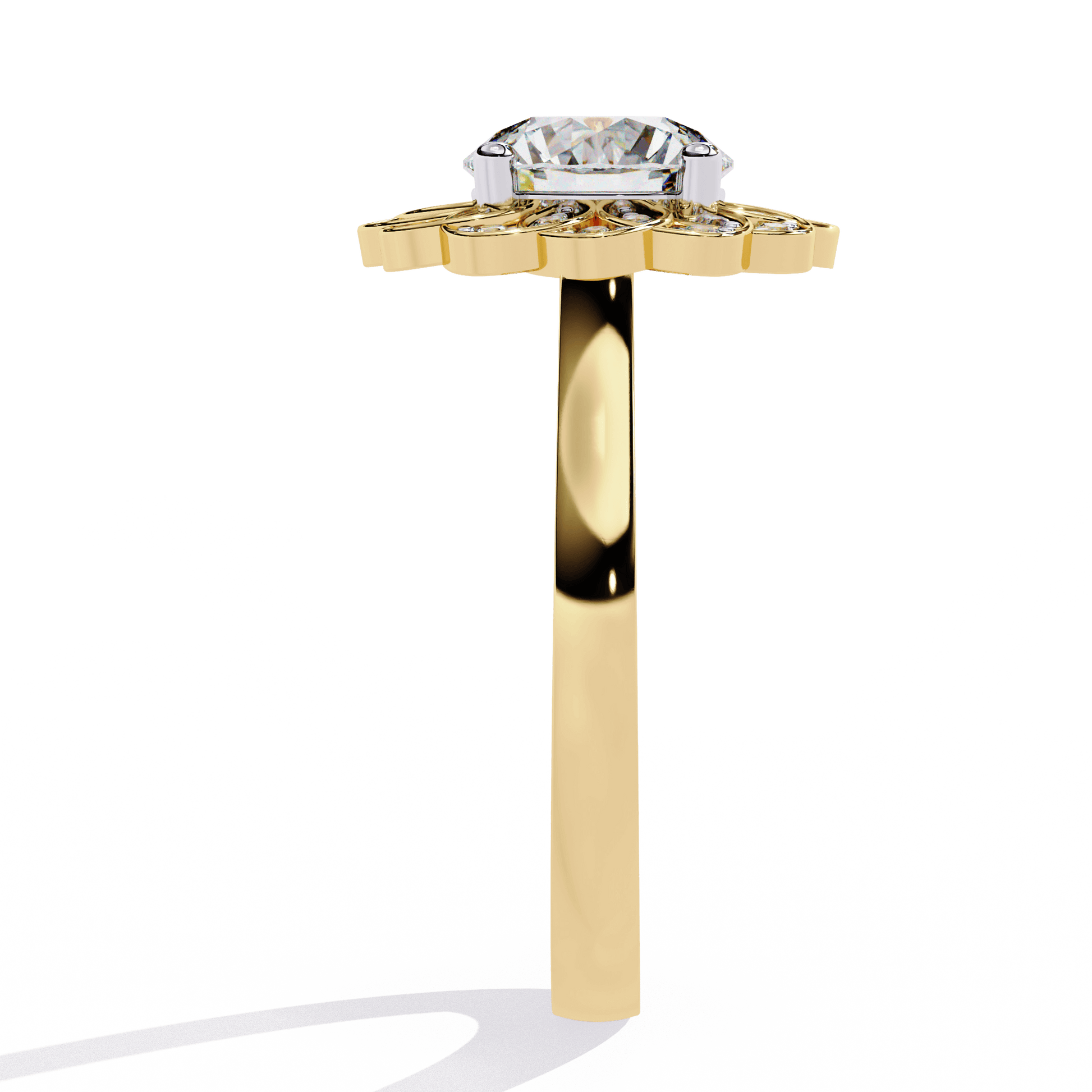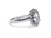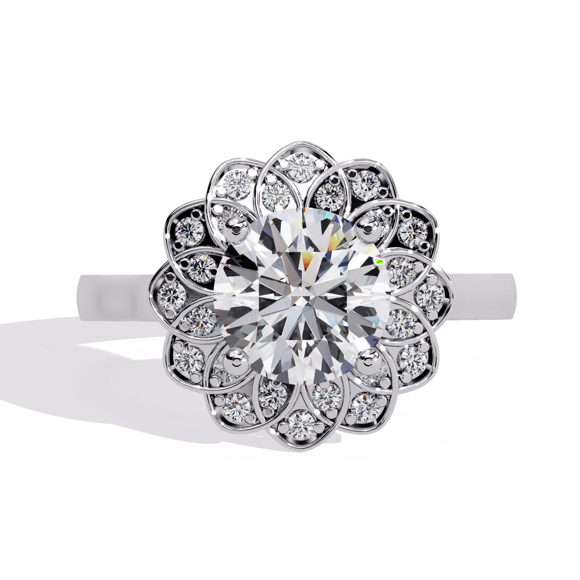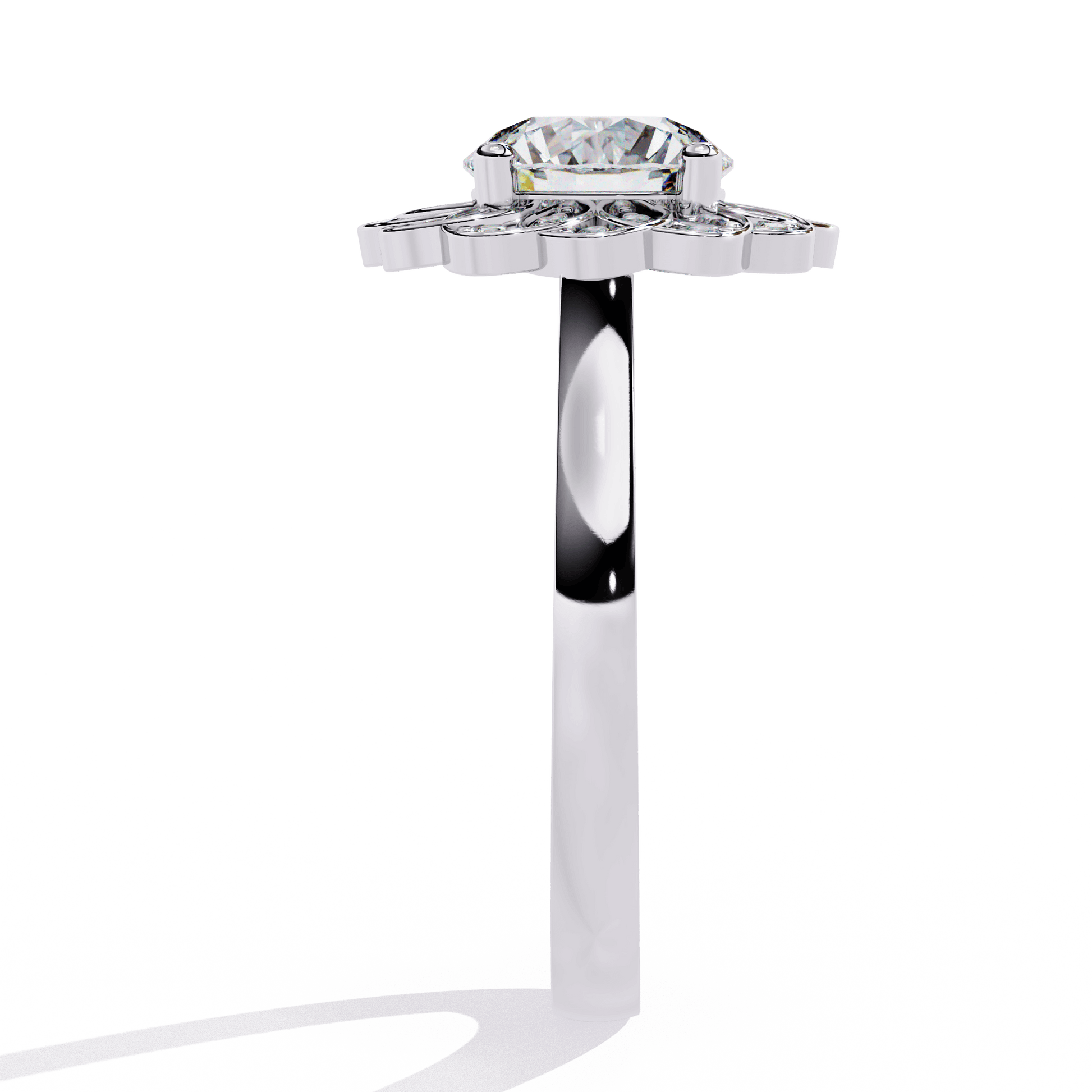 Inspired by nature’s beauty, Lilia is a timeless vintage piece with delicate floral charm. At its center, a brilliant Round diamond sits in an elegant cathedral setting, elevated to catch the light. Surrounding it, a vintage-style halo blooms like petals, creating a breathtaking floral silhouette from above.