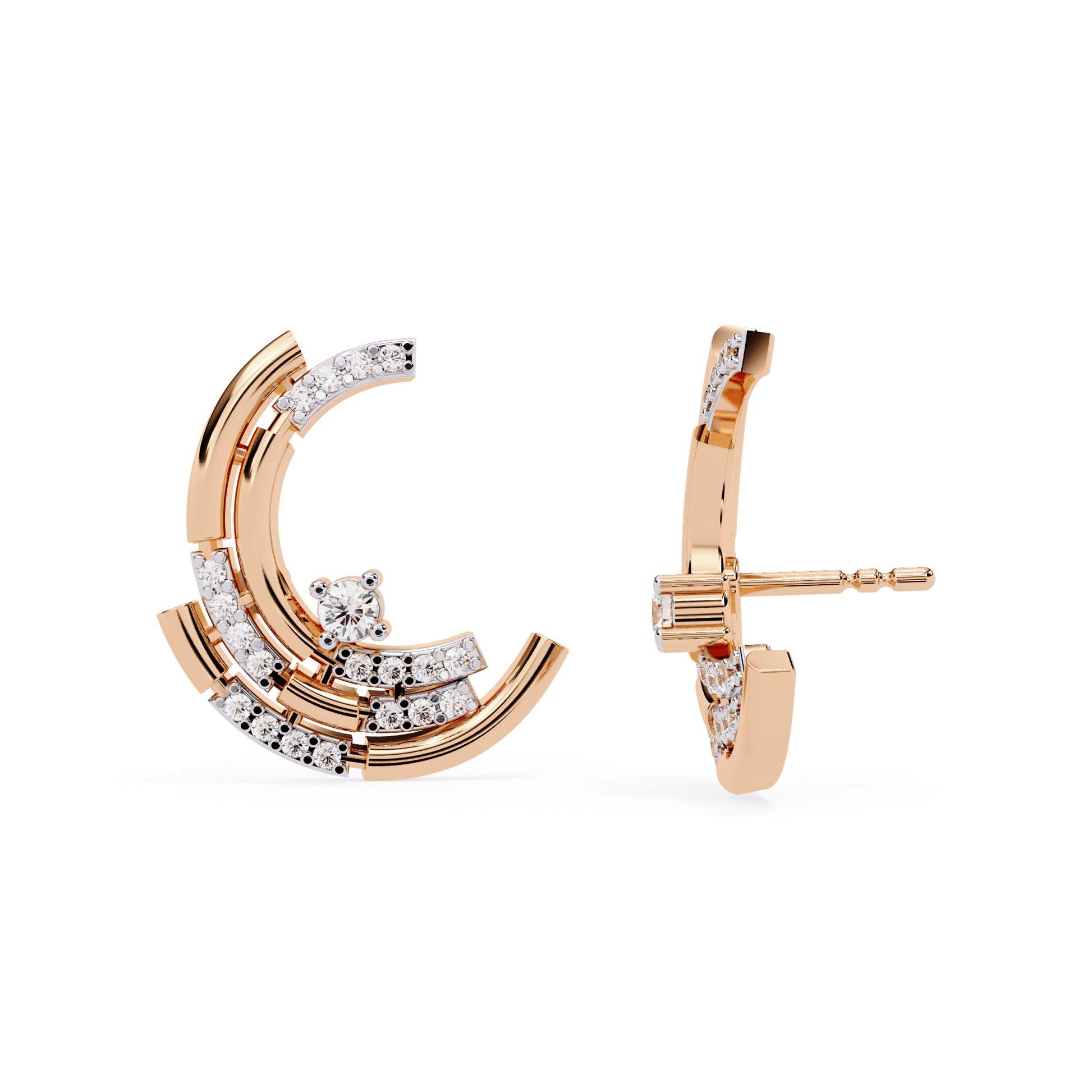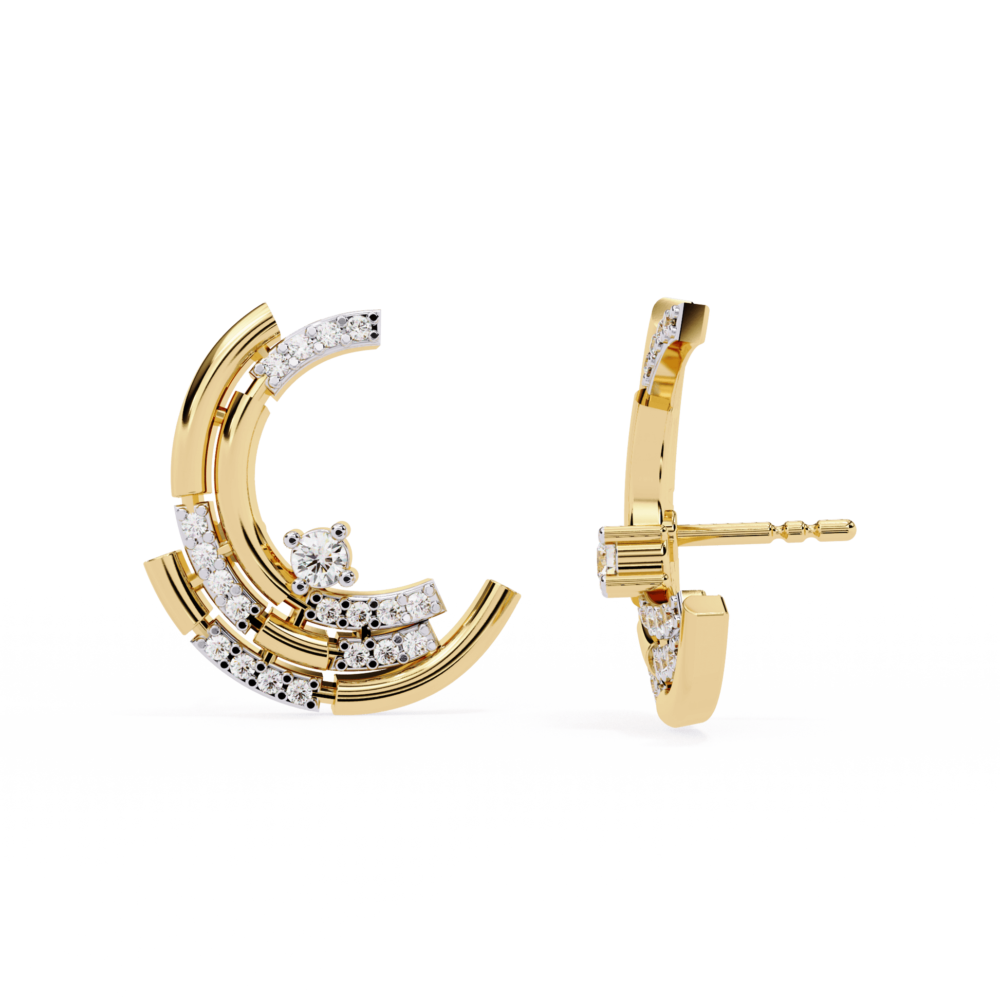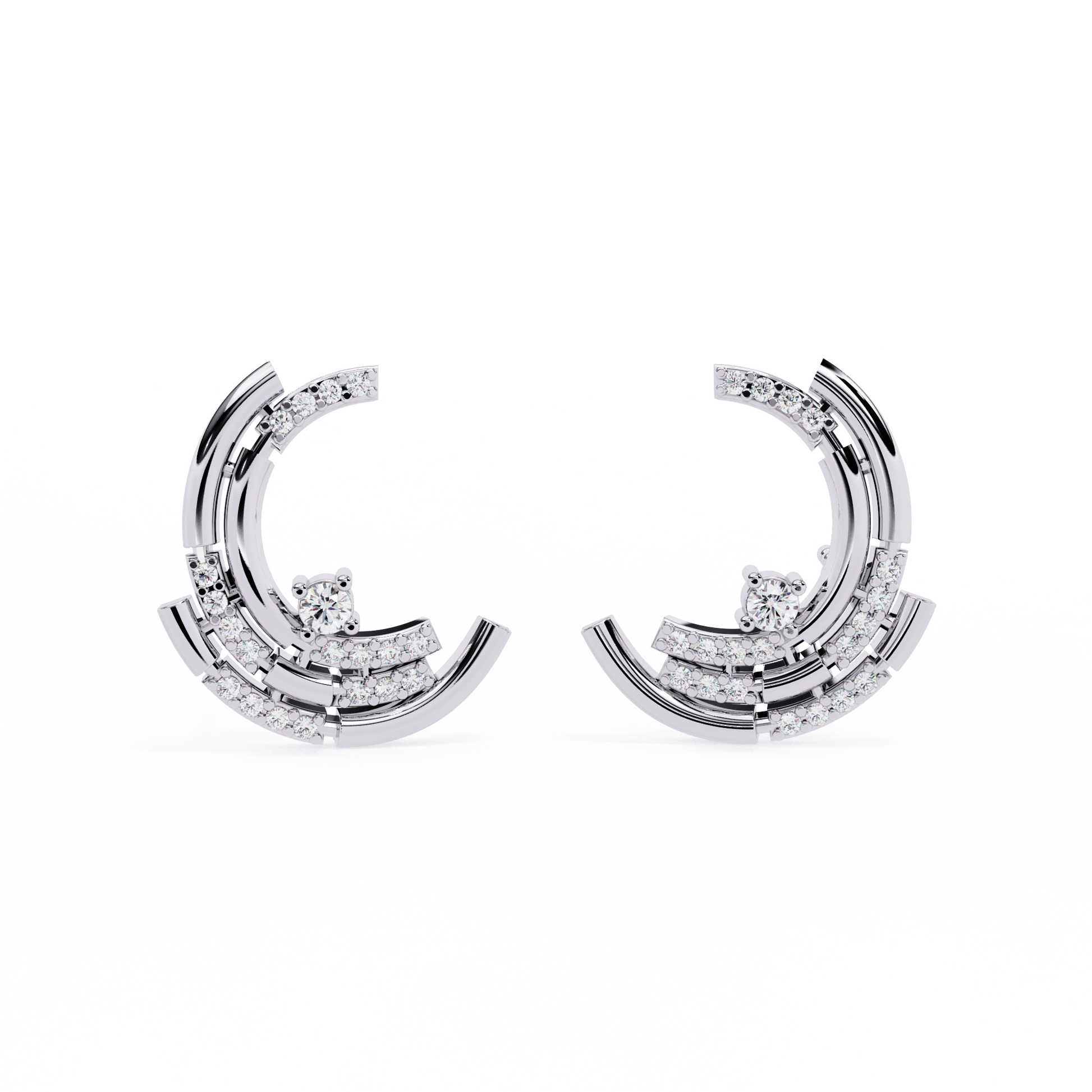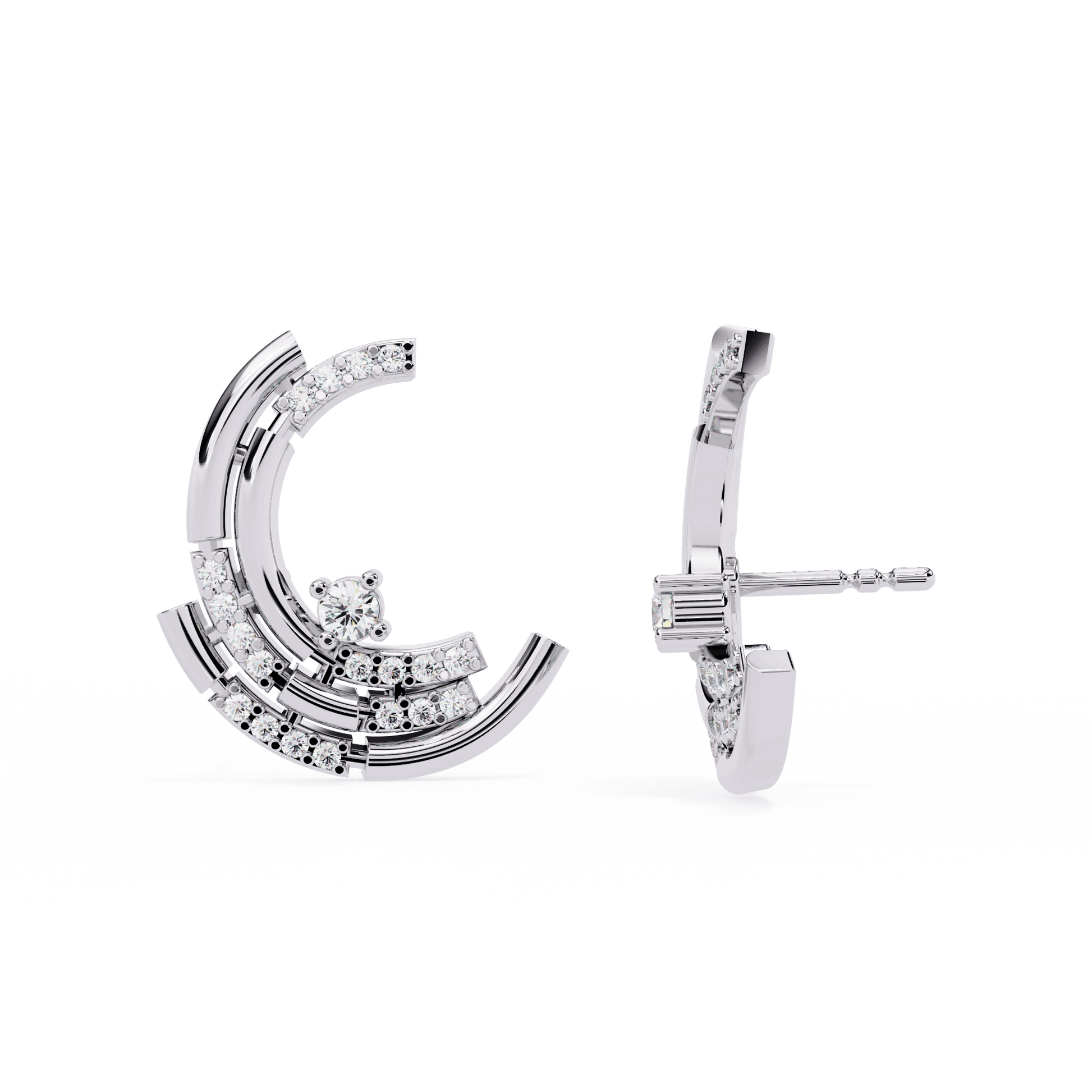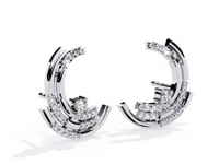 Lyla is a study in modern elegance, defined by precision layering and radiant sparkle. Each stud features a trio of sculpted arcs, stacked to create a striking crescent form. The three tiers are adorned with pavé-set diamonds, adding brilliance to every curve while emphasizing the earring’s architectural flow. With its clean lines and multidimensional silhouette, Lyla brings a refined energy—making it a bold accent for both daywear and evening ensembles.