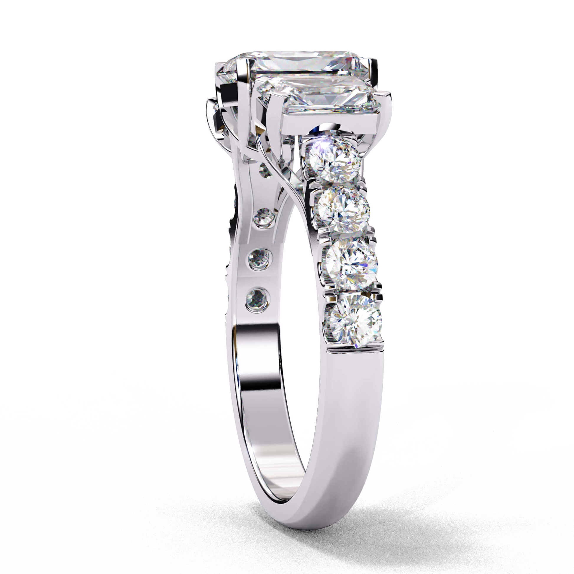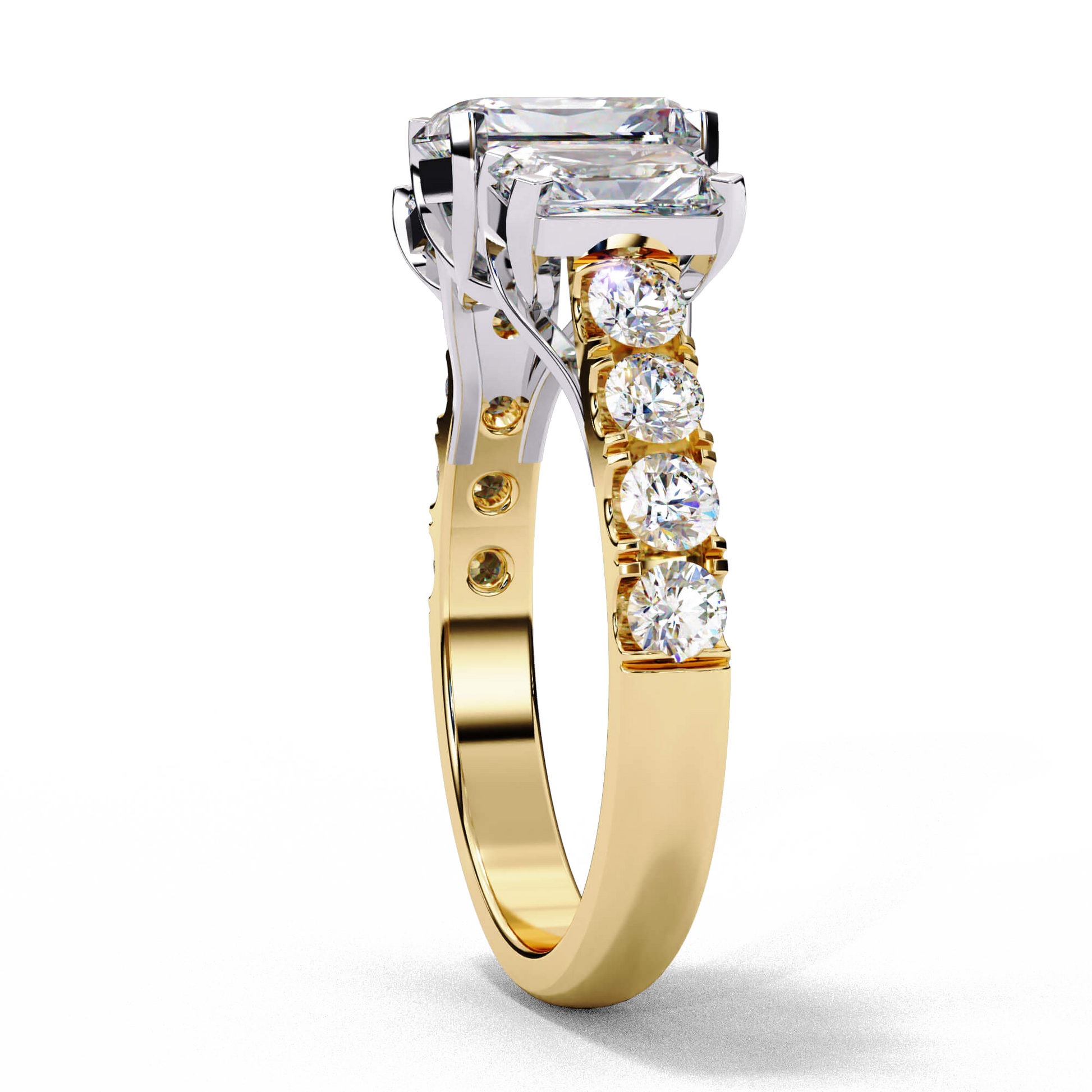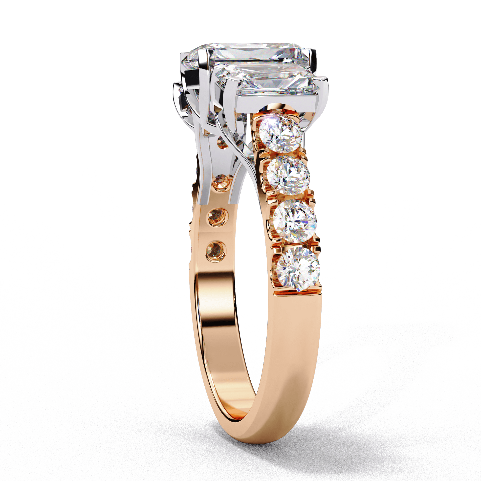 Marianna is a striking two-tone, three-stone radiant ring, beautifully designed to embody timeless elegance. The center radiant-cut diamond is flanked by two matching side stones, adding depth and brilliance.