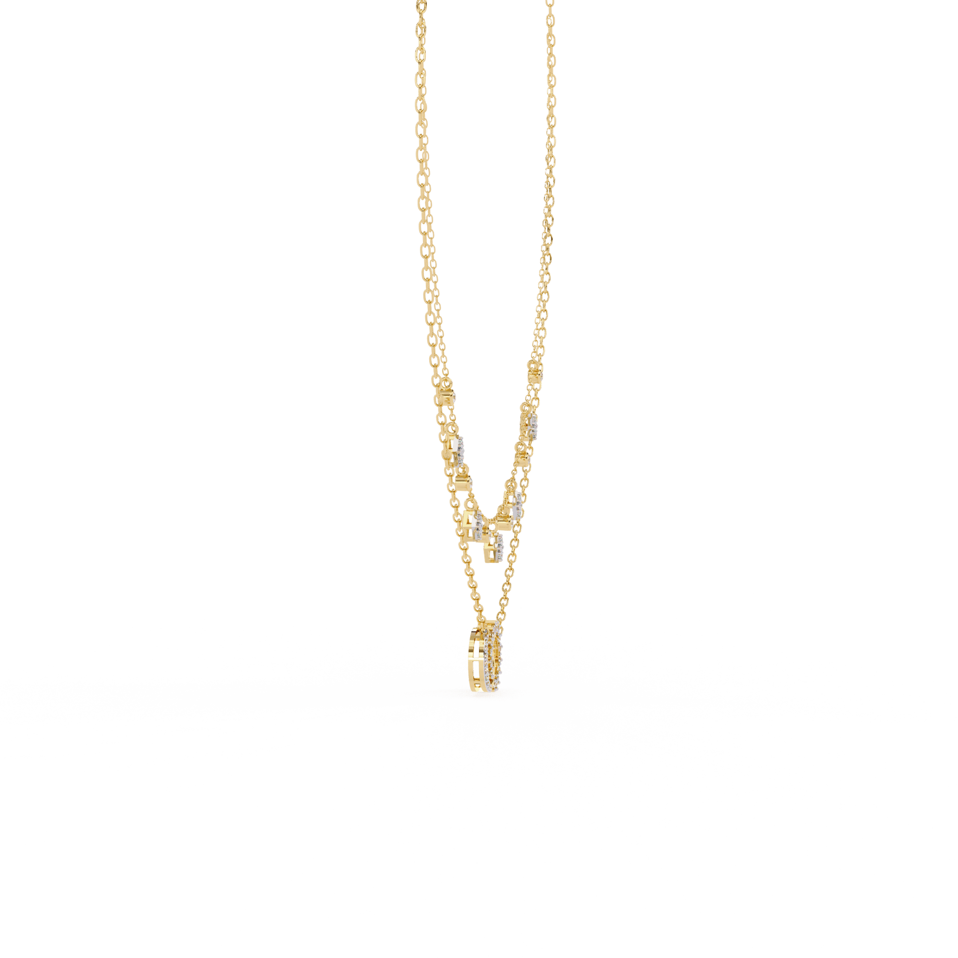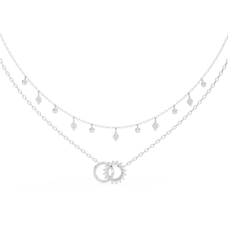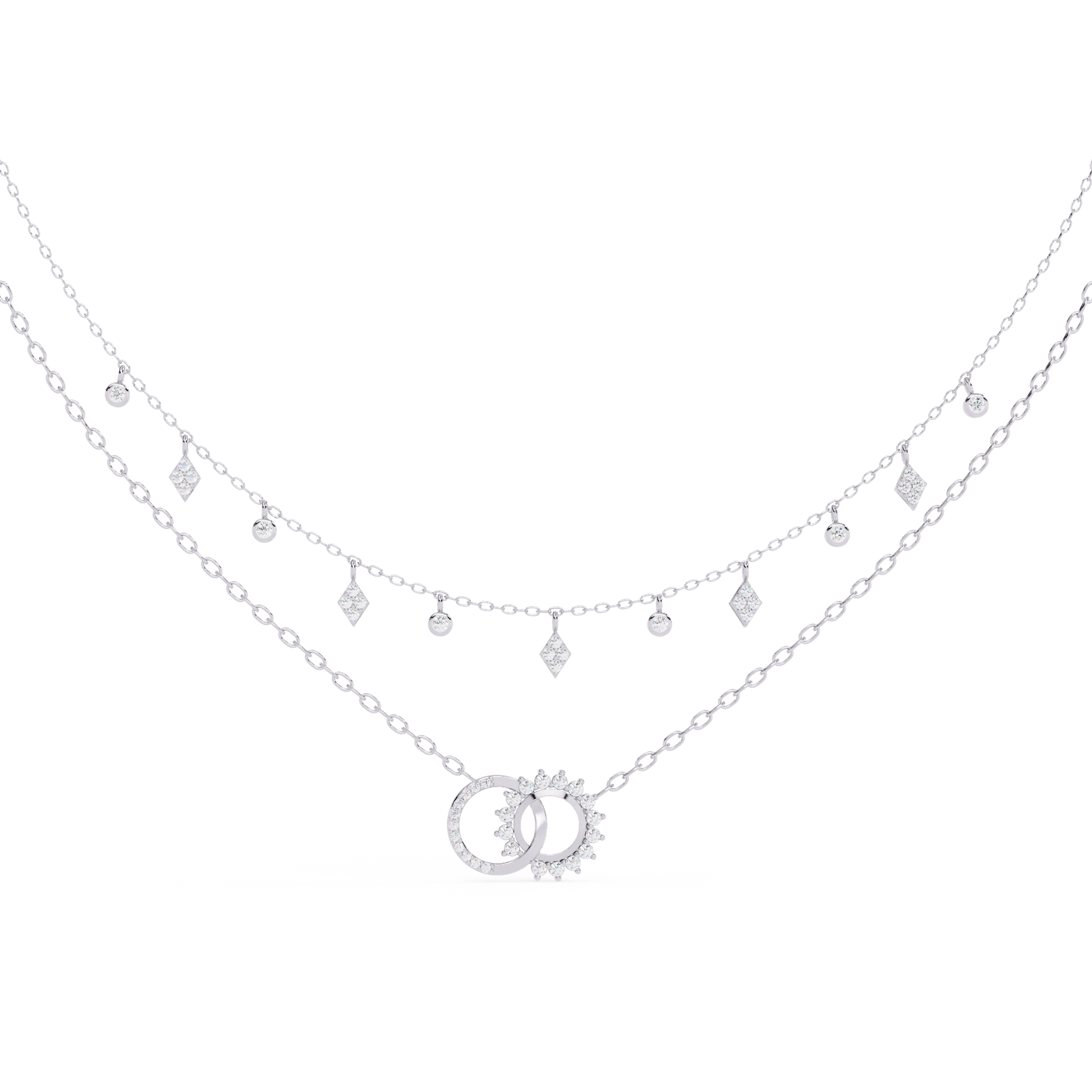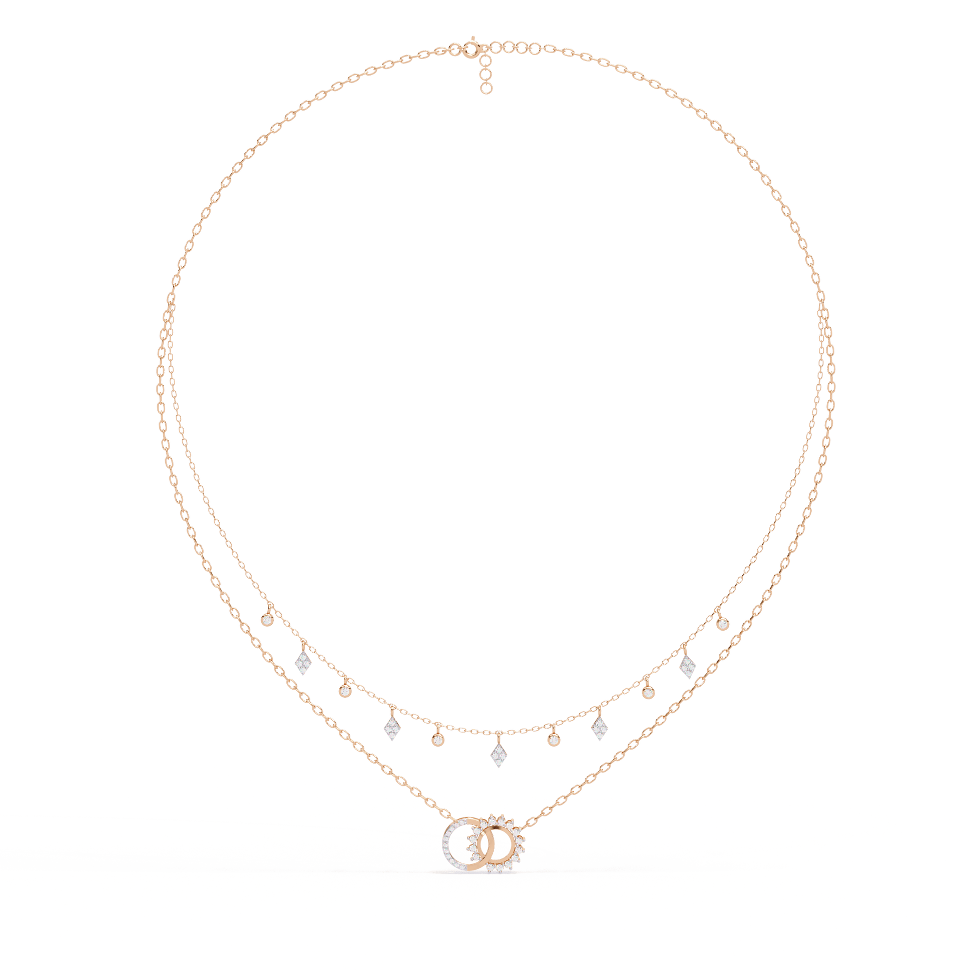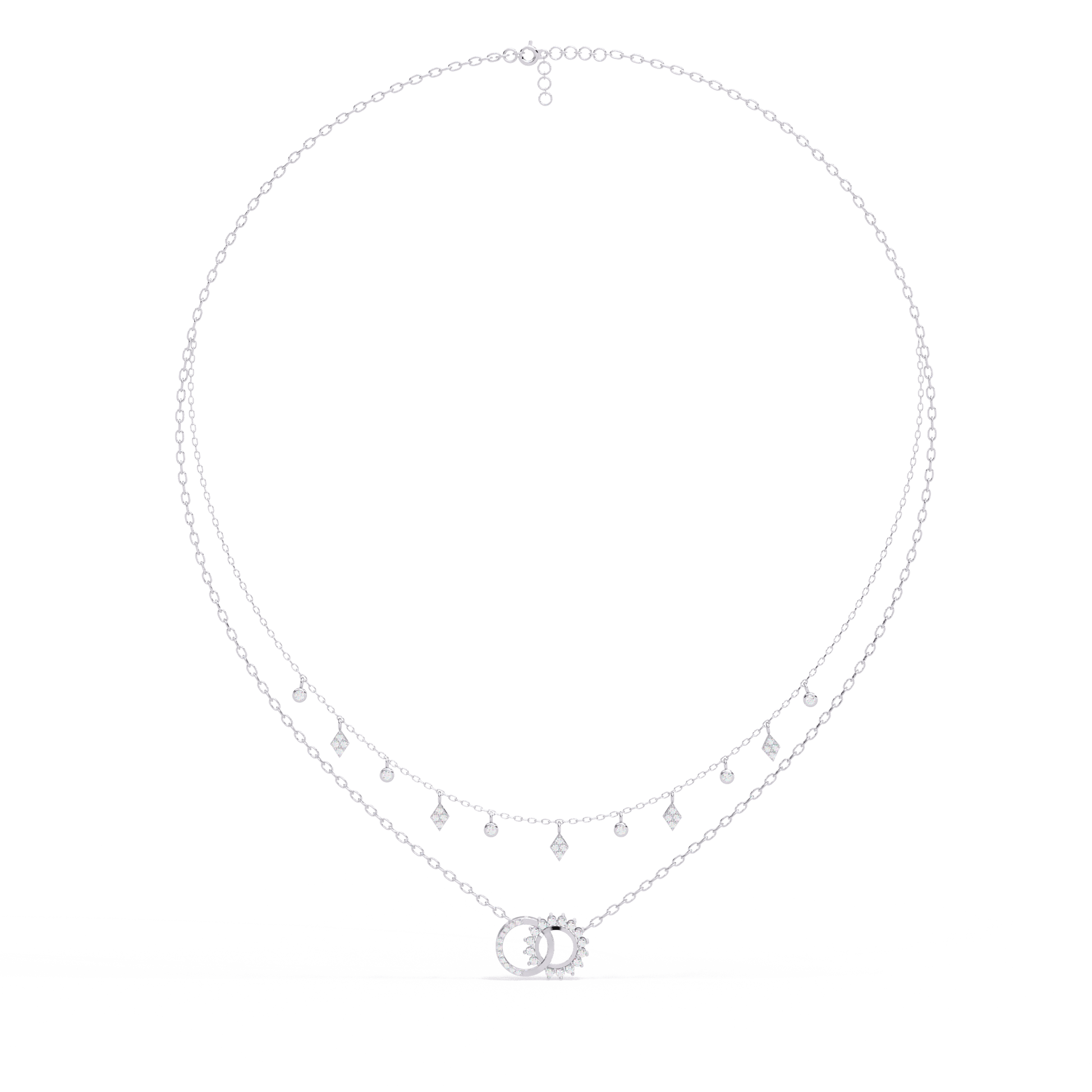 A celestial-inspired composition of light and form, the Miranda necklace features two delicate chains that create an enchanting layered silhouette. The upper chain is adorned with alternating bezel-set round diamonds and intricate kite-shaped motifs, each set with four fine diamonds. Below, two interlocking circles rest in harmony — one with half pavé-set diamonds, the other glowing with a halo — symbolising duality and eternal connection.