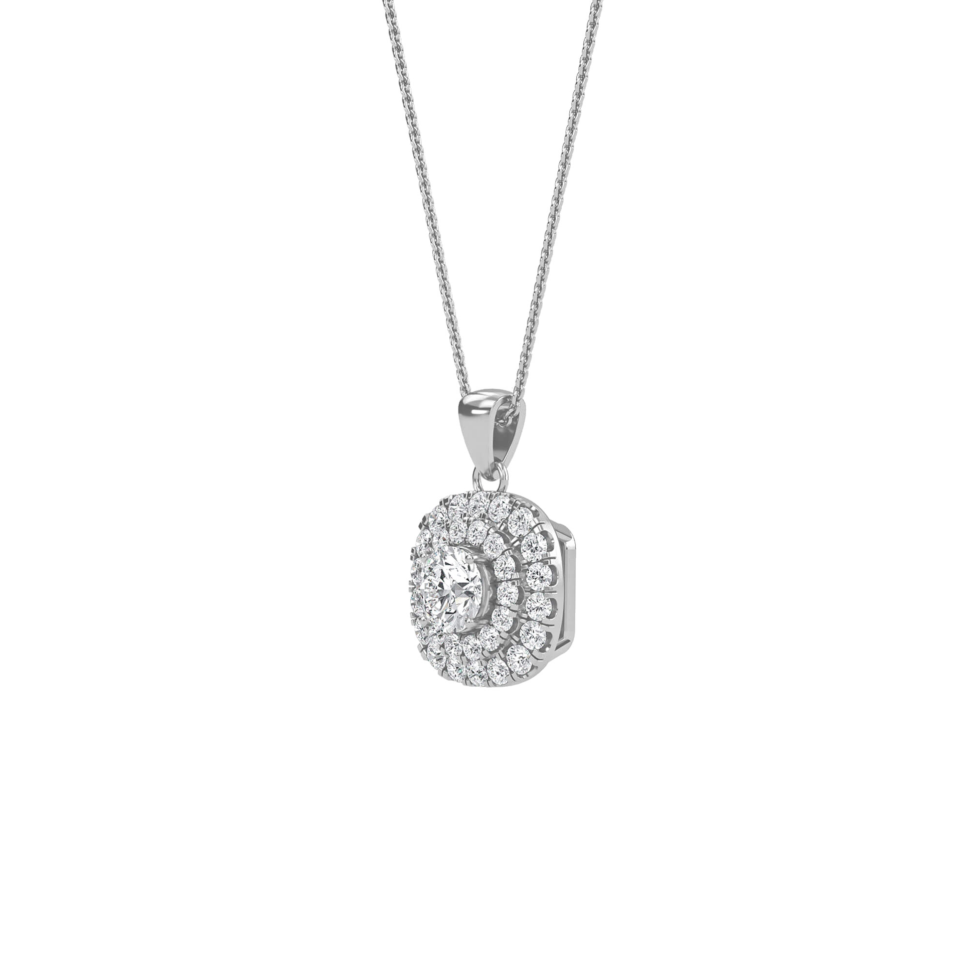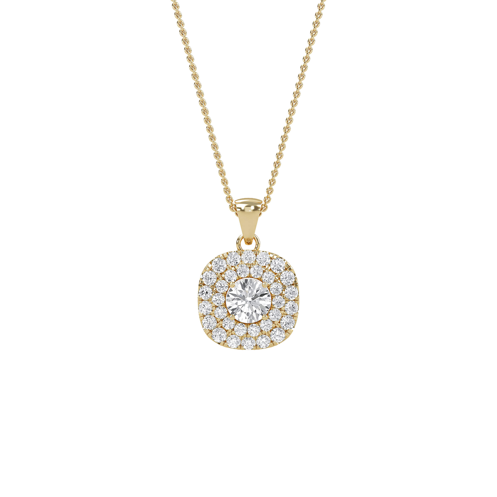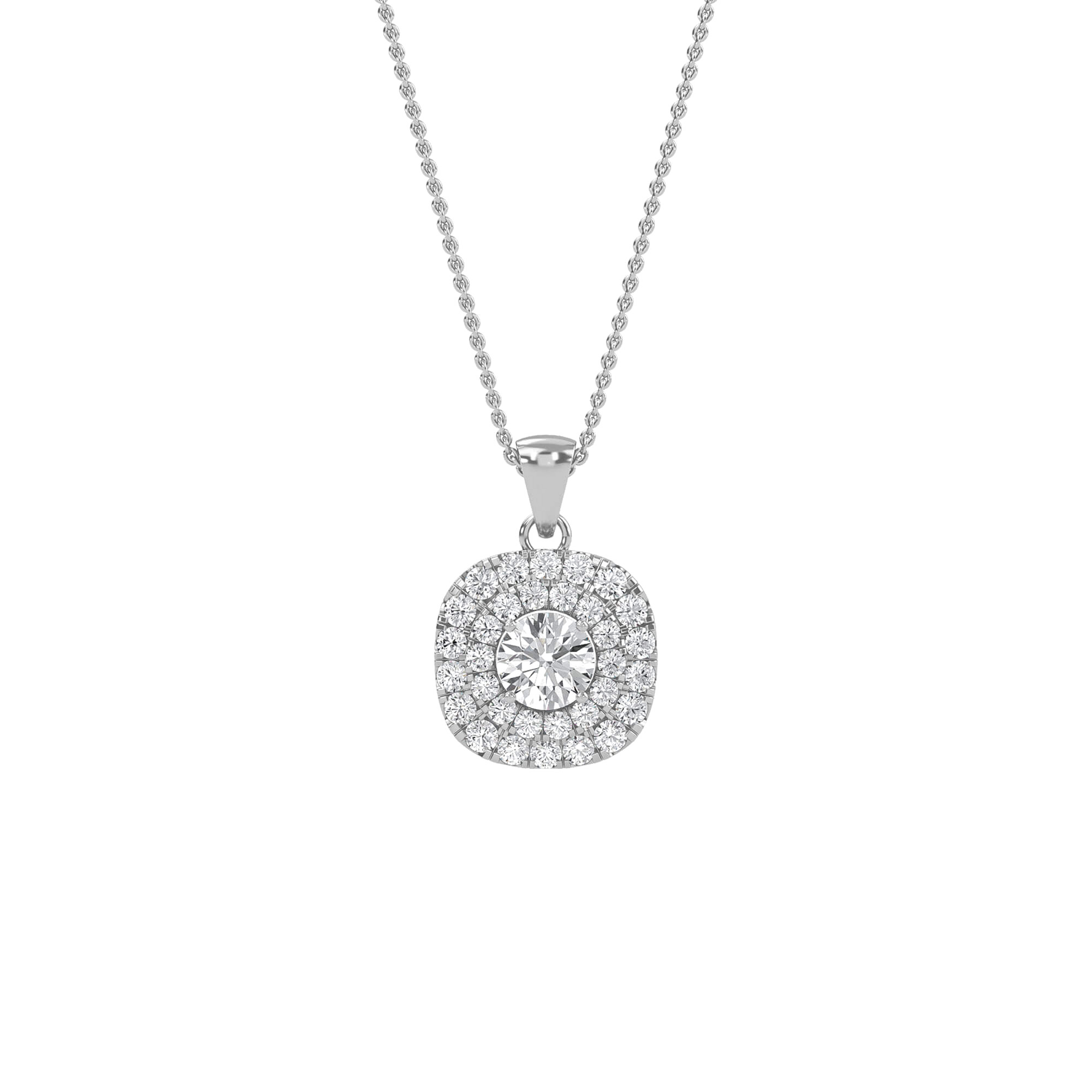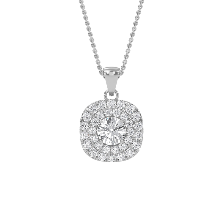 A luminous statement of grace and brilliance, Nina showcases a round-cut solitaire diamond encircled by two delicate halos of perfectly matched round accent stones. The cushion-shaped pendant brings soft curves and classic symmetry to a timeless silhouette, offering an elevated touch of radiance.