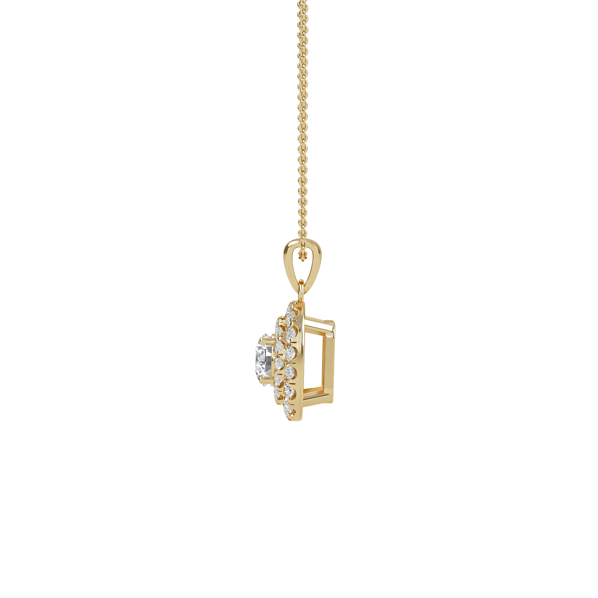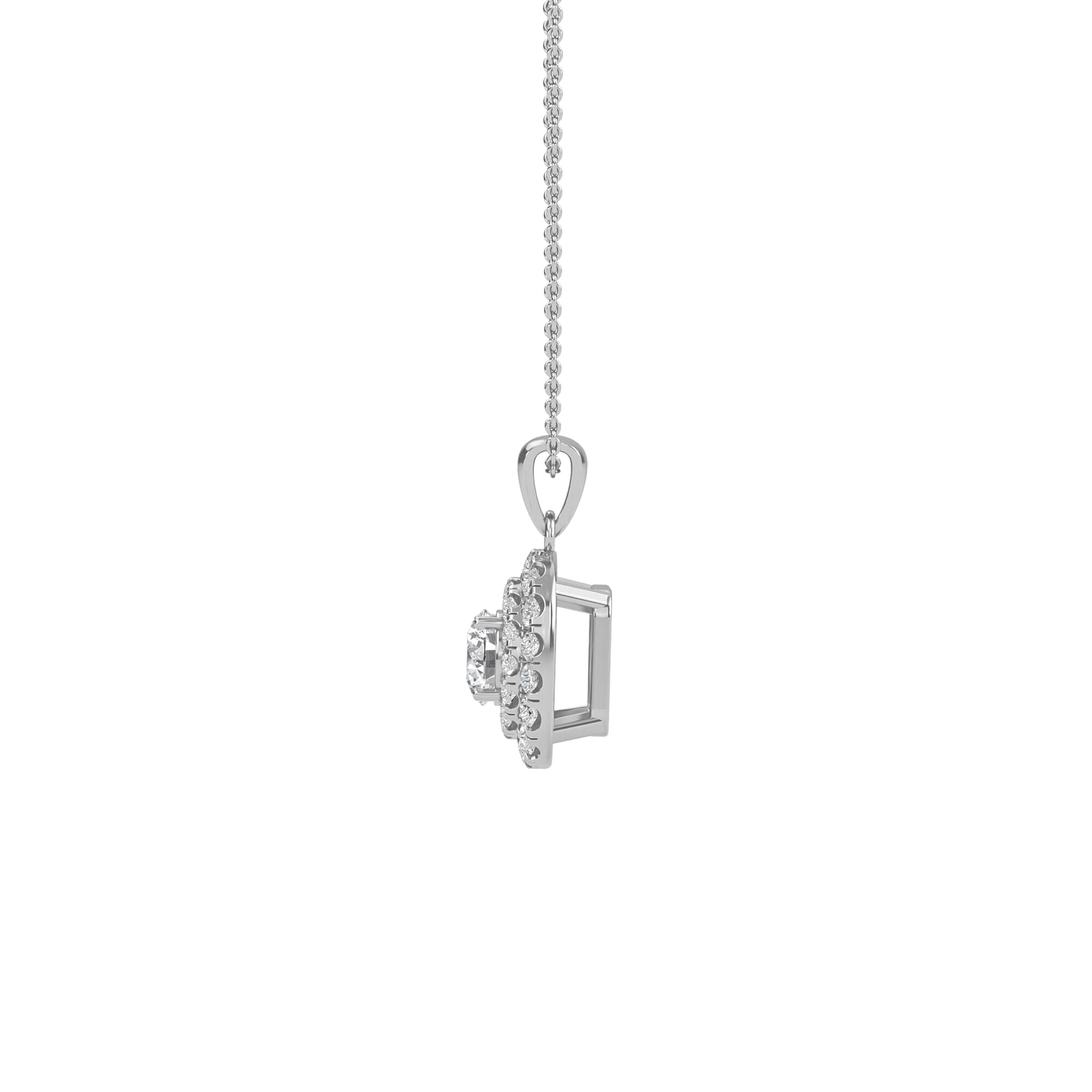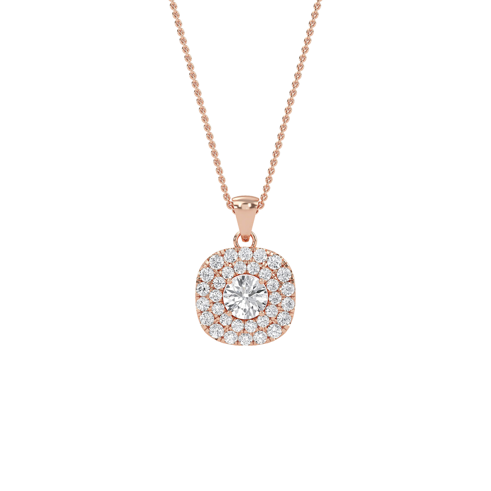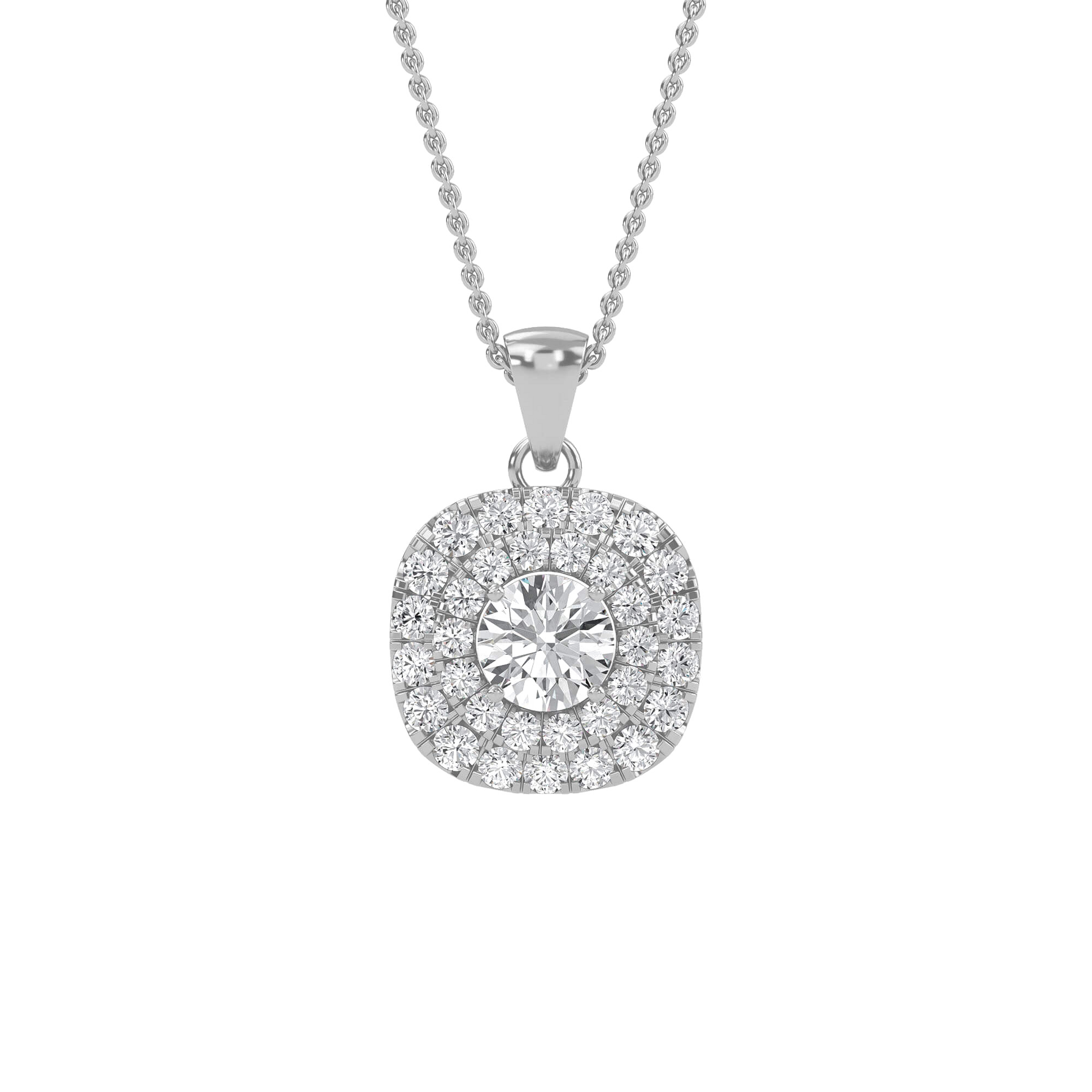 A luminous statement of grace and brilliance, Nina showcases a round-cut solitaire diamond encircled by two delicate halos of perfectly matched round accent stones. The cushion-shaped pendant brings soft curves and classic symmetry to a timeless silhouette, offering an elevated touch of radiance.