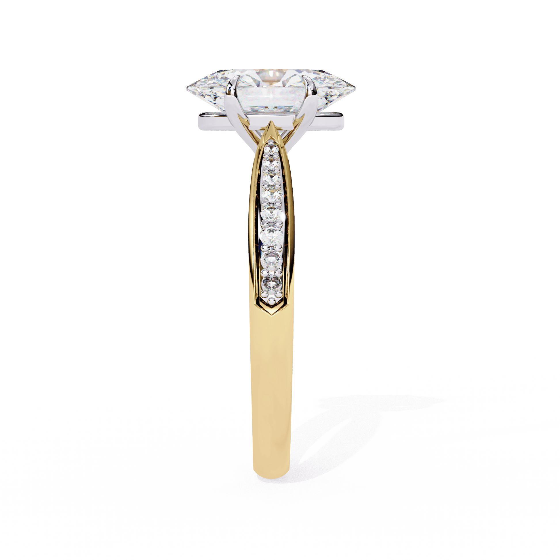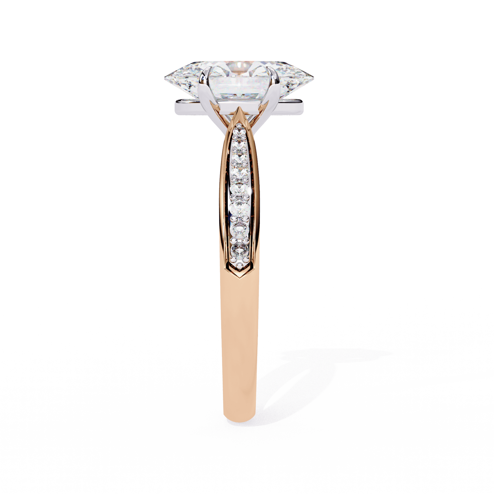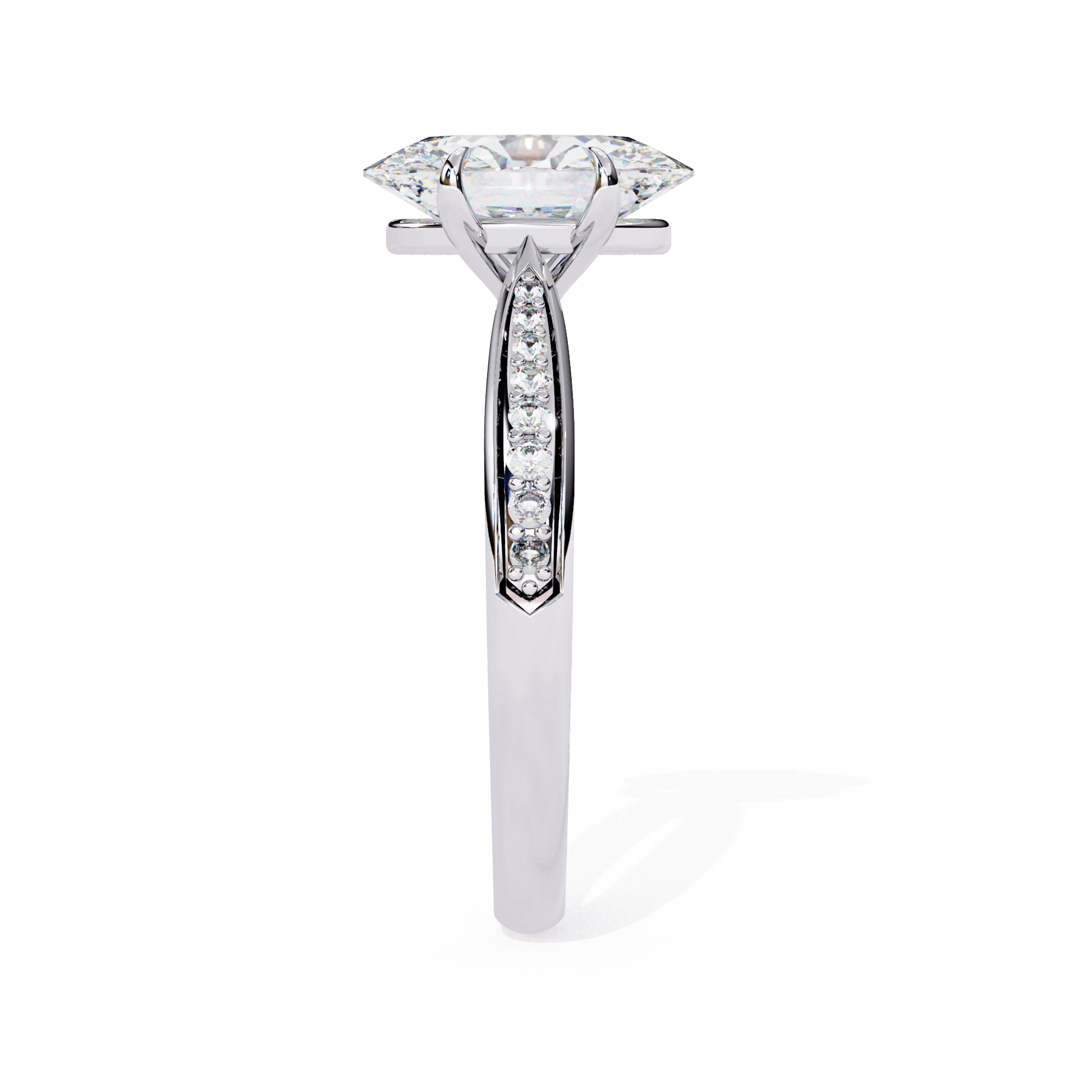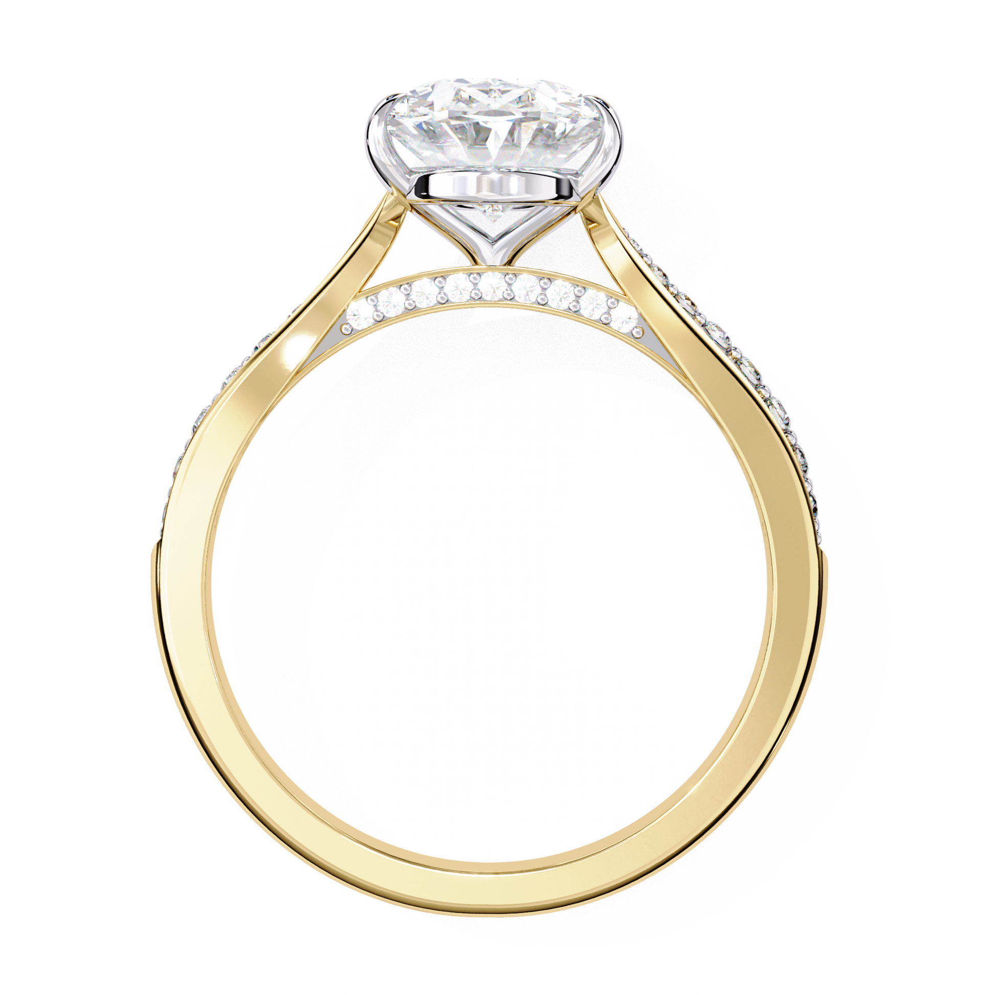 Odessa features a stunning Oval-cut center stone set in a four-claw setting with a gallery rail. The cathedral design lifts the stone, while tapered channel-set side stones add sparkle. Diamonds along the bridge of the cathedral adds a hidden touch of brilliance.