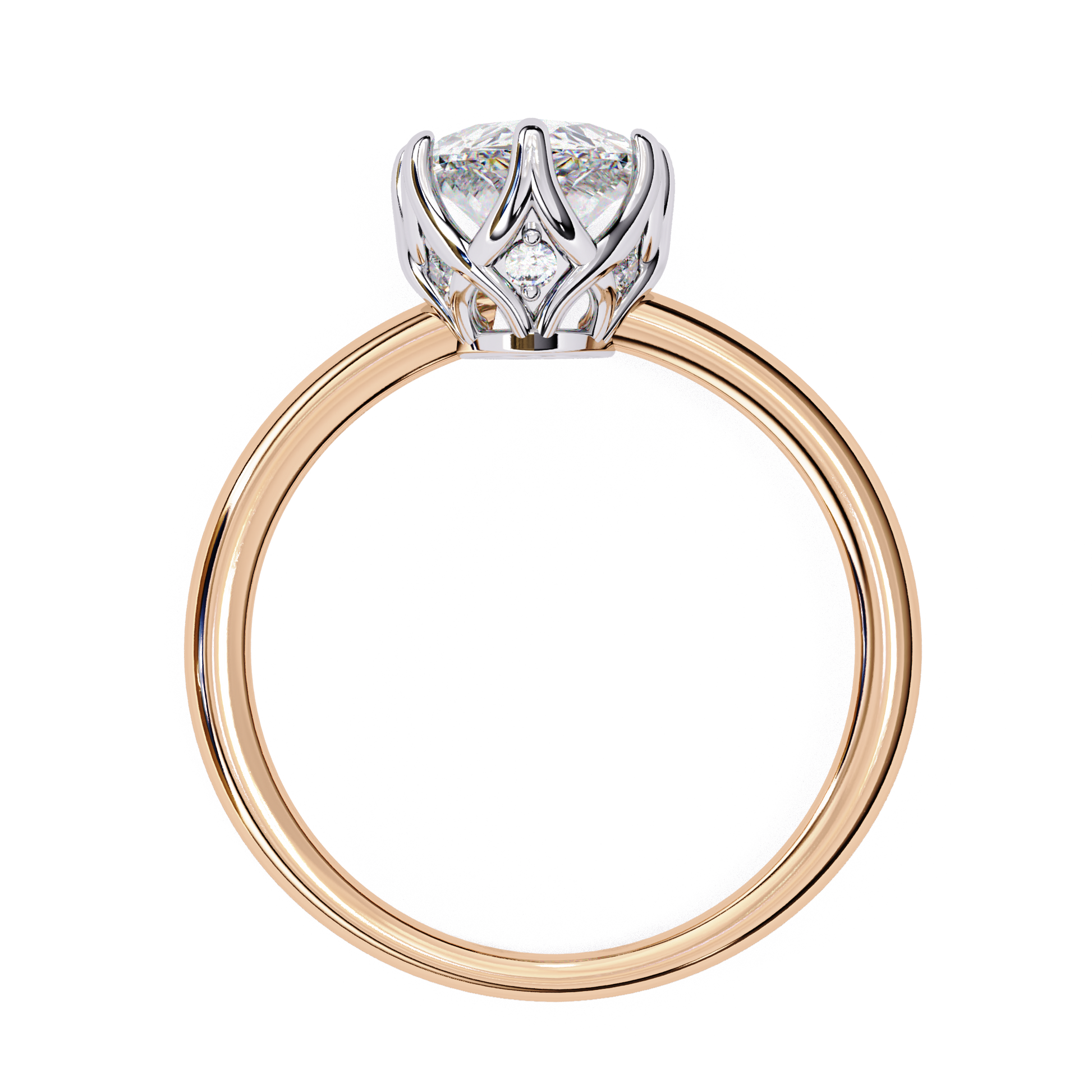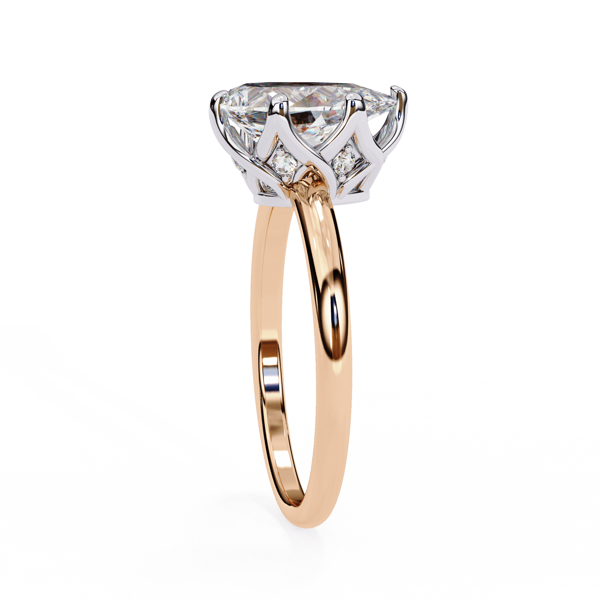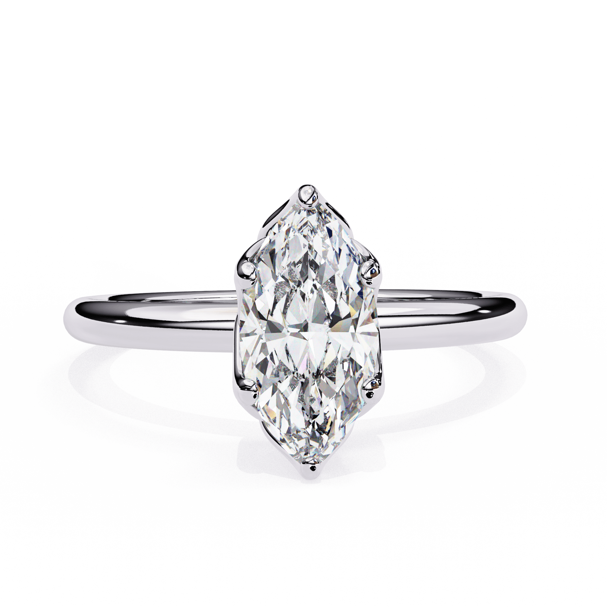 Odette features an Marquise-cut center stone in a flush tulip setting, creating a smooth, seamless silhouette. Delicate diamond accents nestle within the tulip prongs, adding a subtle touch of brilliance. The refined design balances modern minimalism with intricate detailing, making it effortlessly elegant.