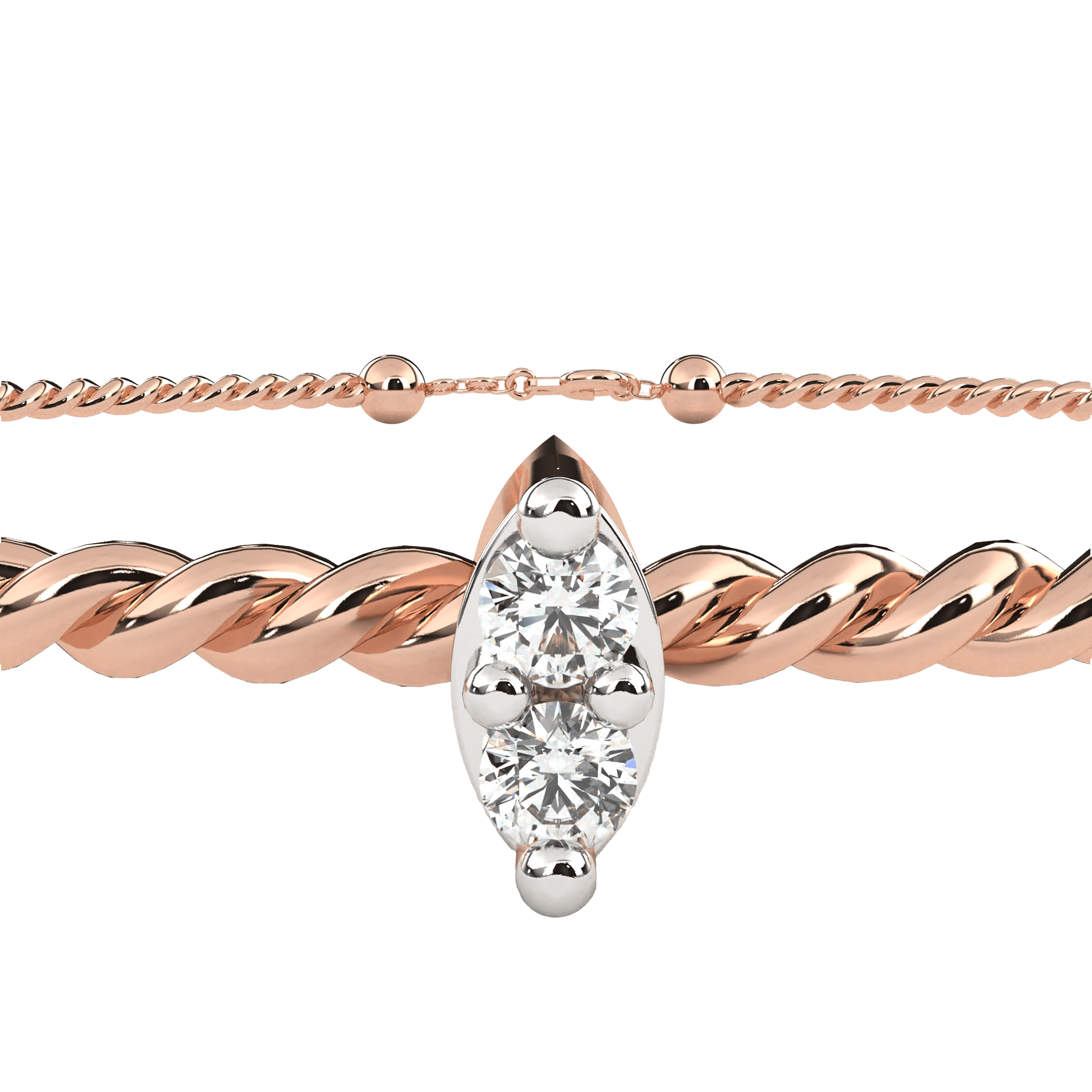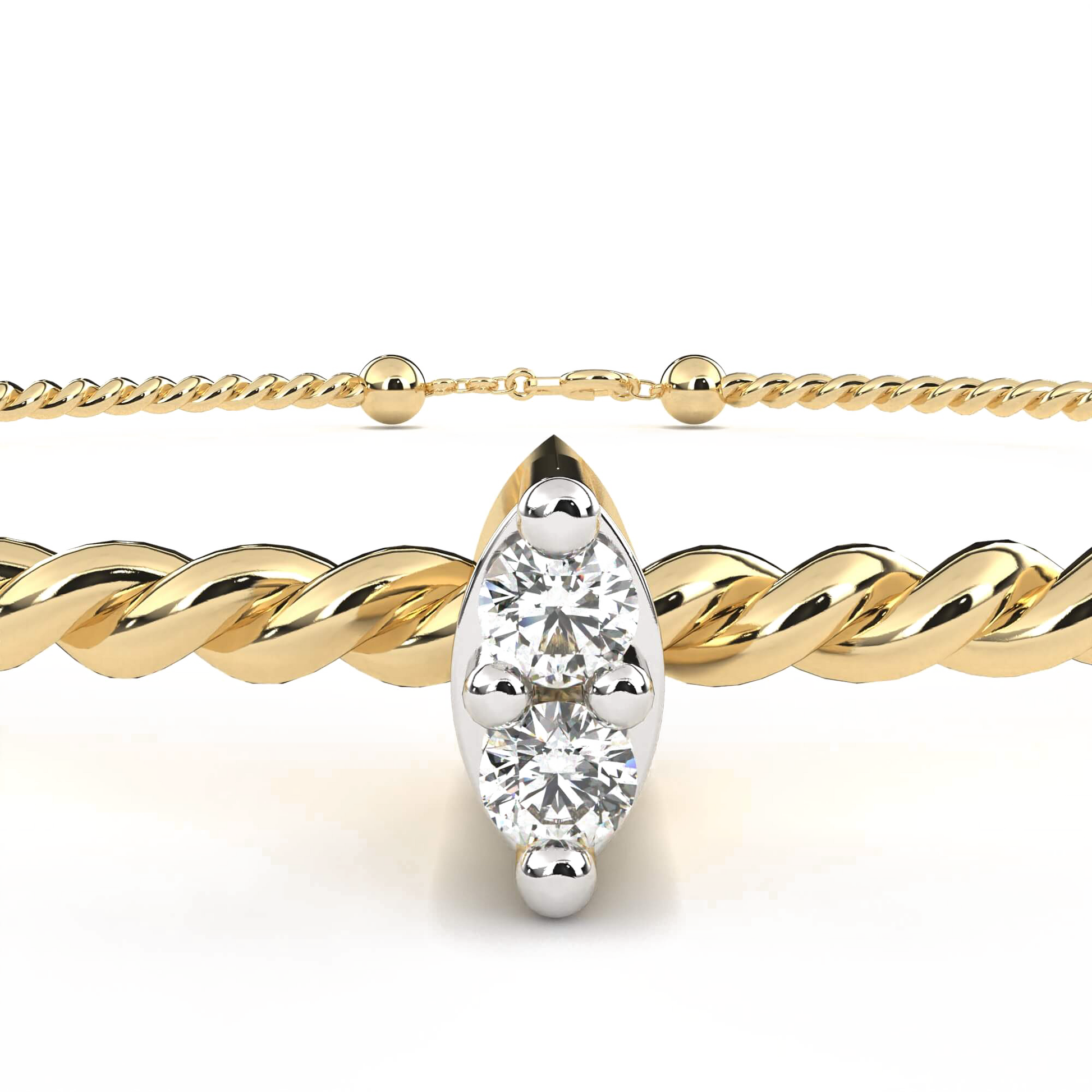 A study in subtle elegance, Parisa features two brilliant round diamonds set within a sleek marquise-shaped bezel, gently curved to follow the line of a twisted gold bangle. The contrast between texture and polish adds dimension, while the minimalist setting allows the diamonds to shine with quiet brilliance. Designed to wear effortlessly alone or as part of a stack, Parisa brings a touch of refined sparkle to any occasion.