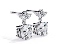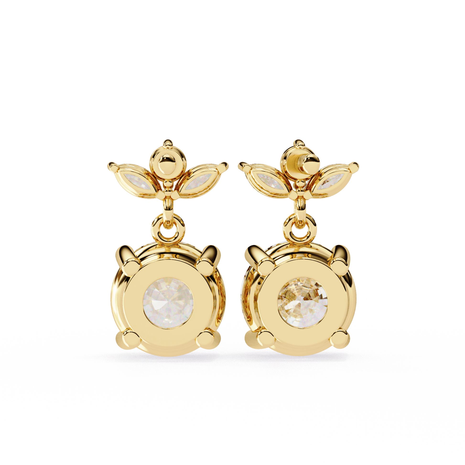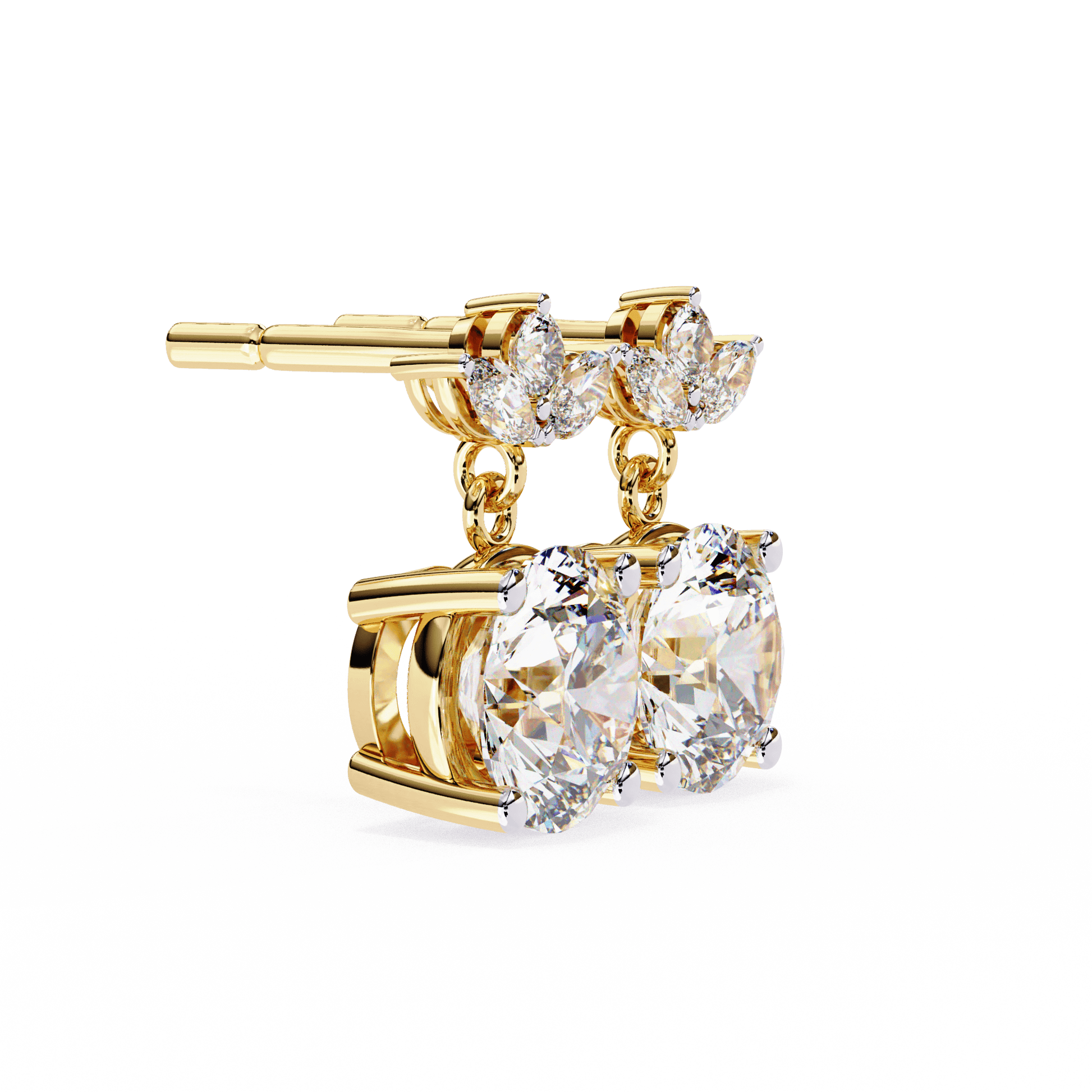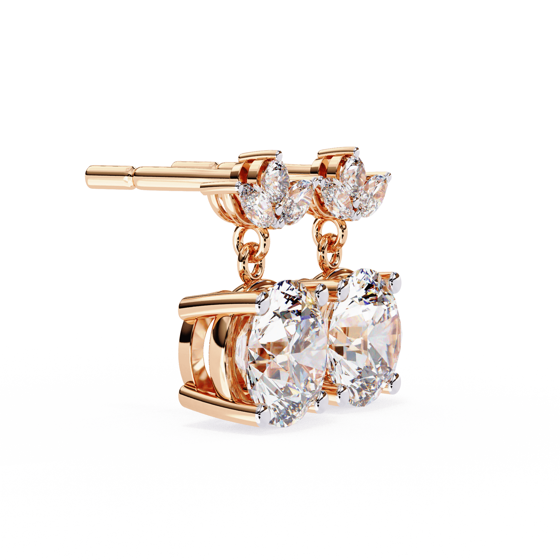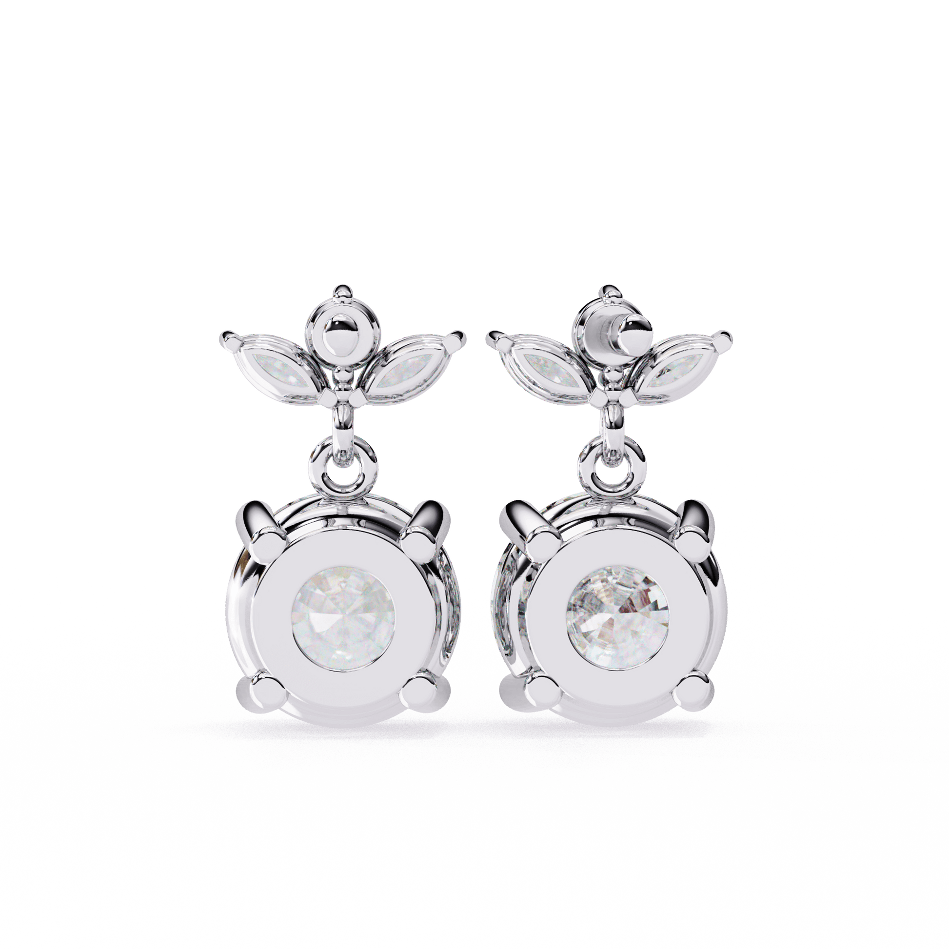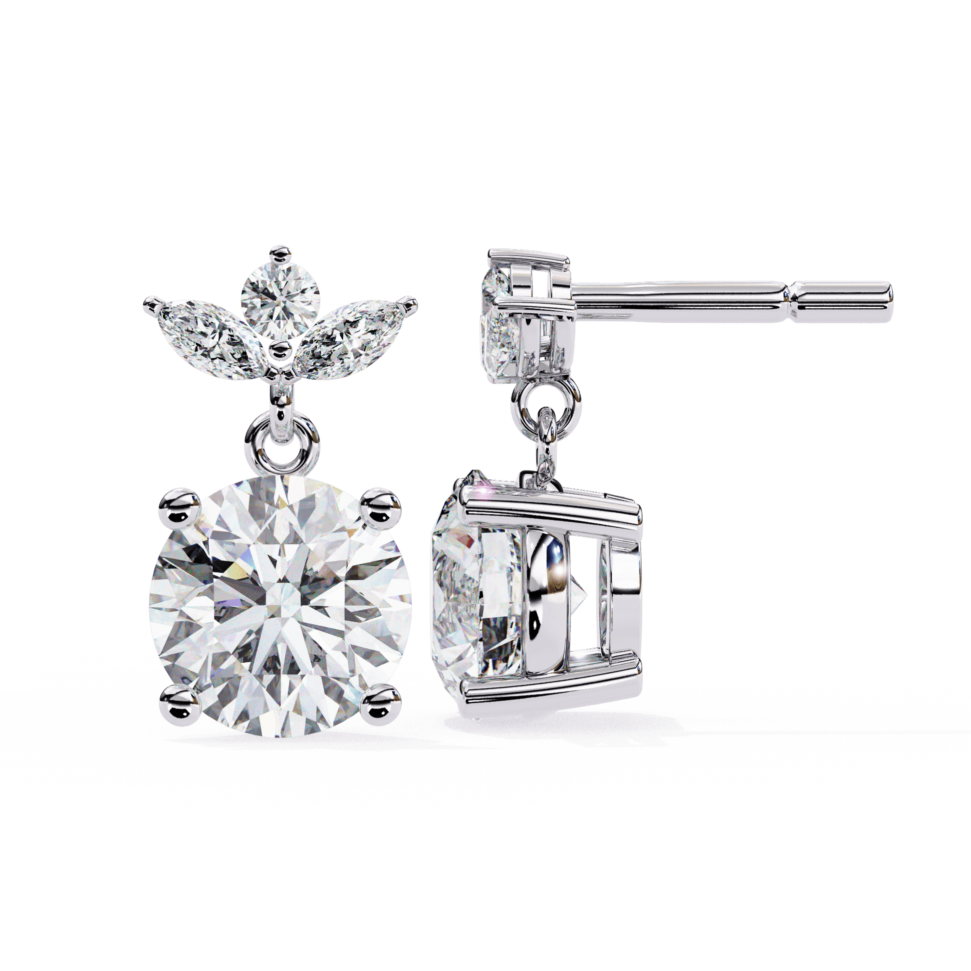 Priscilla is an ode to refined balance and botanical grace. At the top, a petite round diamond is framed by two marquise-cut stones, forming a delicate leaf-like trio. This elegant cluster gives way to a singular, brilliant round-cut diamond suspended below—its bold sparkle contrasting beautifully with the fine detailing above. With its timeless floral silhouette and soft articulation, Priscilla is a perfect match for modern bridal elegance or elevated everyday wear.