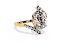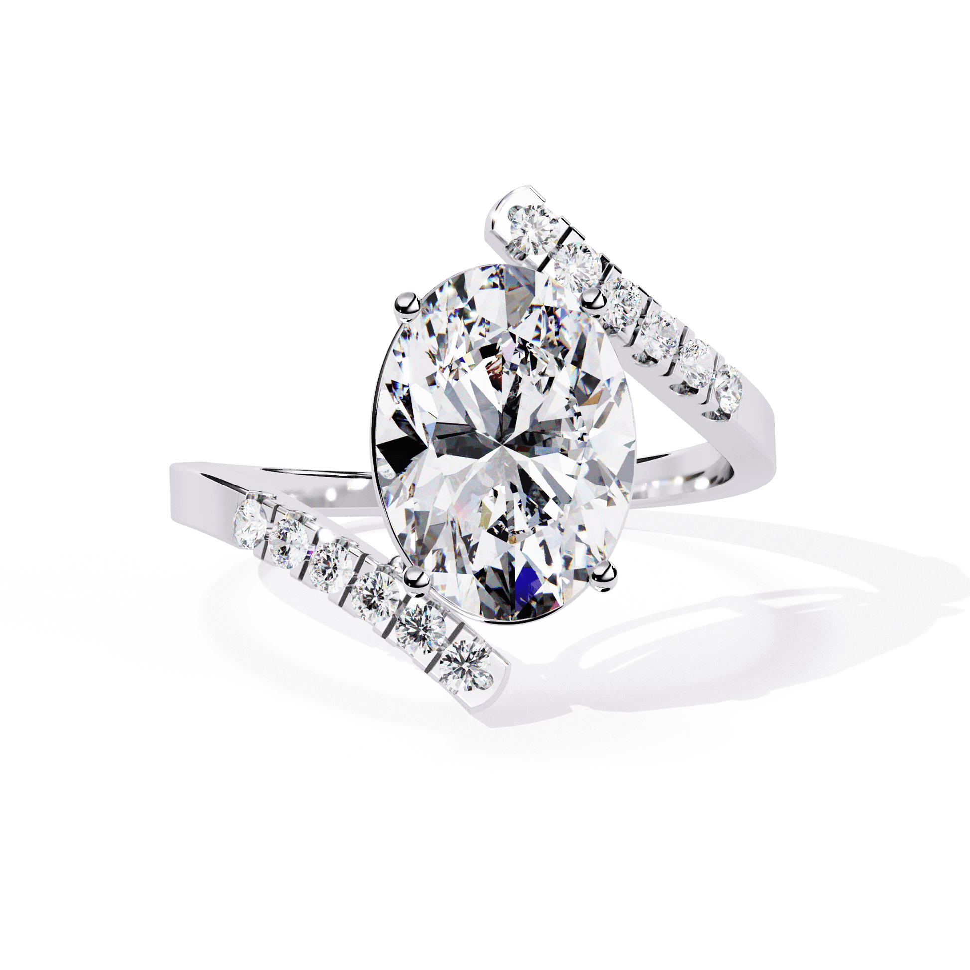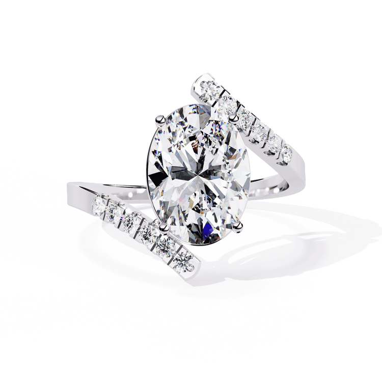 Exuding fluidity and elegance, Adele is a masterpiece of movement and form. Her bypass shank sweeps gracefully around the finger, cradling a luminous Oval-cut diamond in a delicate 4-prong basket setting. The unique design allows both sides of the bypass to hold the center stone, creating a seamless harmony between structure and brilliance.