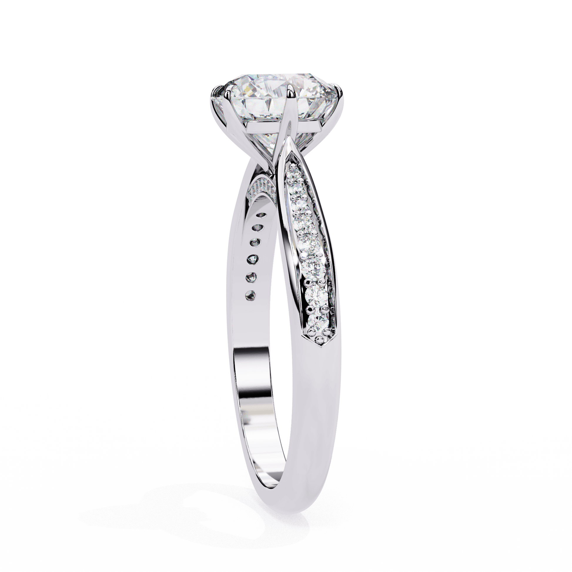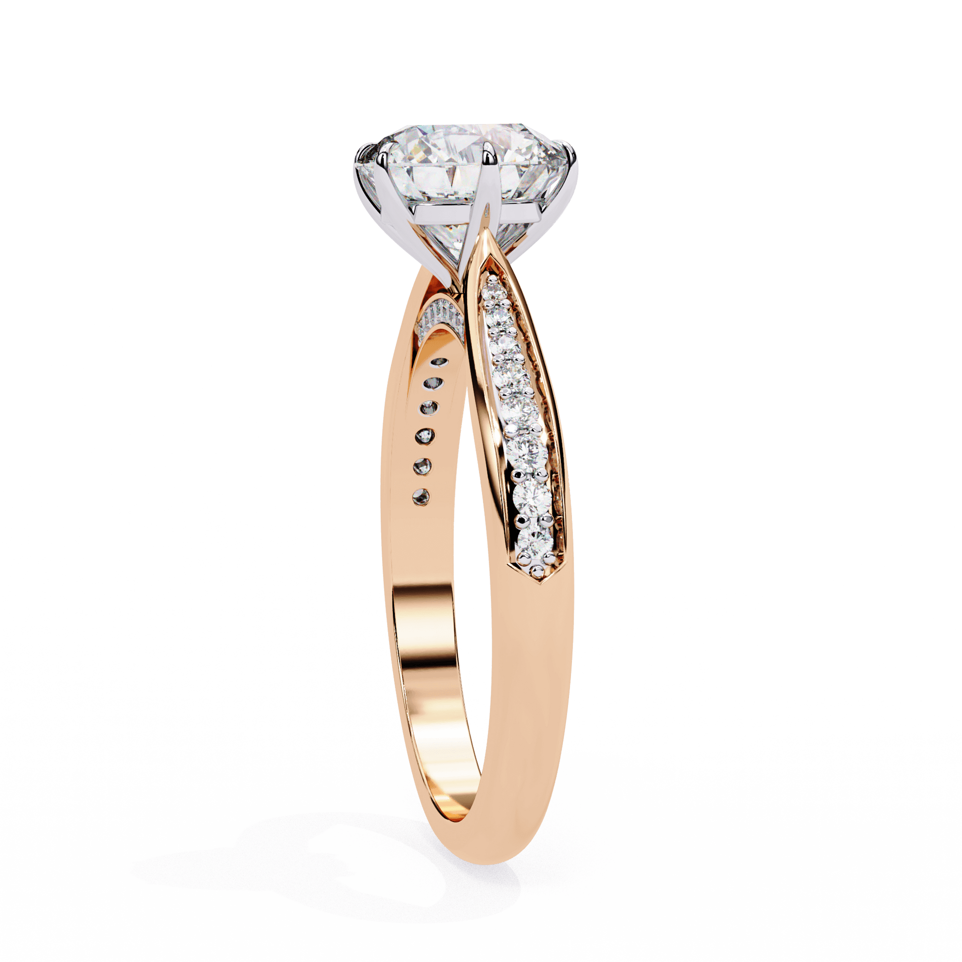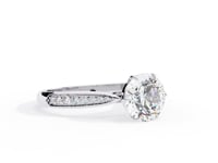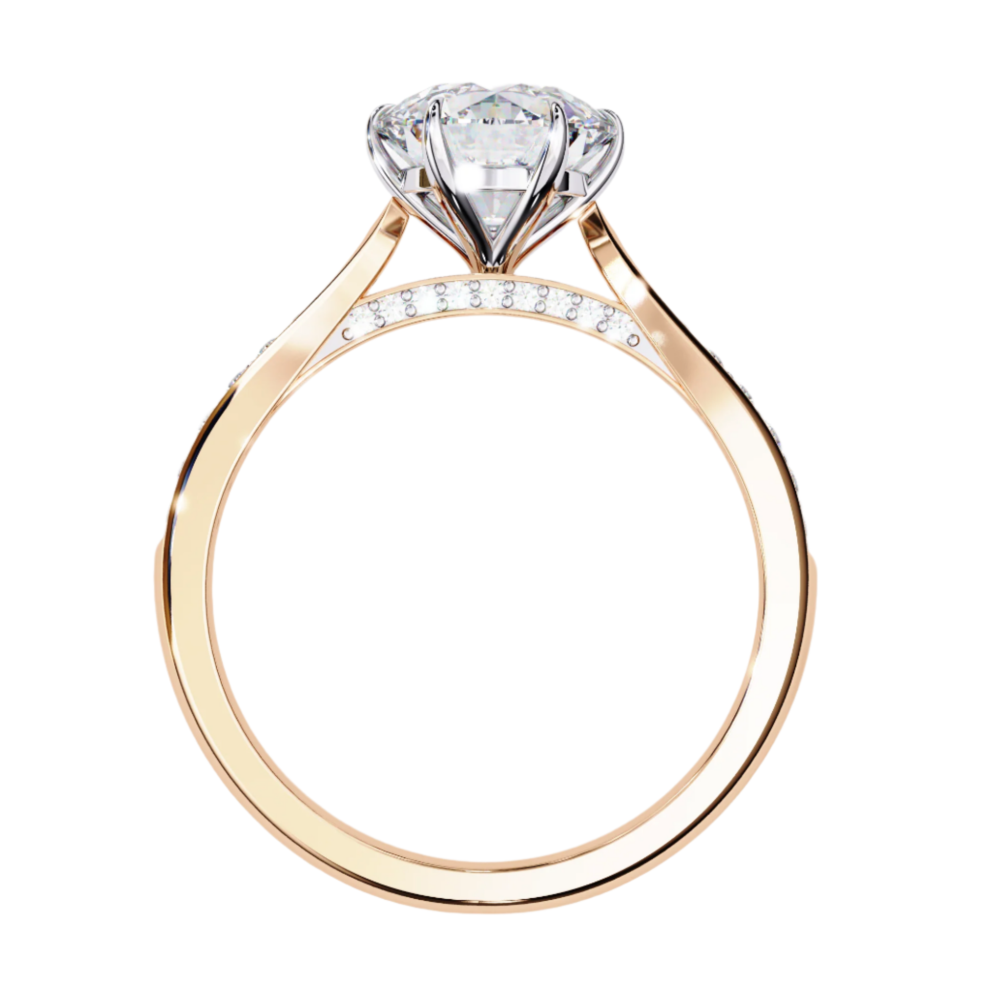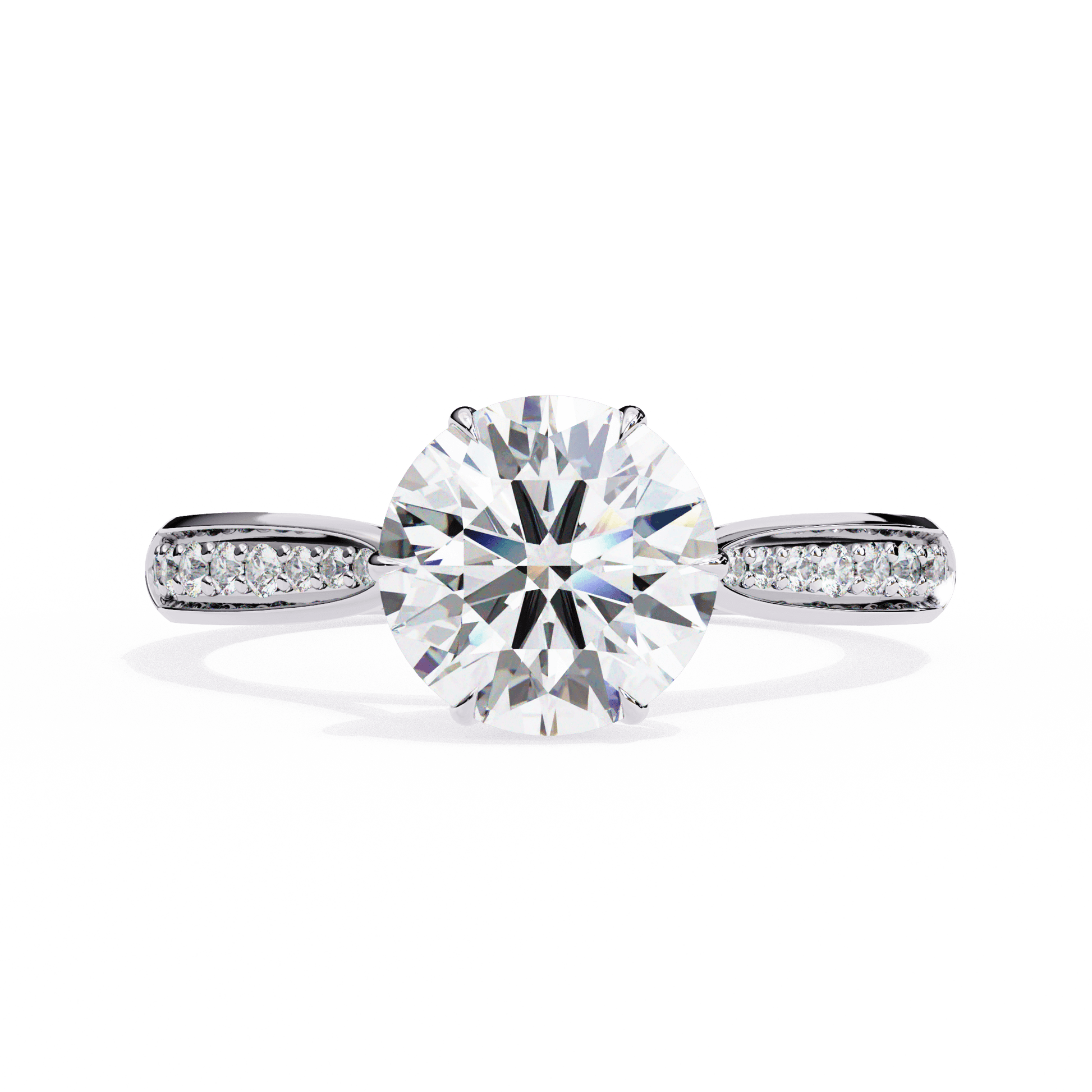 Rhiannon features a stunning Round-cut center stone set in a six-claw setting with a gallery rail. The cathedral design lifts the stone, while tapered channel-set side stones add sparkle. Diamonds along the bridge of the cathedral adds a hidden touch of brilliance.