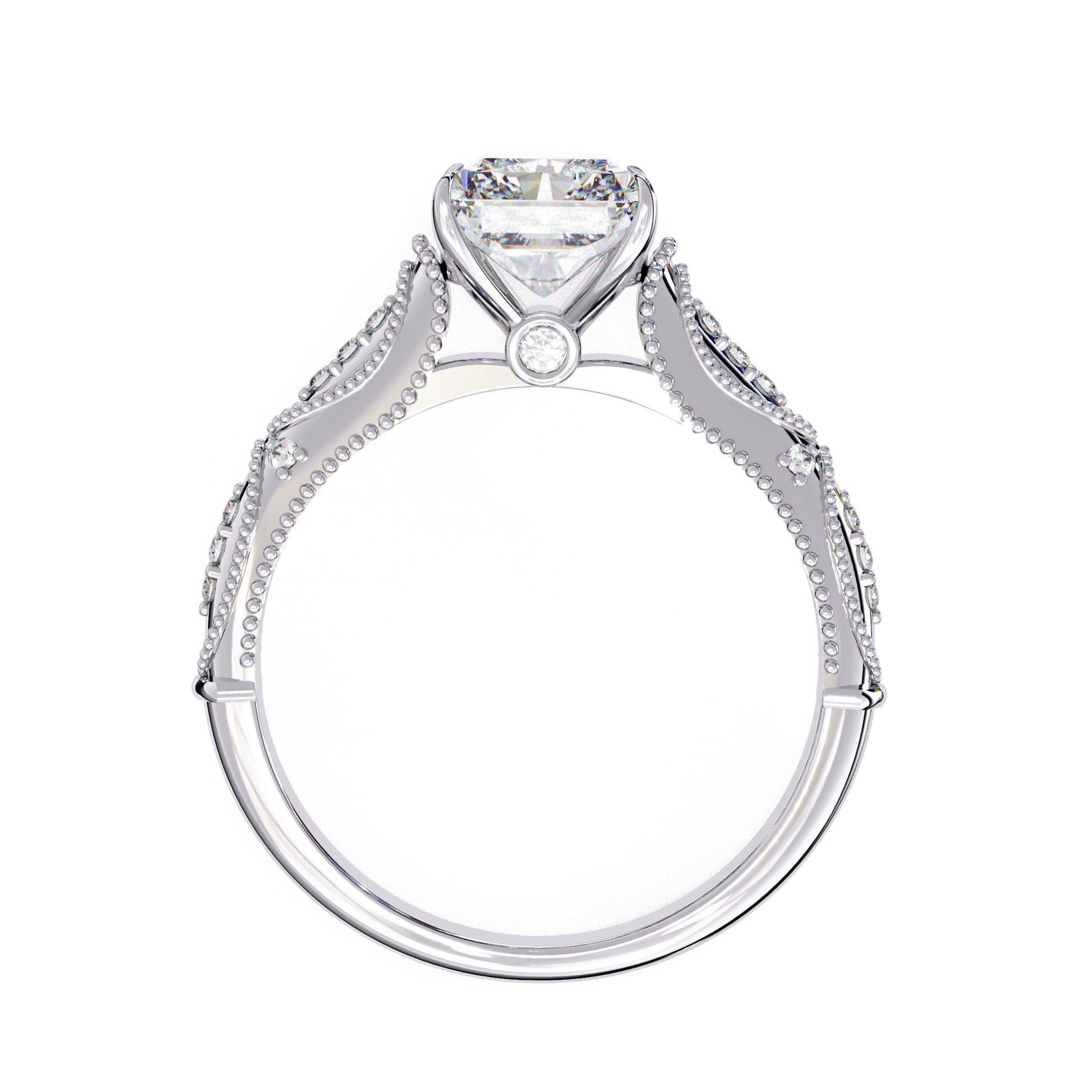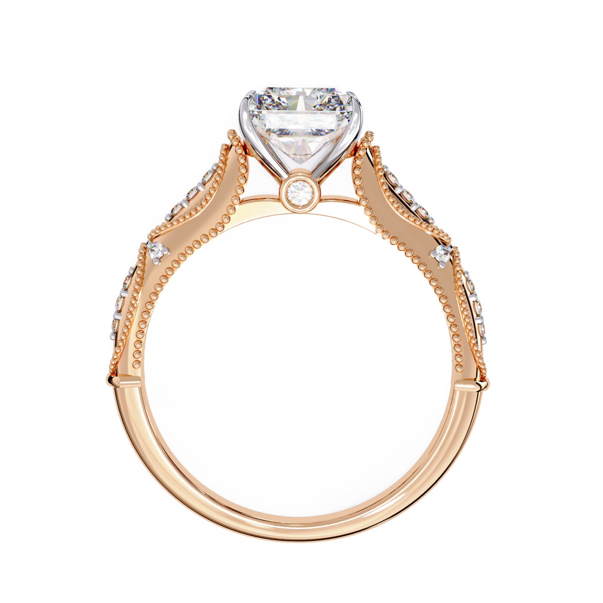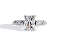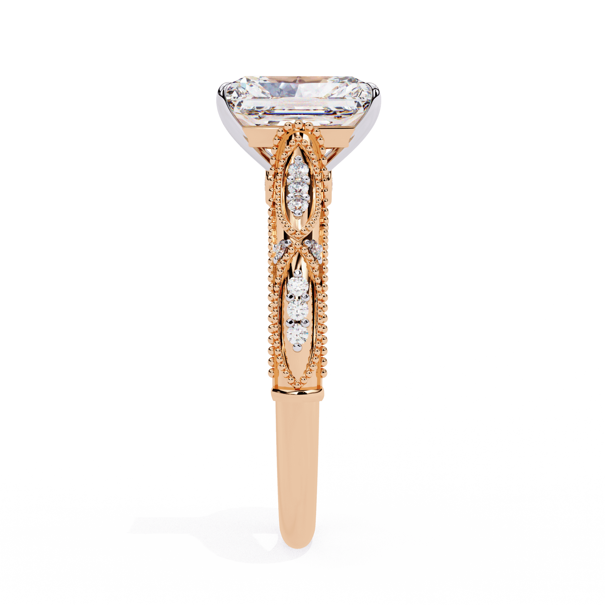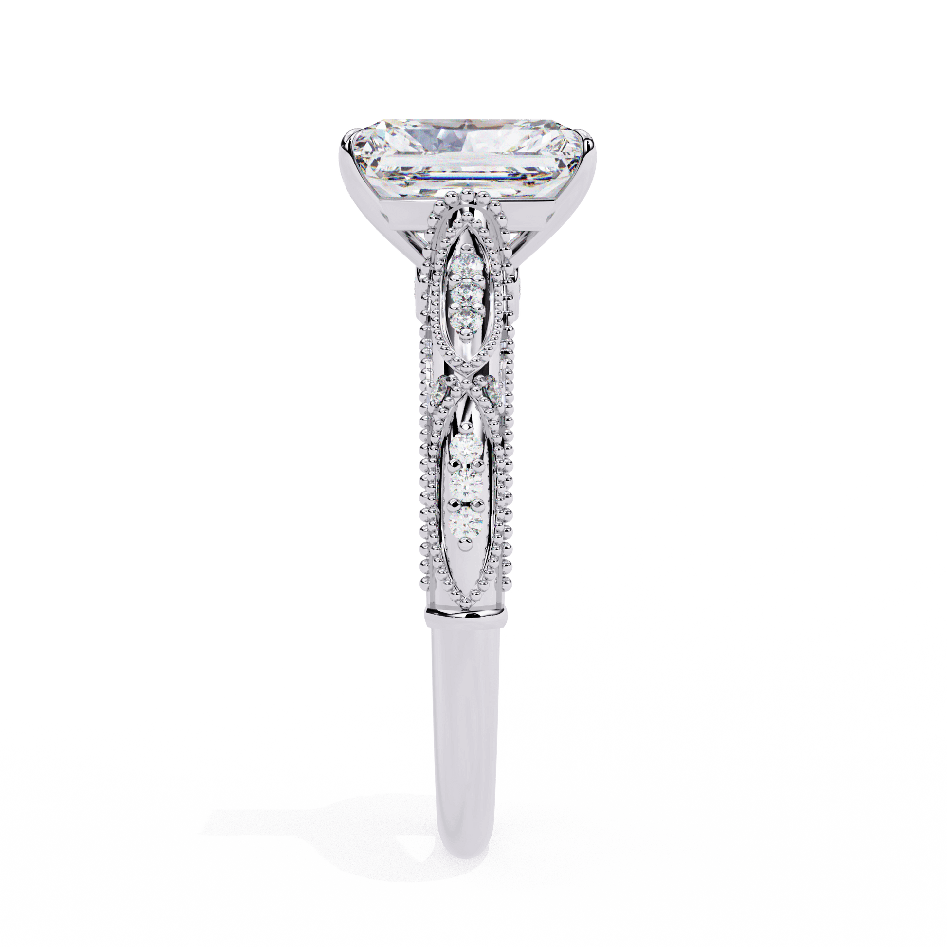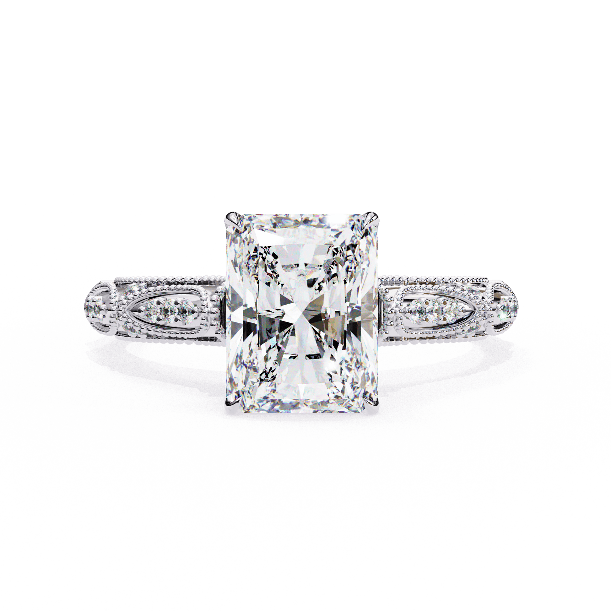 Saskia is a striking Radiant-cut diamond in a classic cathedral setting, with subtle diamond detailing. The band is adorned with diamond accents and milgrain detailing, adding a vintage, elegant touch.