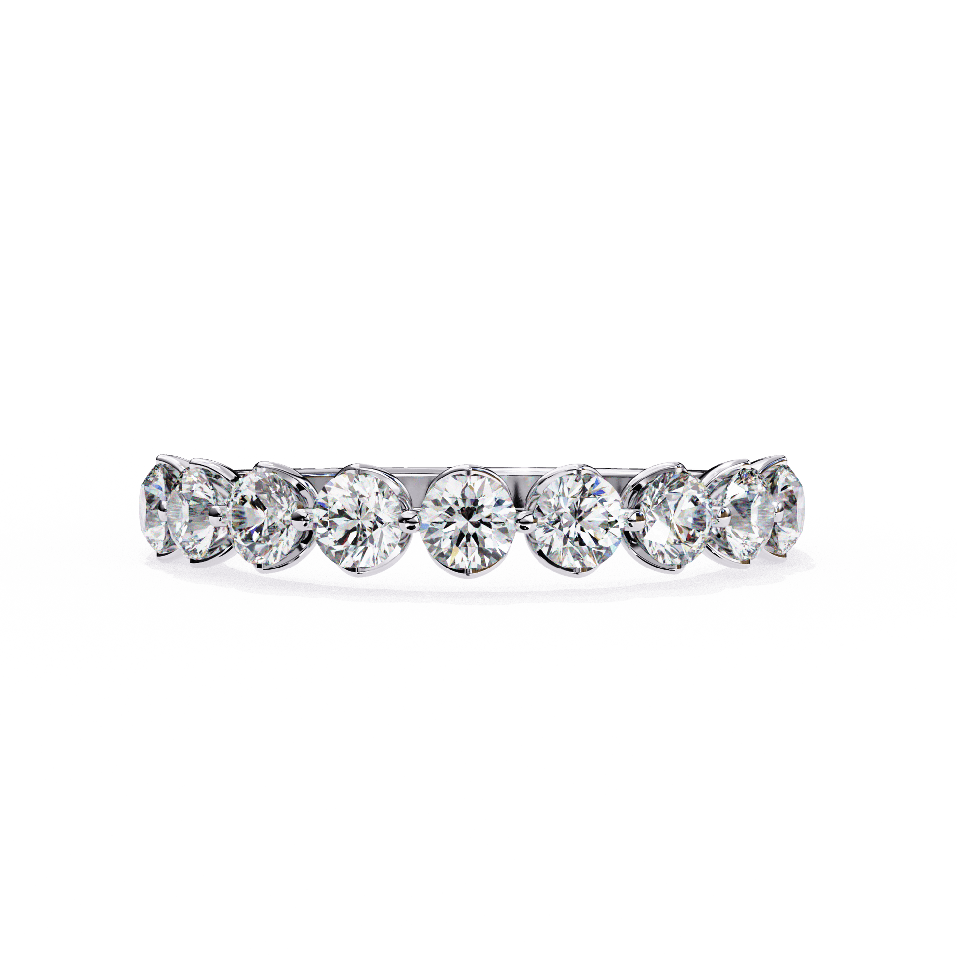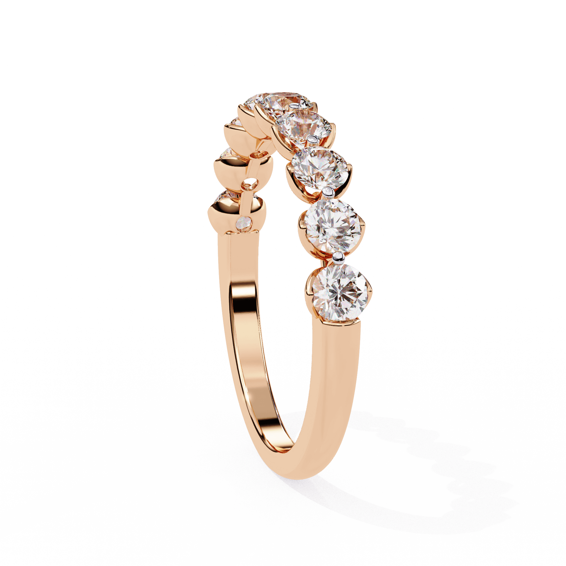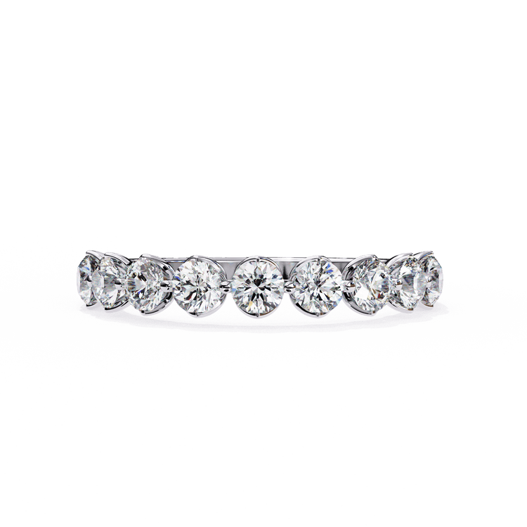 Elegant and distinctive, Simone is a shared prong diamond band featuring a delicate petal-like design that gracefully secures each diamond. This thoughtful detail enhances the brilliance of the round stones while adding a romantic, nature-inspired touch.