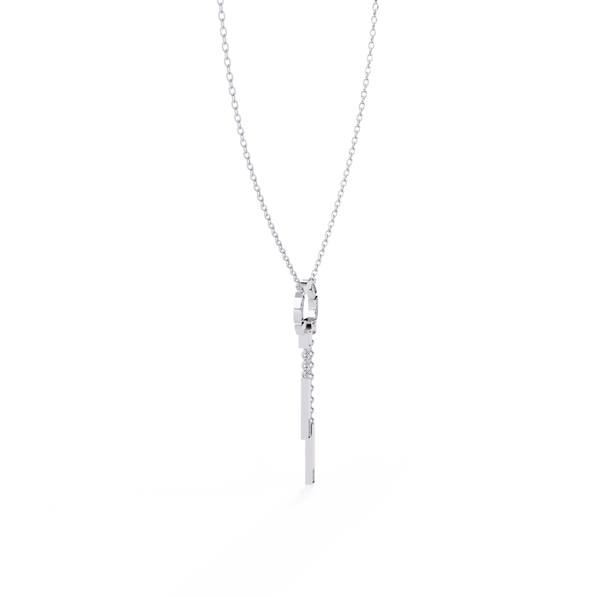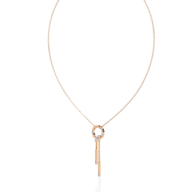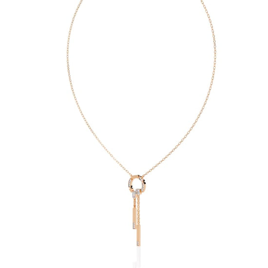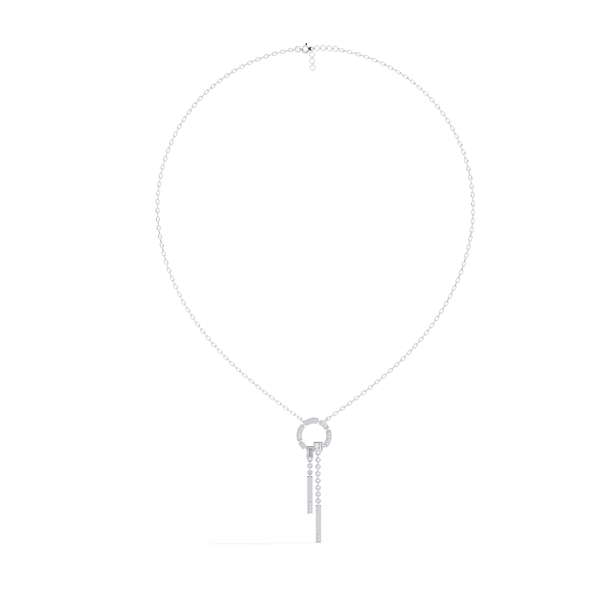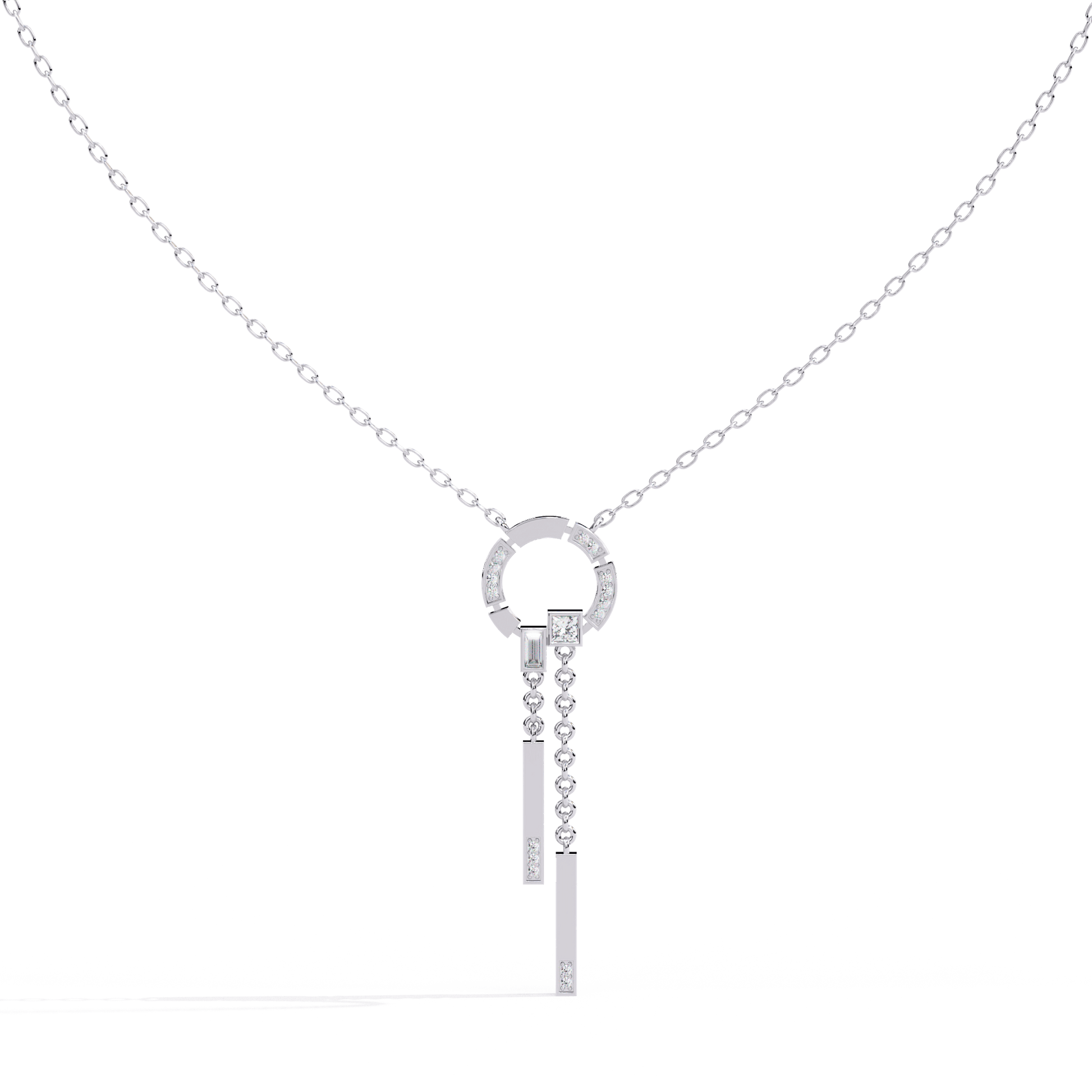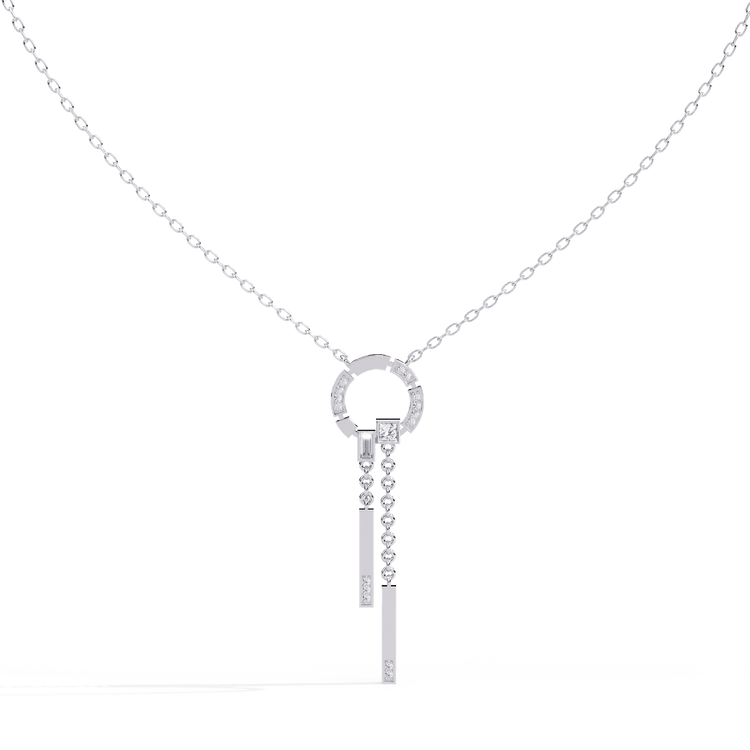 A modern interpretation of timeless elegance, the Sonia pendant captivates with its architectural design and graceful symmetry. A circular frame glistens with meticulously set round diamonds, while a princess-cut and baguette-cut diamond form the transition into two cascading diamond strands. Finished with rectangular diamond bars, this pendant evokes motion and poise.