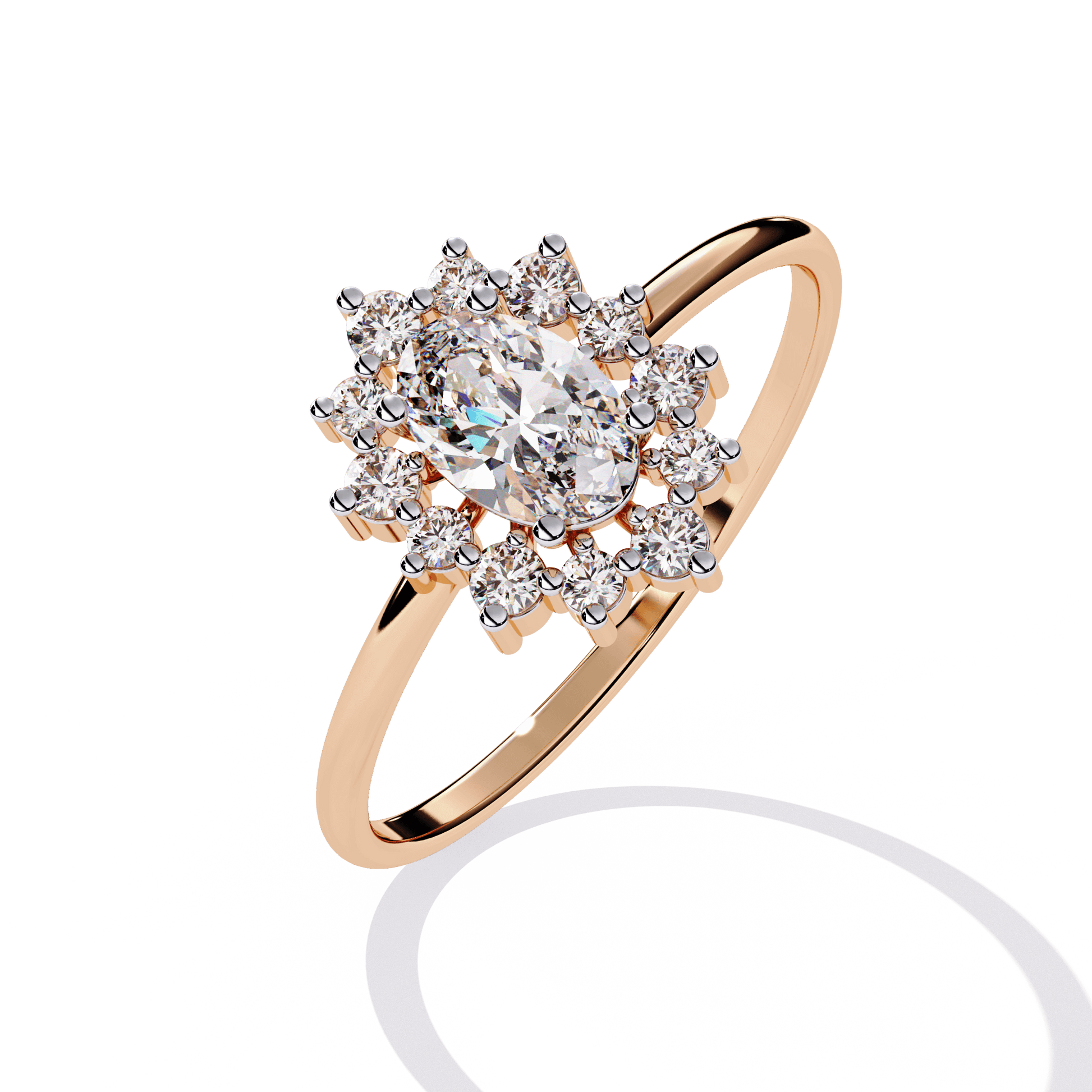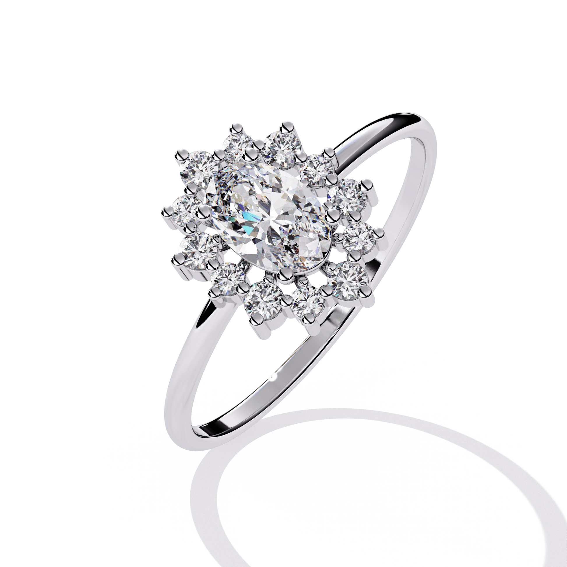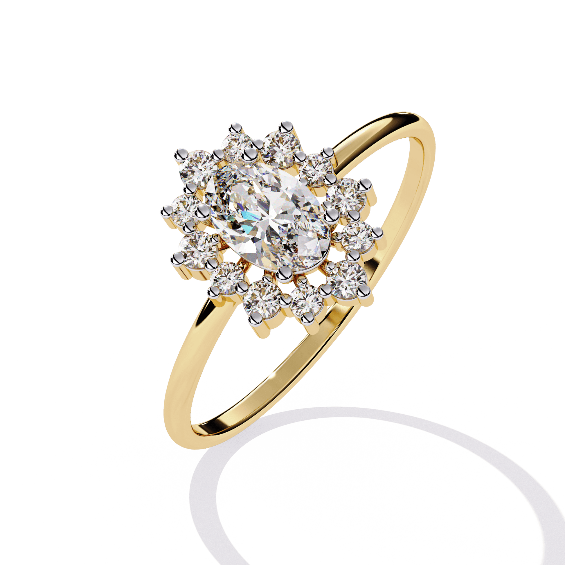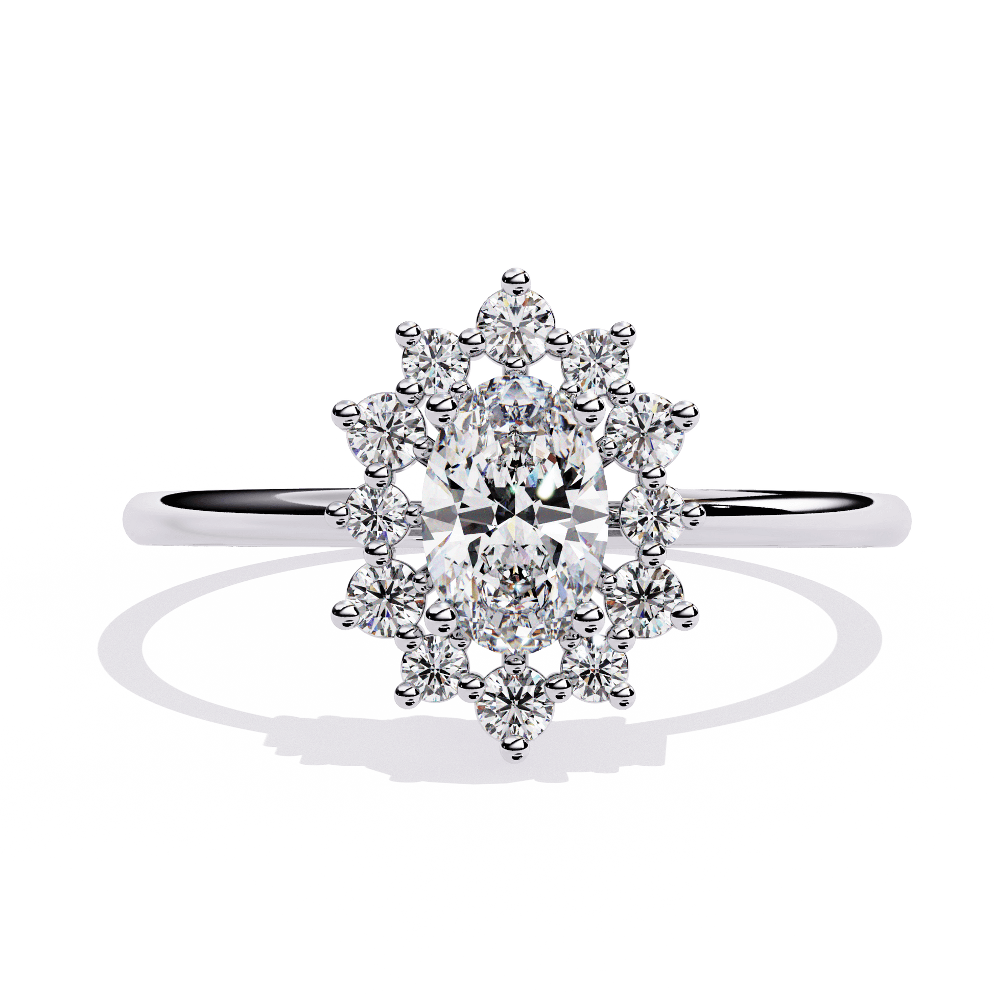 Sun radiates brilliance and warmth, just like her namesake. She features a captivating oval-cut diamond at her heart, set in a refined claw setting to maximize its fire and brilliance. Surrounding her center stone is a breathtaking halo of individually prong-set round diamonds, arranged in a starburst pattern to emulate the glowing rays of the sun.
