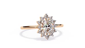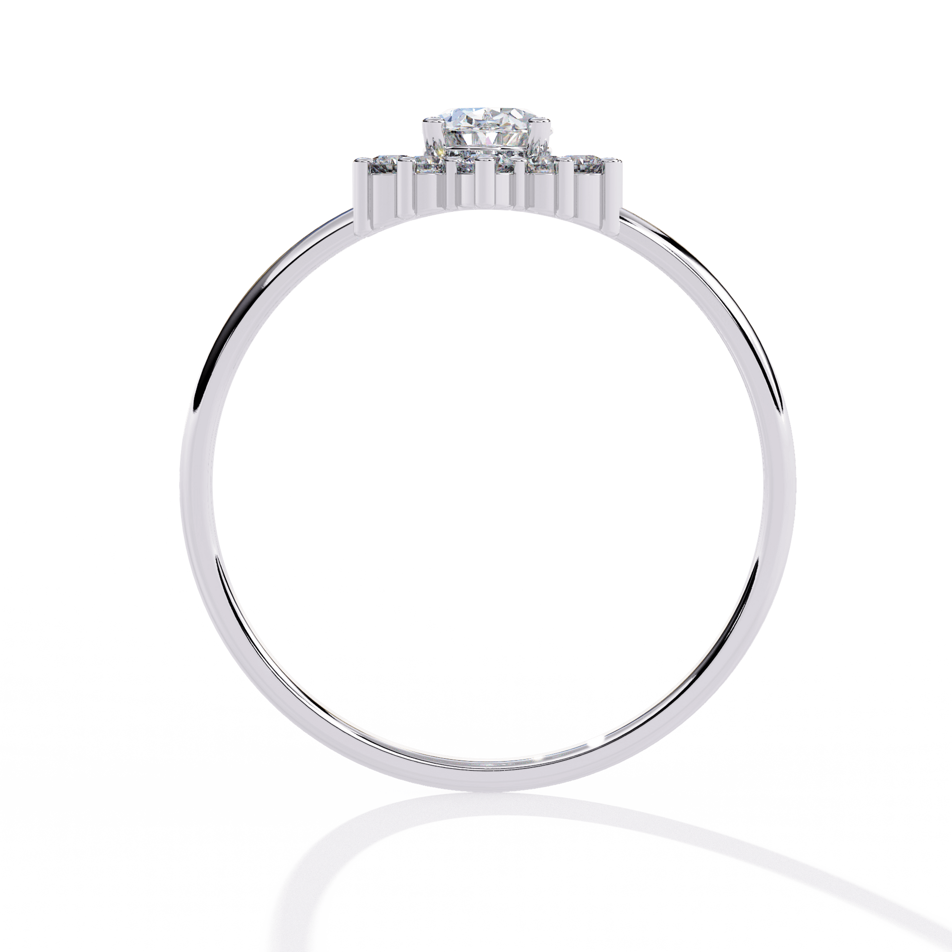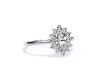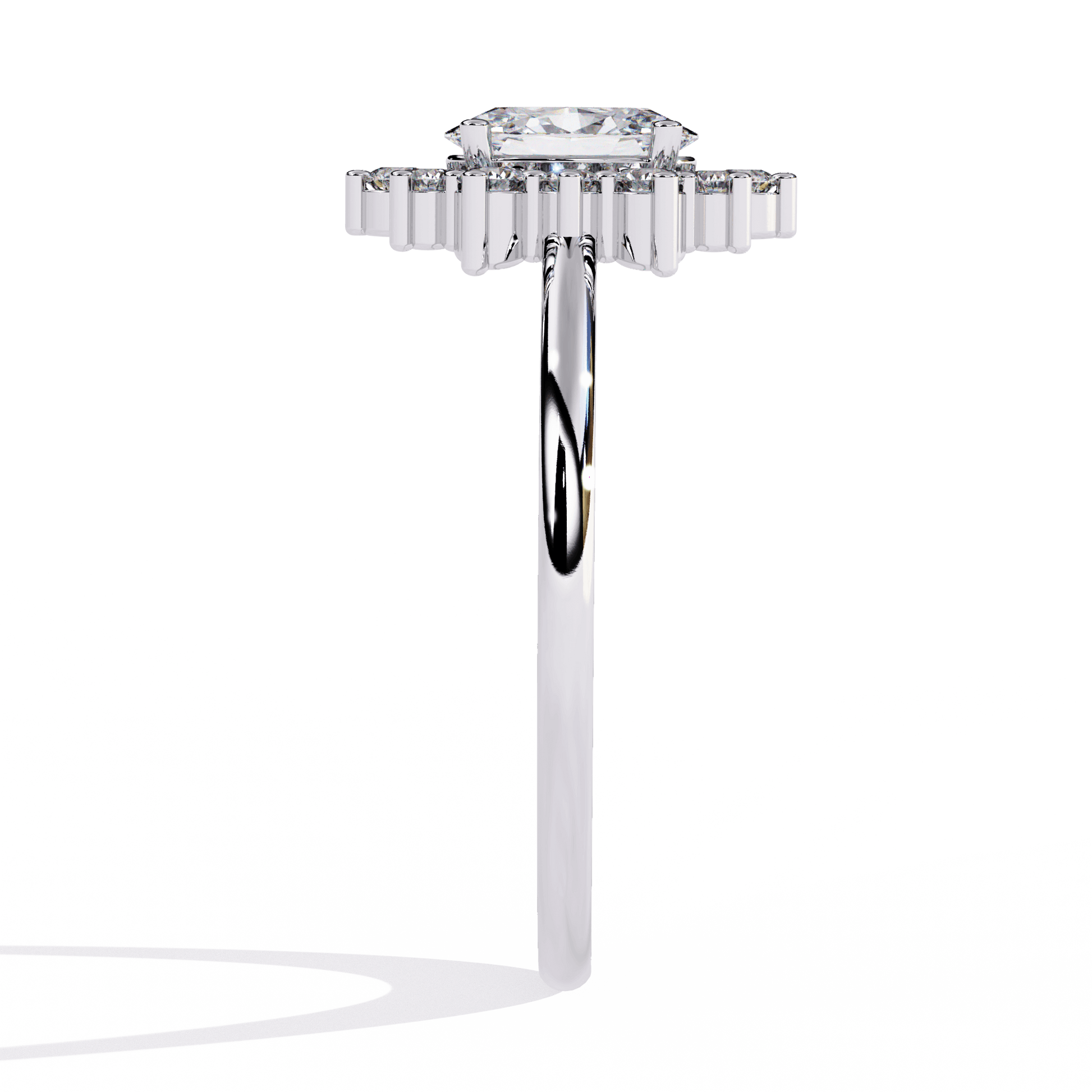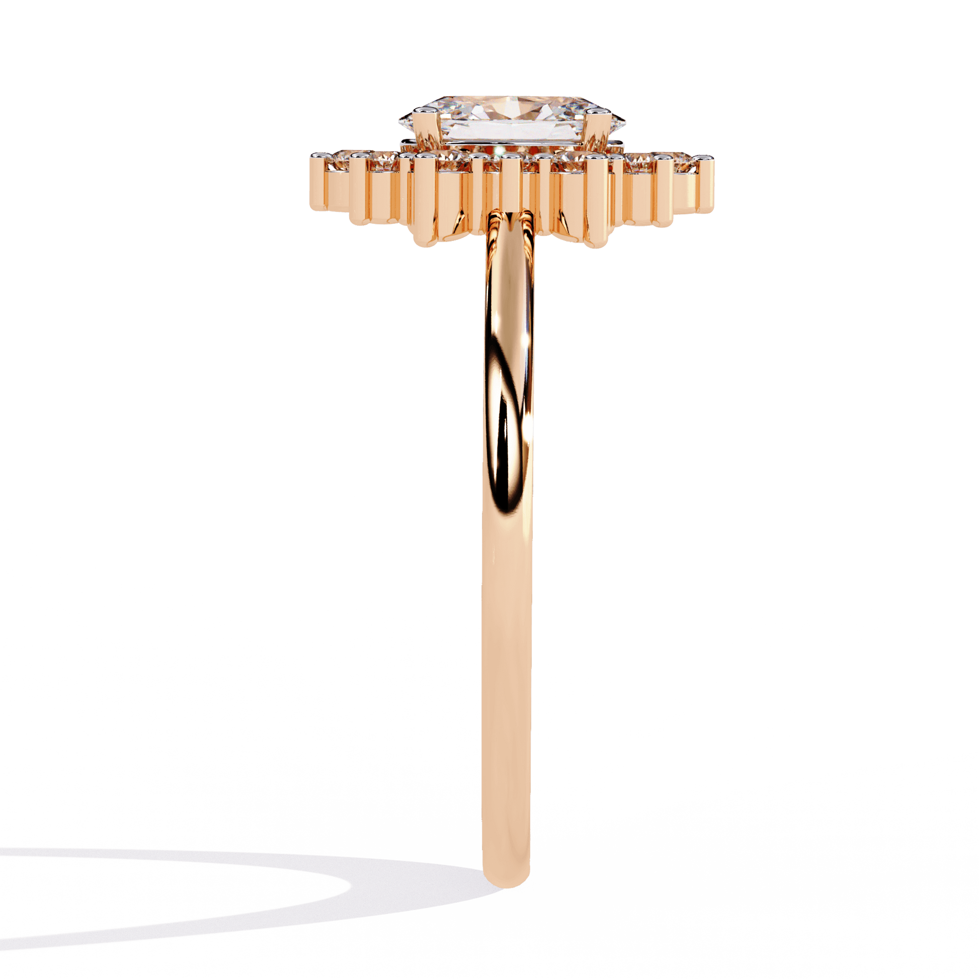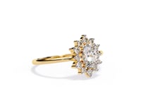 Sun radiates brilliance and warmth, just like her namesake. She features a captivating oval-cut diamond at her heart, set in a refined claw setting to maximize its fire and brilliance. Surrounding her center stone is a breathtaking halo of individually prong-set round diamonds, arranged in a starburst pattern to emulate the glowing rays of the sun.