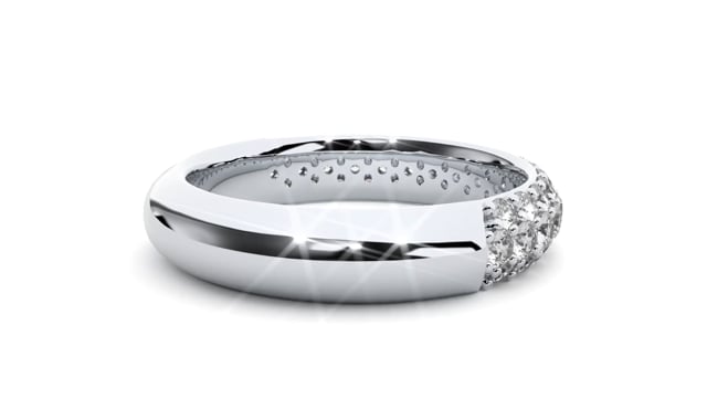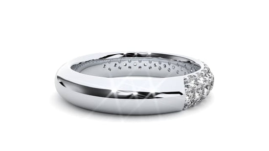 A captivating statement of brilliance, Talia showcases three rows of meticulously set pavé diamonds, spanning half the band. This design maximizes sparkle while maintaining a refined silhouette. The seamless pavé setting allows the diamonds to sit closely together, creating an endless shimmer across the band. Crafted for both elegance and comfort, Talia is the perfect complement to an engagement ring or a stunning standalone piece.