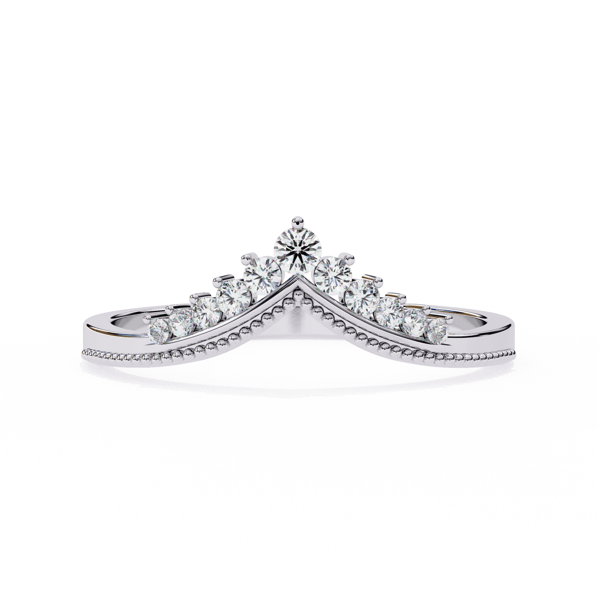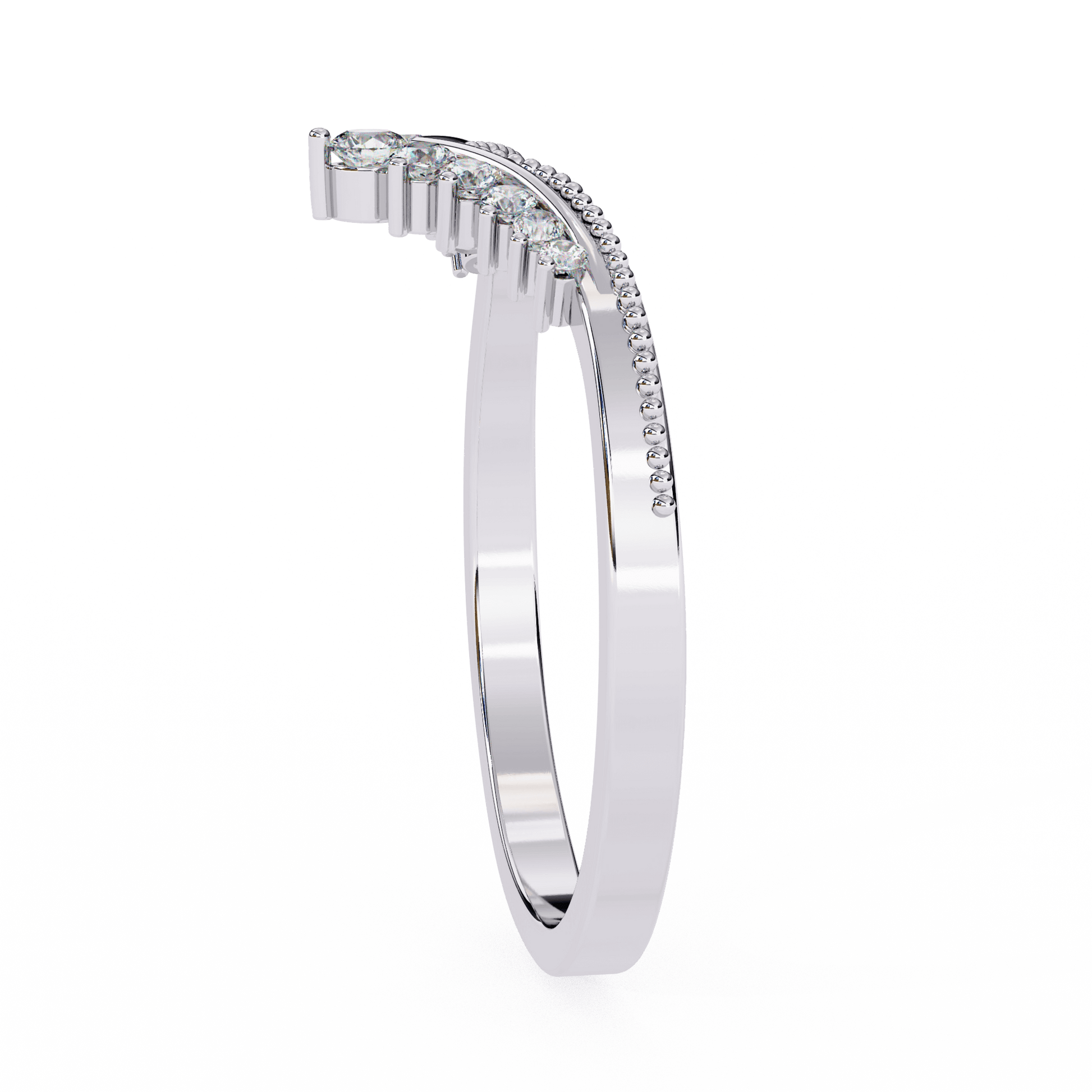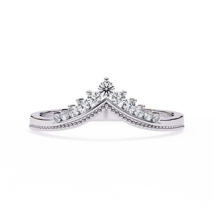 Vikki is a graceful shaped band, designed to complement your engagement ring with an elegant curve. Featuring a row of sparkling round diamonds that graduate toward the center, this band is accentuated with delicate milgrain detailing along its contours.