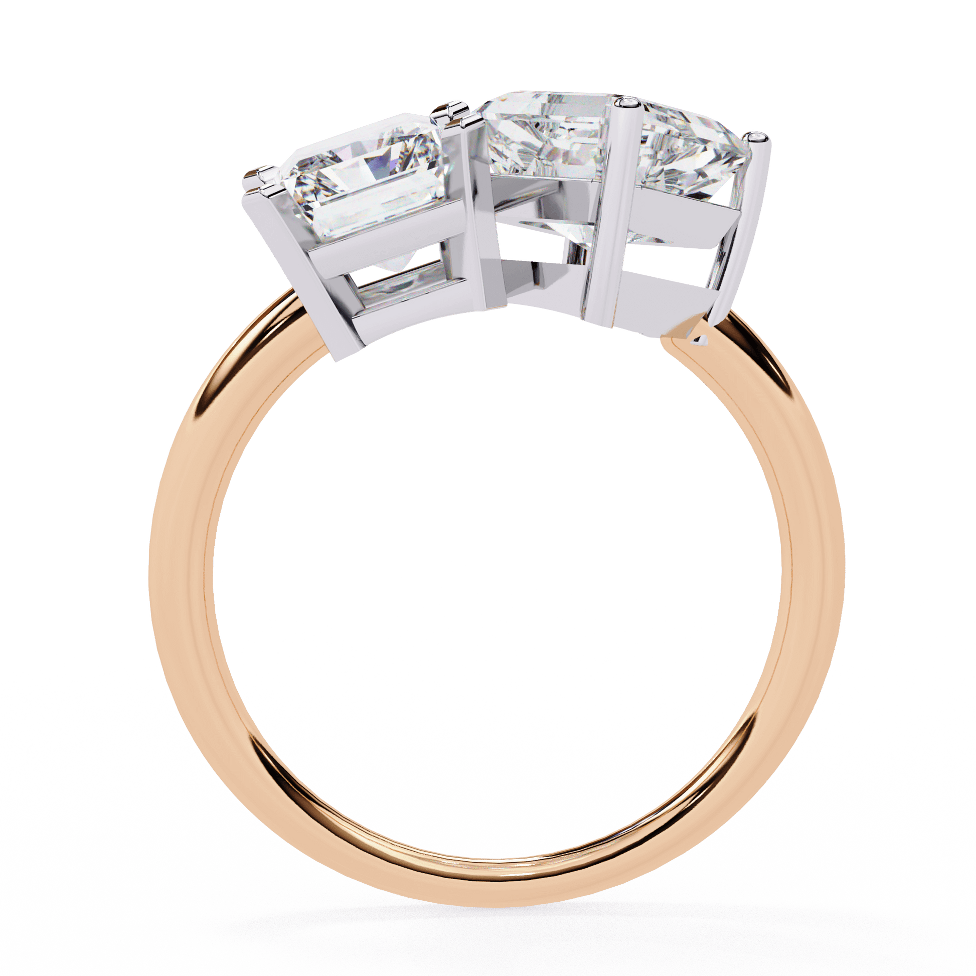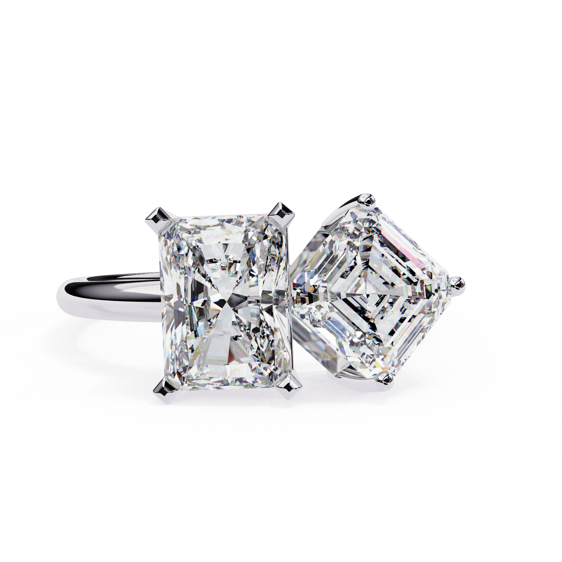 Willow is a captivating Toi et Moi ring that intertwines bold elegance with modern charm. She features a radiant-cut diamond set traditionally, while a square-cut emerald is placed diagonally, creating a striking contrast of shape and brilliance.