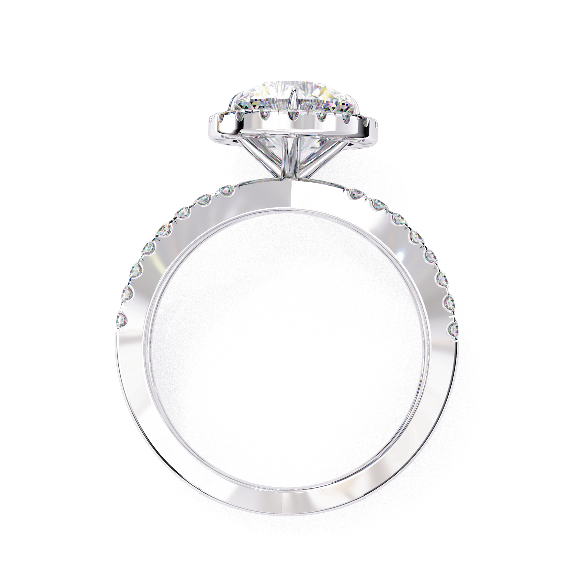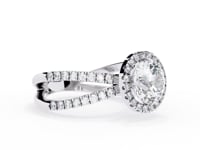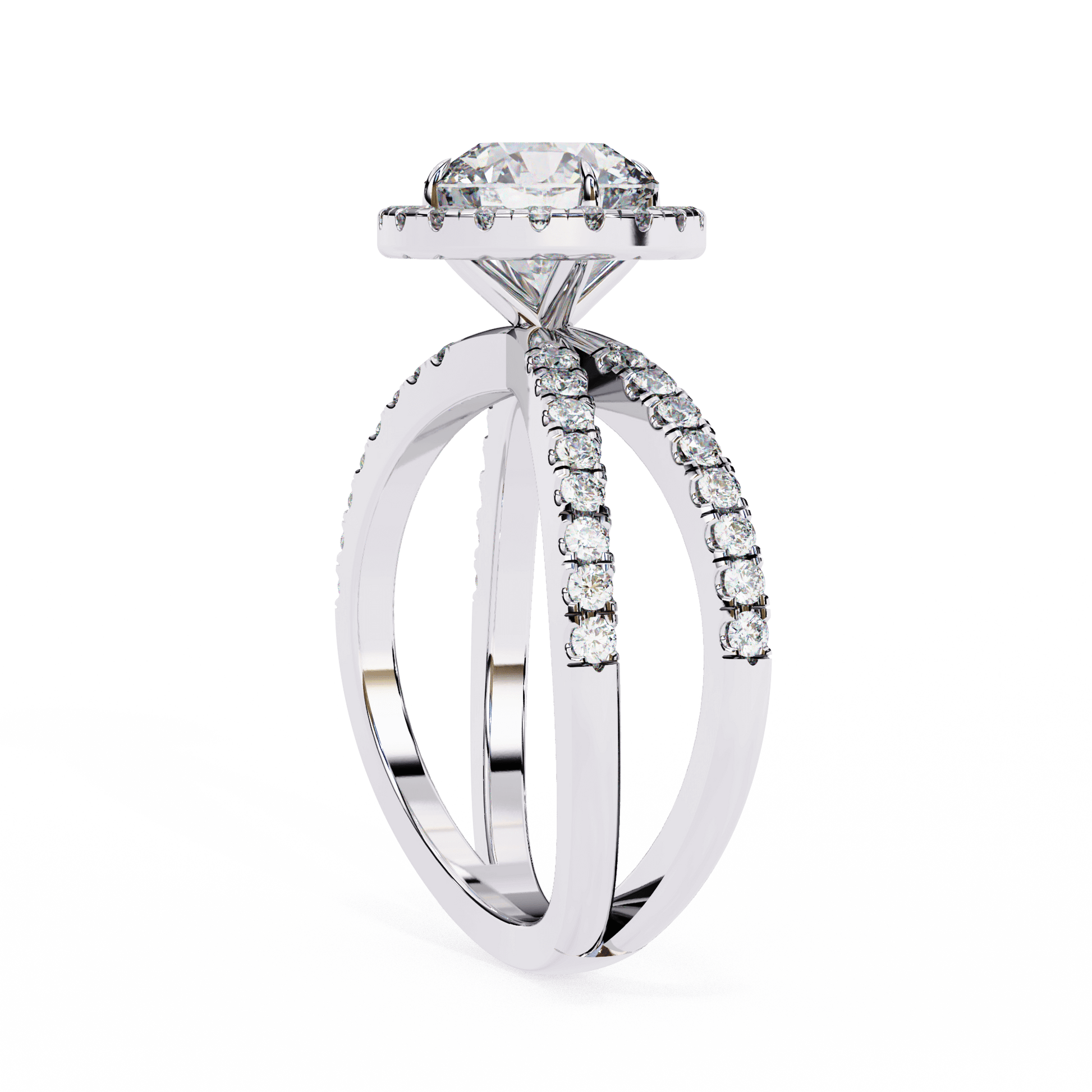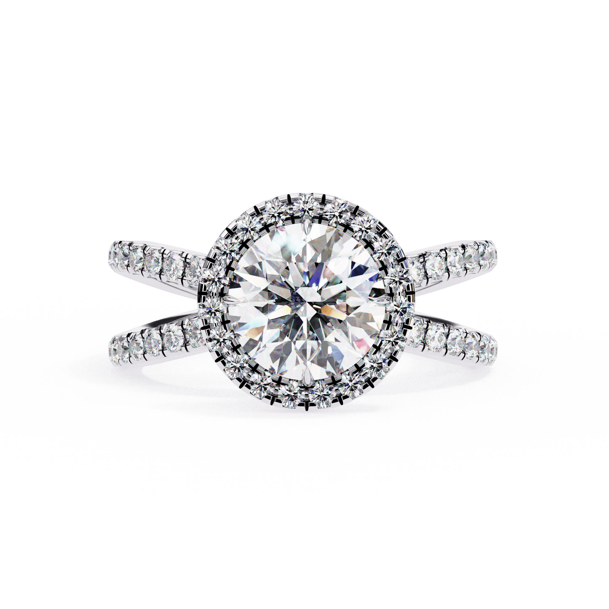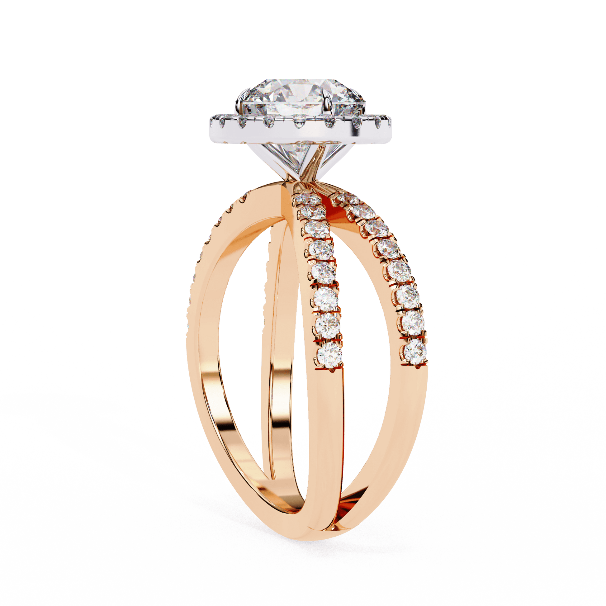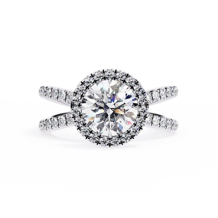 Zara features a captivating Round-cut center stone, set atop a split shank with delicate half pavé detailing and a halo for added brilliance. The open band design enhances light flow, creating an airy, luminous effect while maintaining a refined balance of modern elegance and enduring beauty.