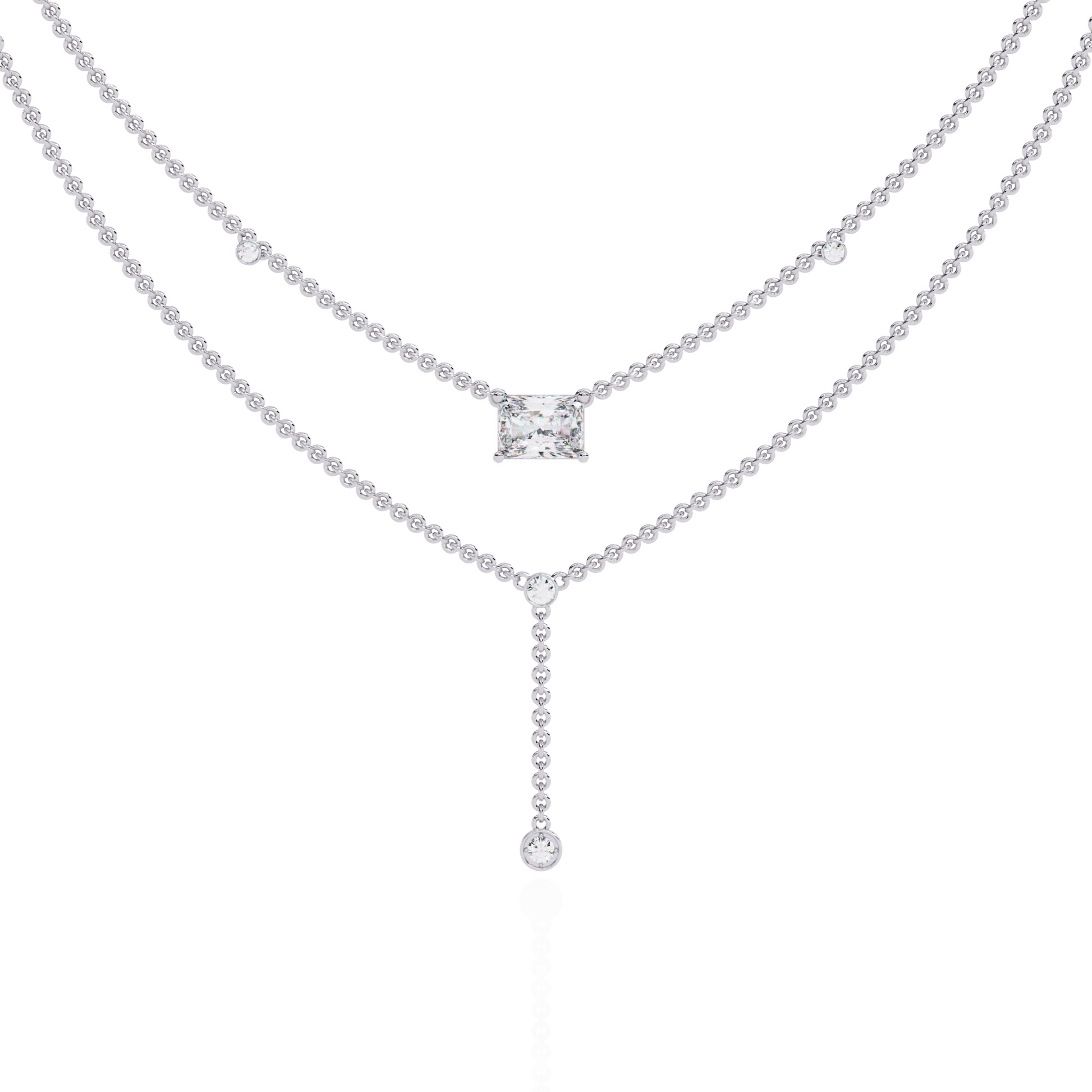 – Radiant-cut solitaire on the top chain with bezel-set accents