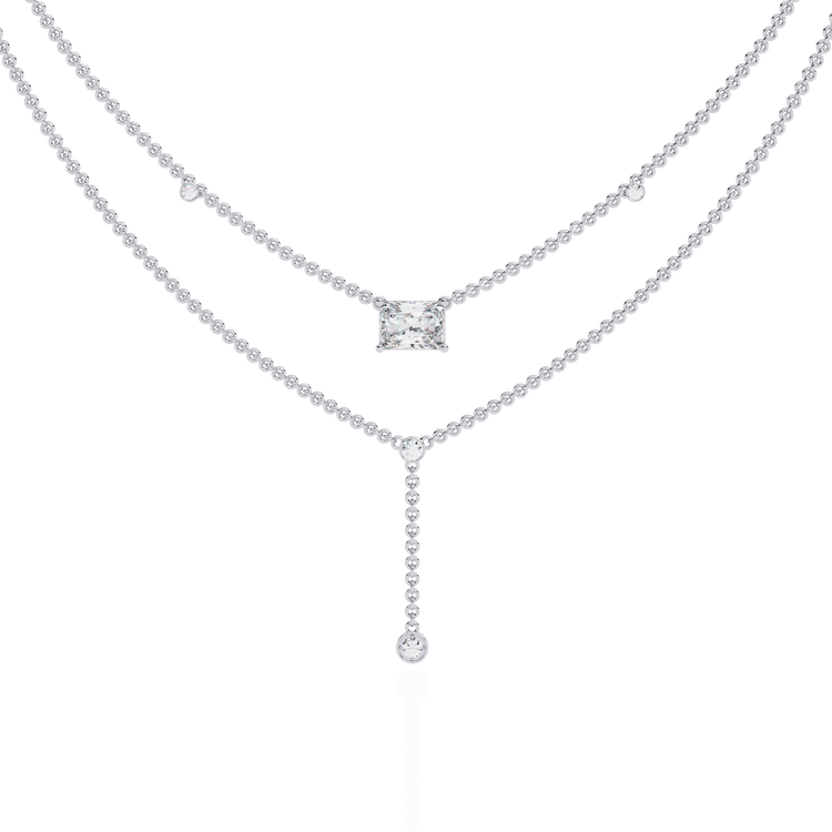 Zena is where refinement meets quiet glamour. This double-layered necklace begins with a radiant-cut solitaire, its brilliance framed by bezel-set round diamonds on either side—delicate yet striking. The lower layer continues the narrative with a fine line of bezel-set accents leading to a single drop detail, creating movement, depth, and effortless sophistication. A contemporary heirloom designed to elevate every day.